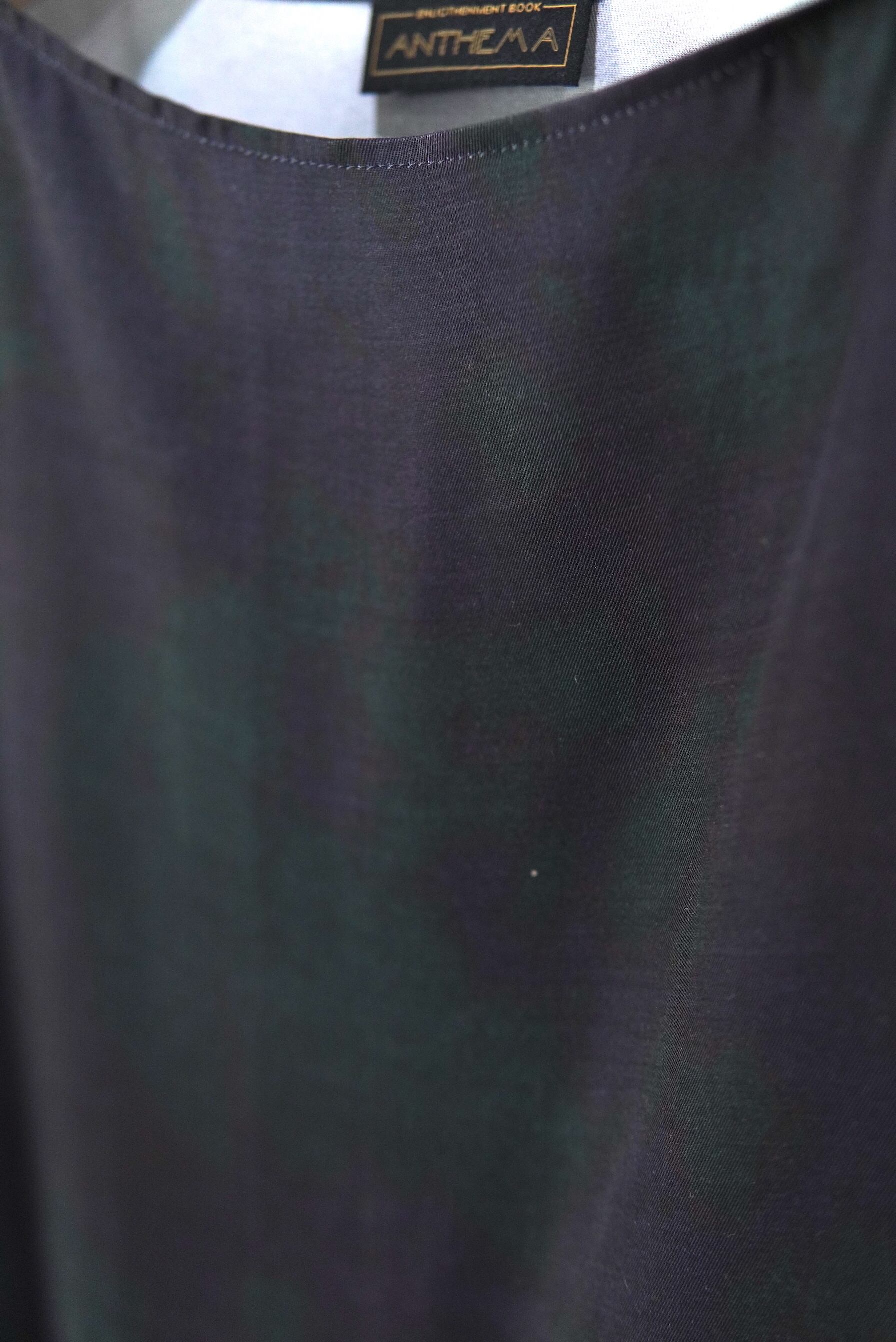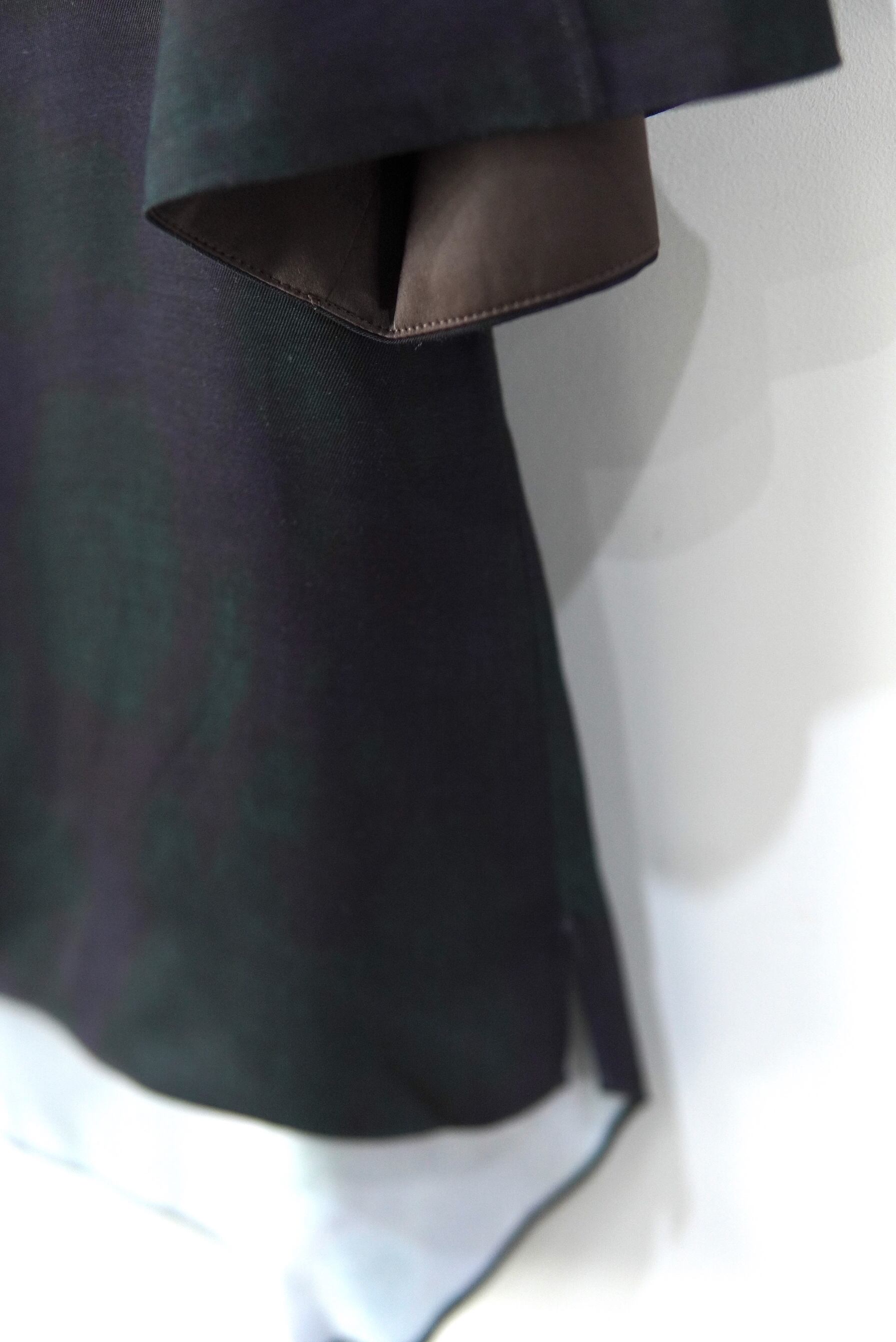 ボートネックシャープな首元、立体的な少し丸みのあるフォルムの袖と袖口から覗く配色サテンが特徴です。裾は、