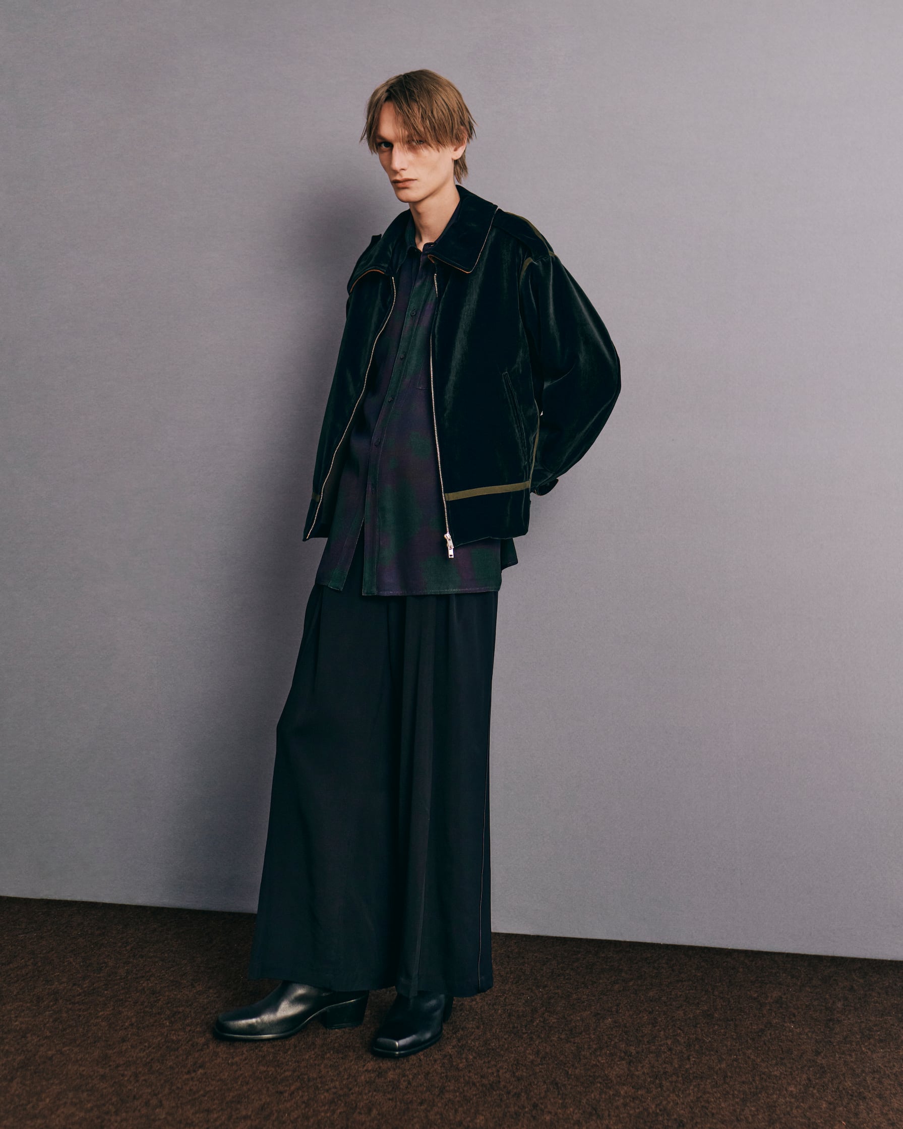 シルエットはたっぷりとしたフレアながら、着用す ると素材のドレープ性ですっきりと縦長に見えるラ インになっています。