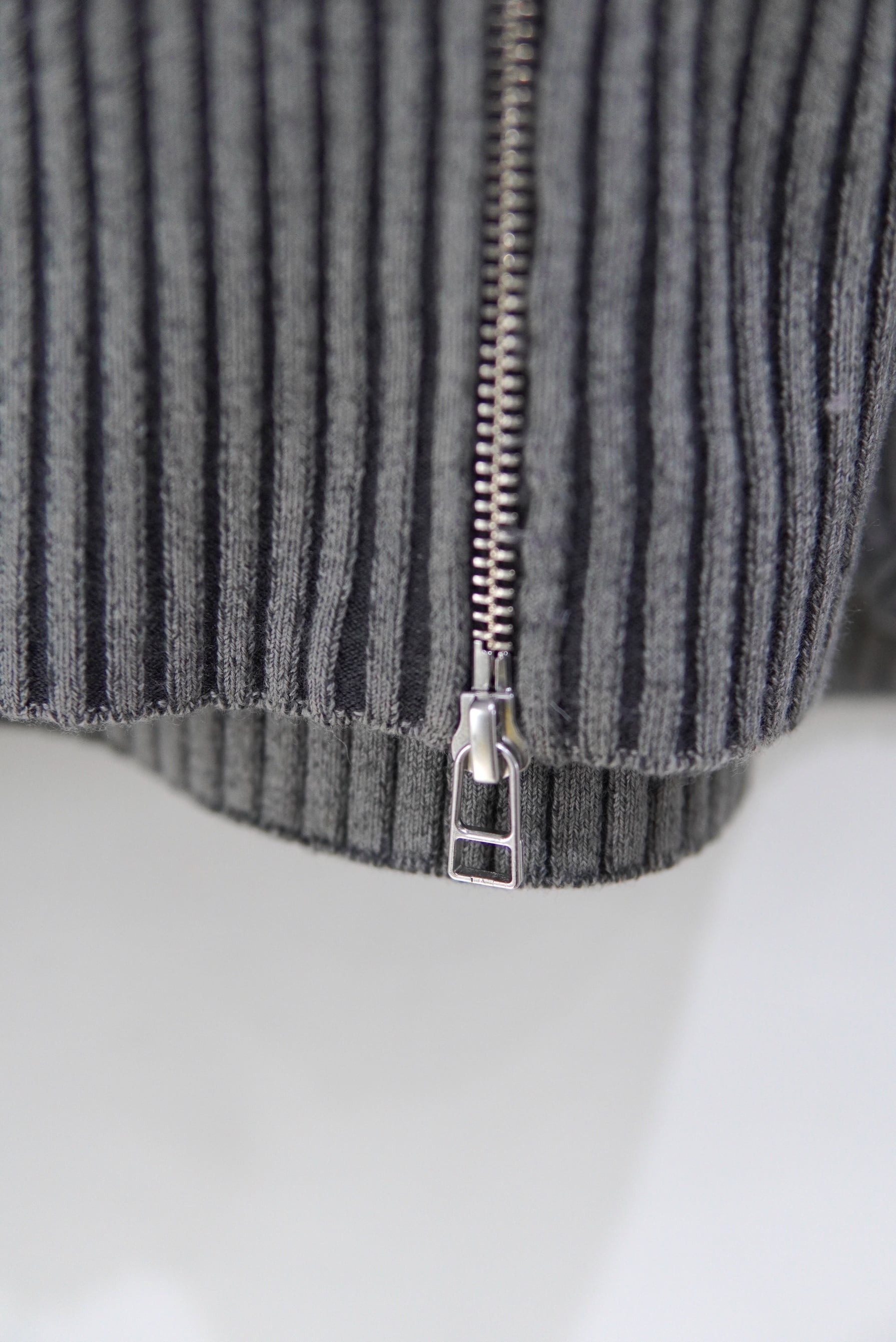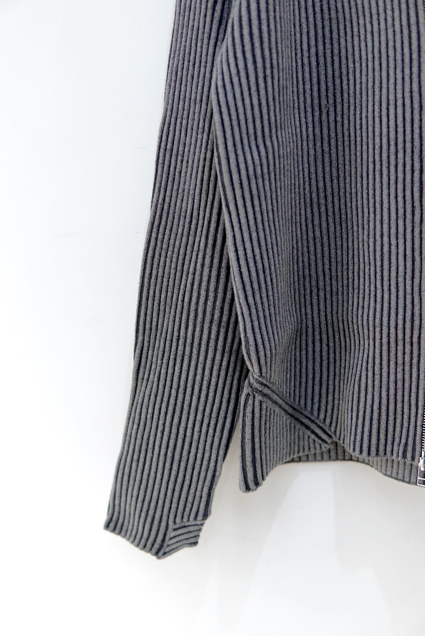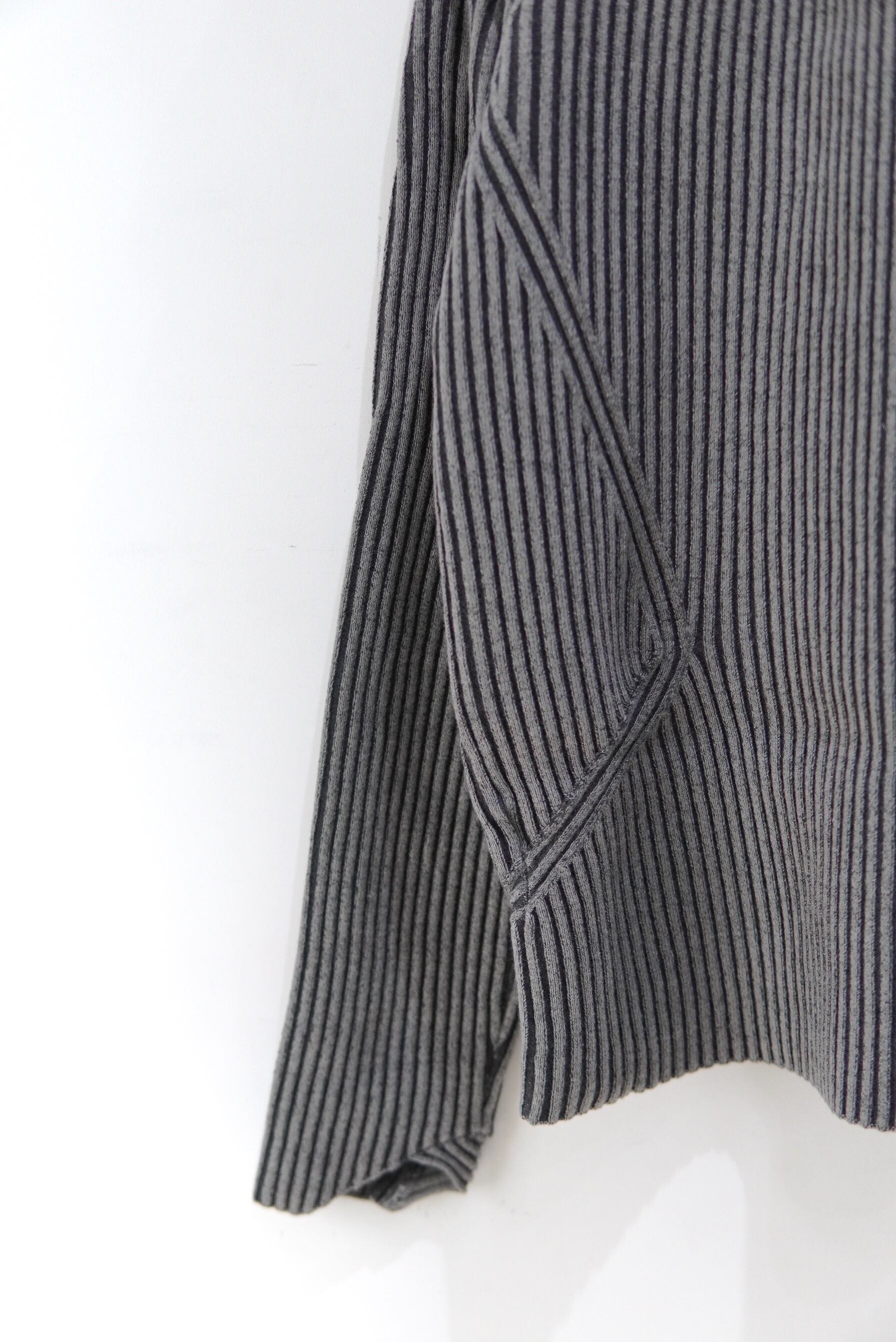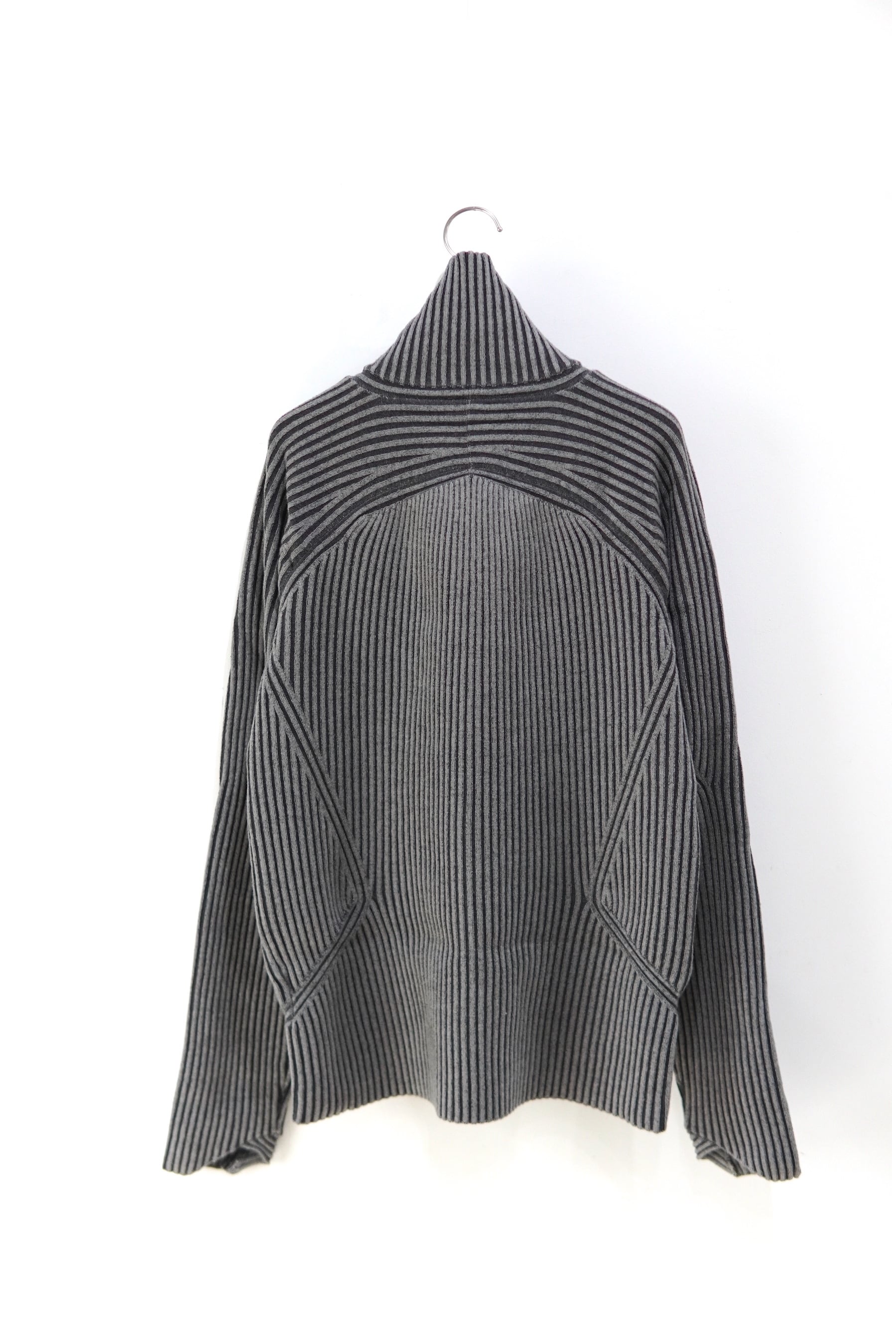 メリノウールで作られ、リブ編みのピッチの高さを変えることで起伏のあるテクスチャーを強調しています。リラックスしたボクシーシルエットでデザイン されており、リブ編みの方向を変えることでリズムとテクスチャーを生み出すディテールが特徴です。