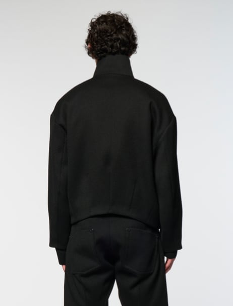 このミニマルなスタンドカラーブルゾンは、オマールアフリディのメンズウェアにおける素材とシルエットの重要性を体現しています