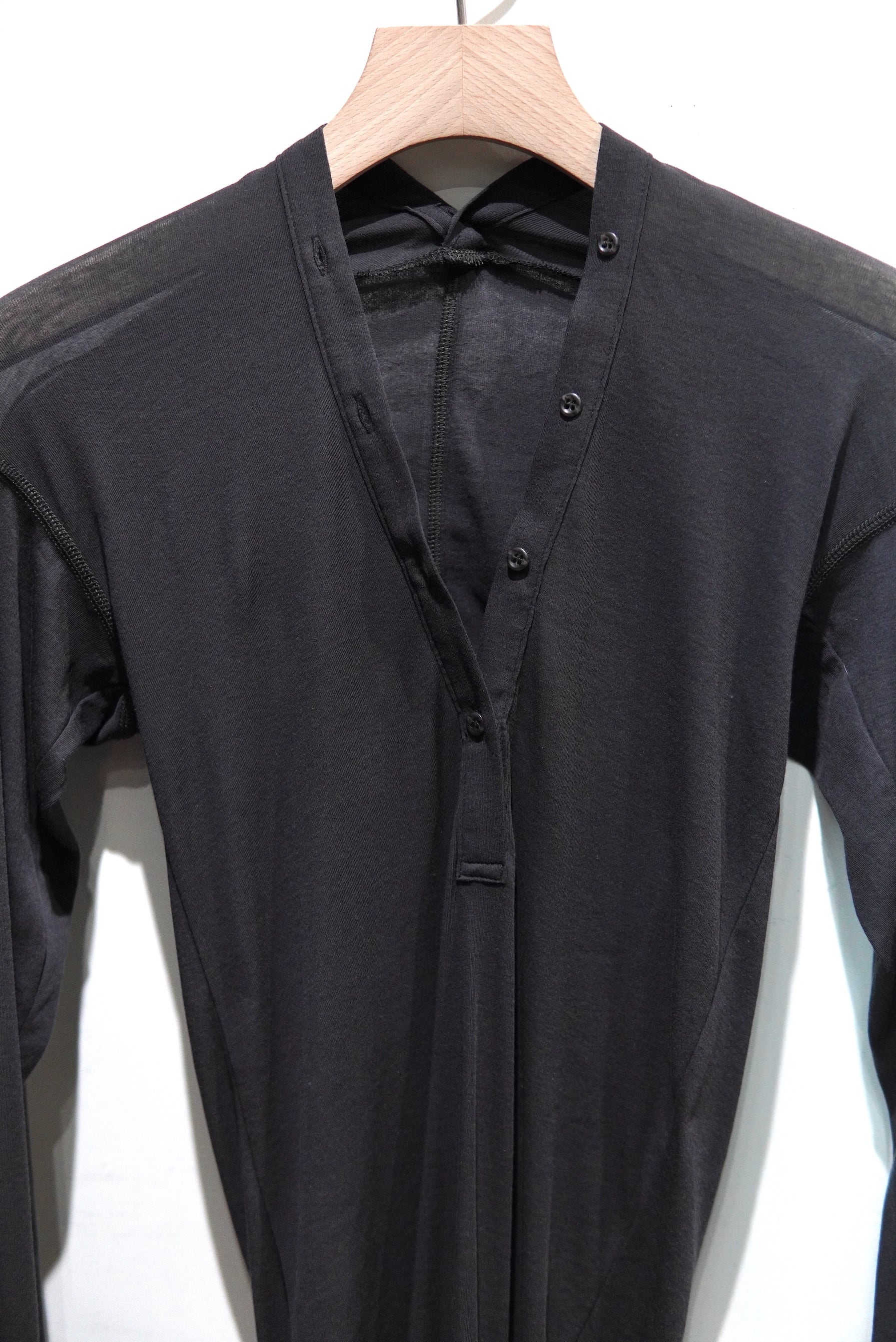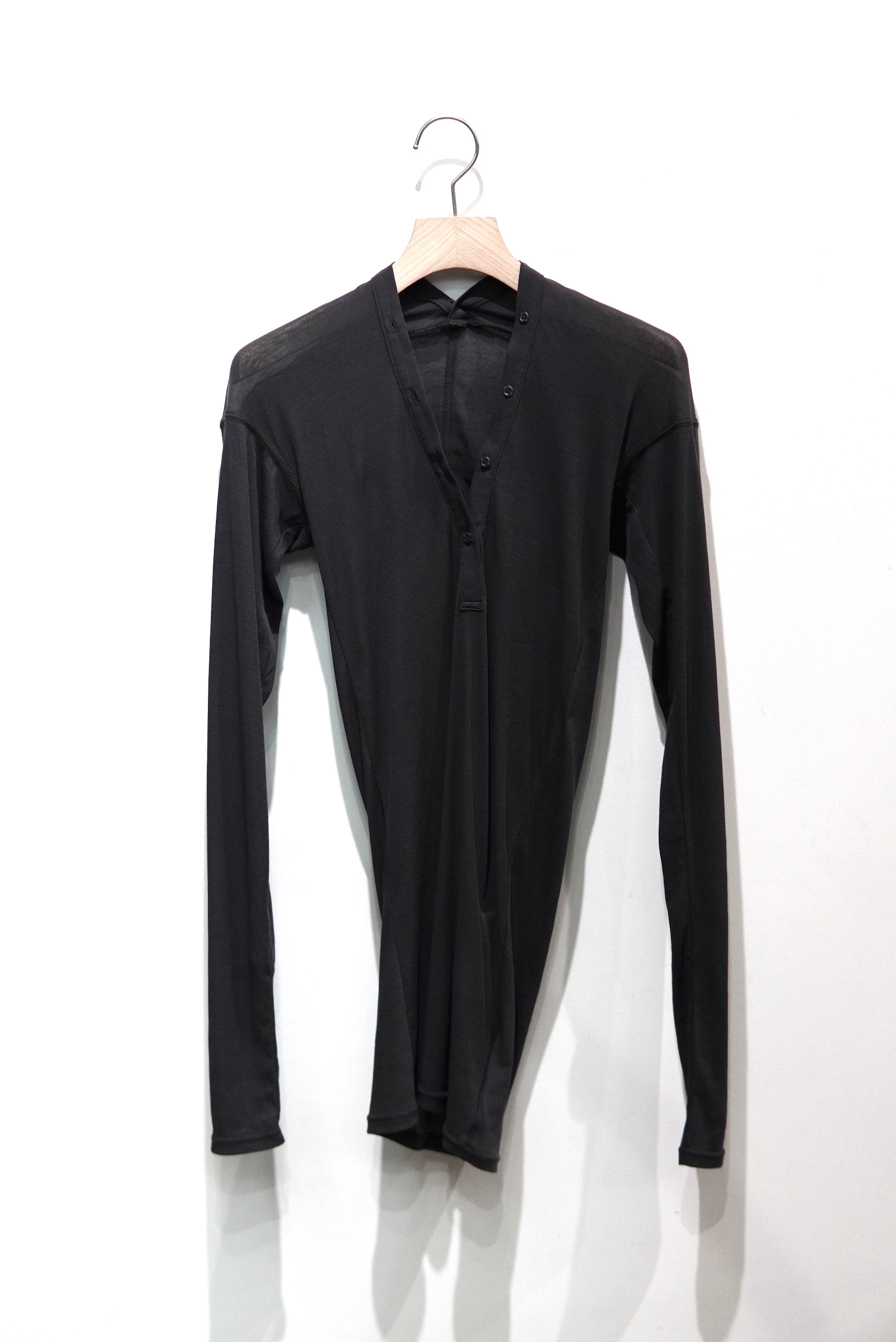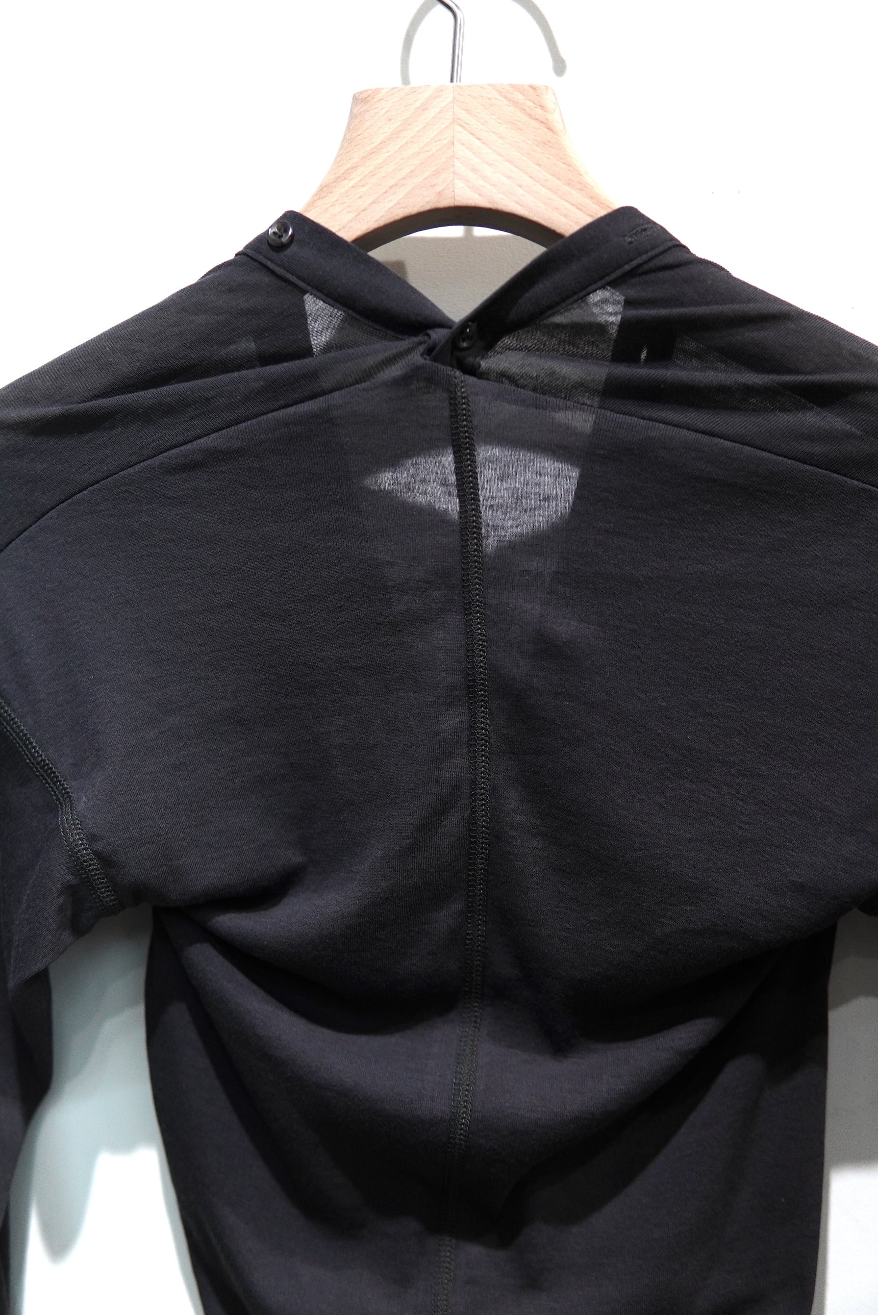 極細番手の強撚糸を使用したシアーフライスのトップス。 見頃を湾曲させている事で生まれる自然なドレープ感とユニークなヘンリーネックデザインが特徴。 上品な透け感と適度な伸縮性のある着心地の良い一枚。 マテリアル Cotton 100% サイズスペック SIZE FREE 肩幅/ 33㎝〜 身幅/ 28㎝〜 着丈/ 68㎝(右)73cm(左) 袖丈/ 62㎝
