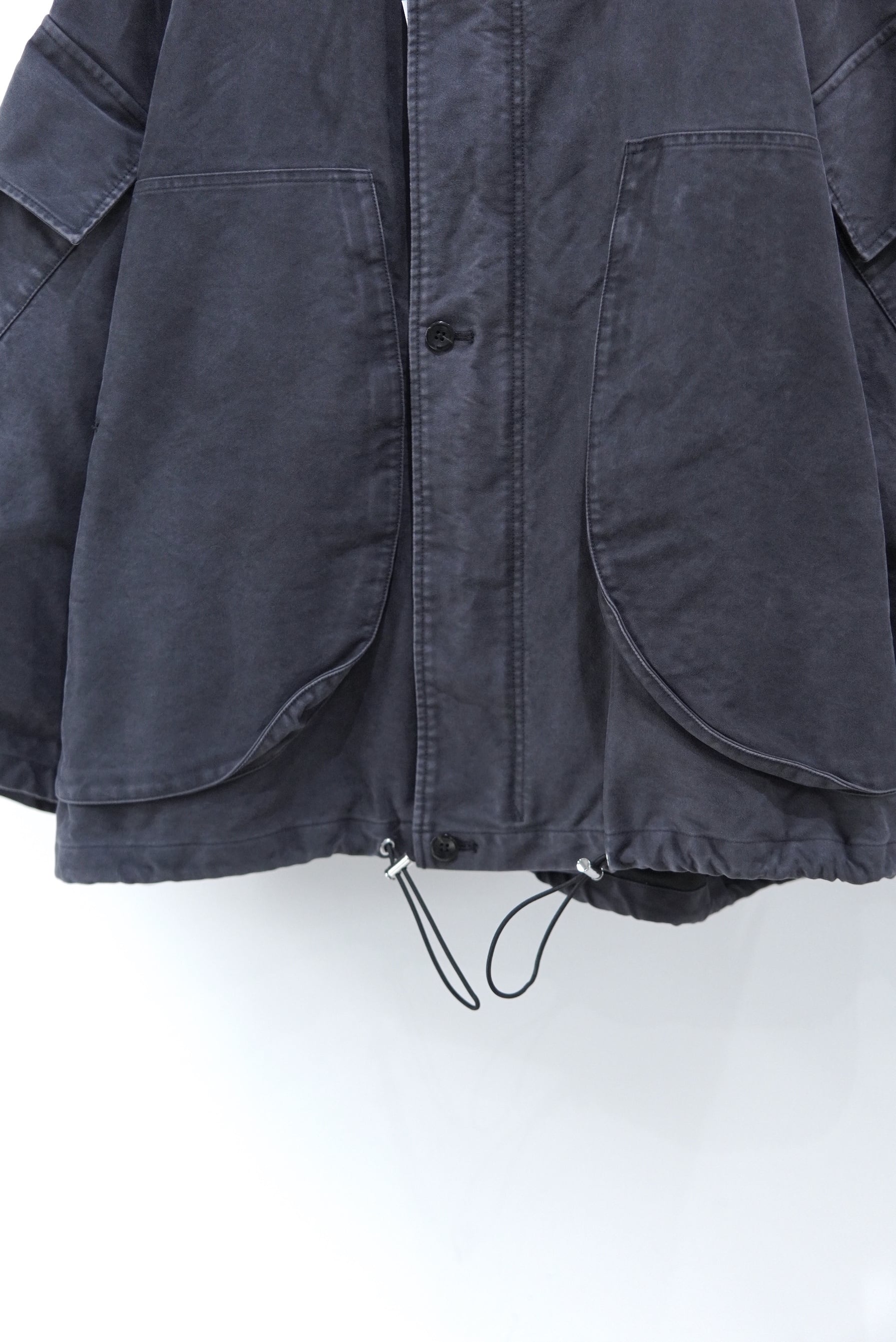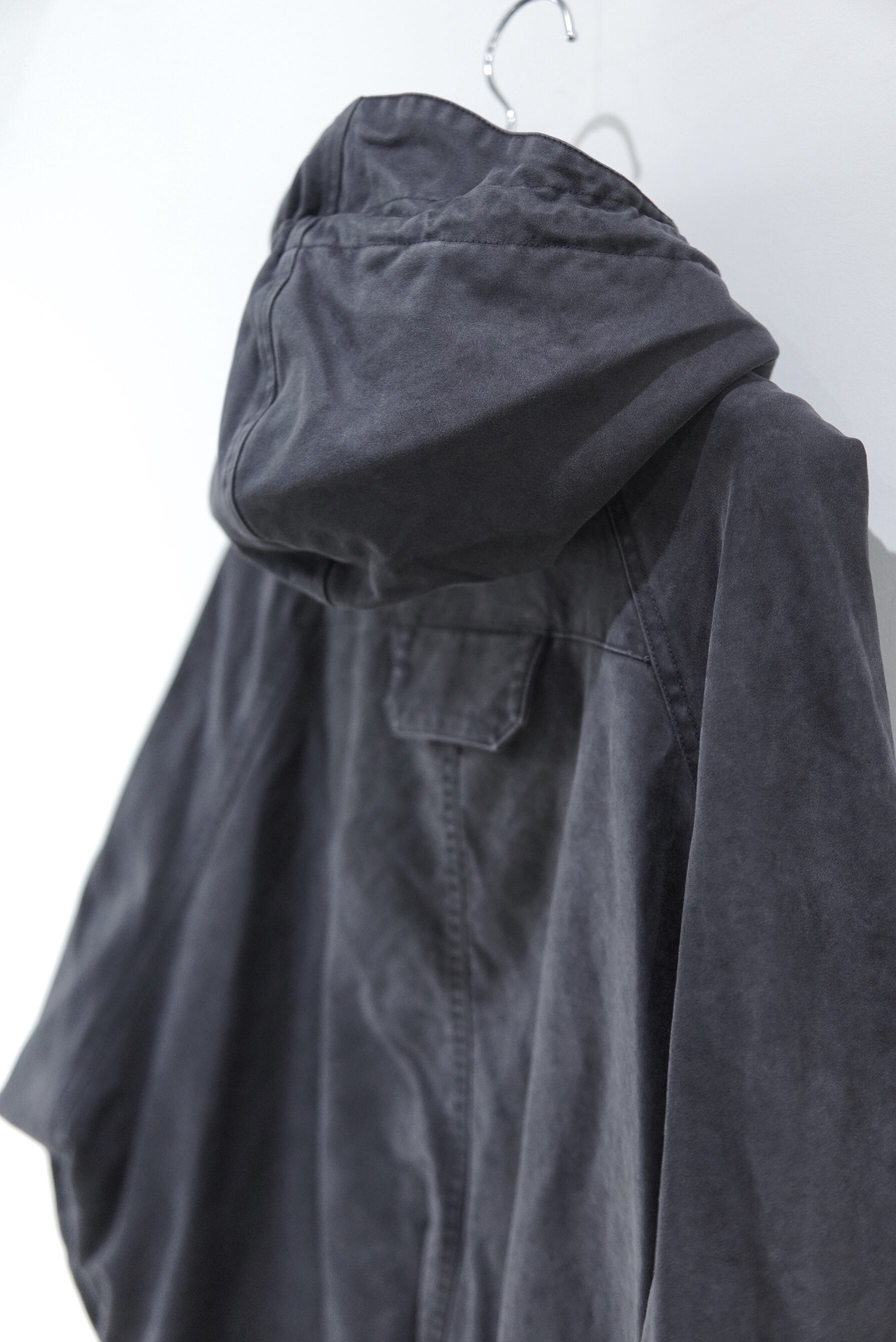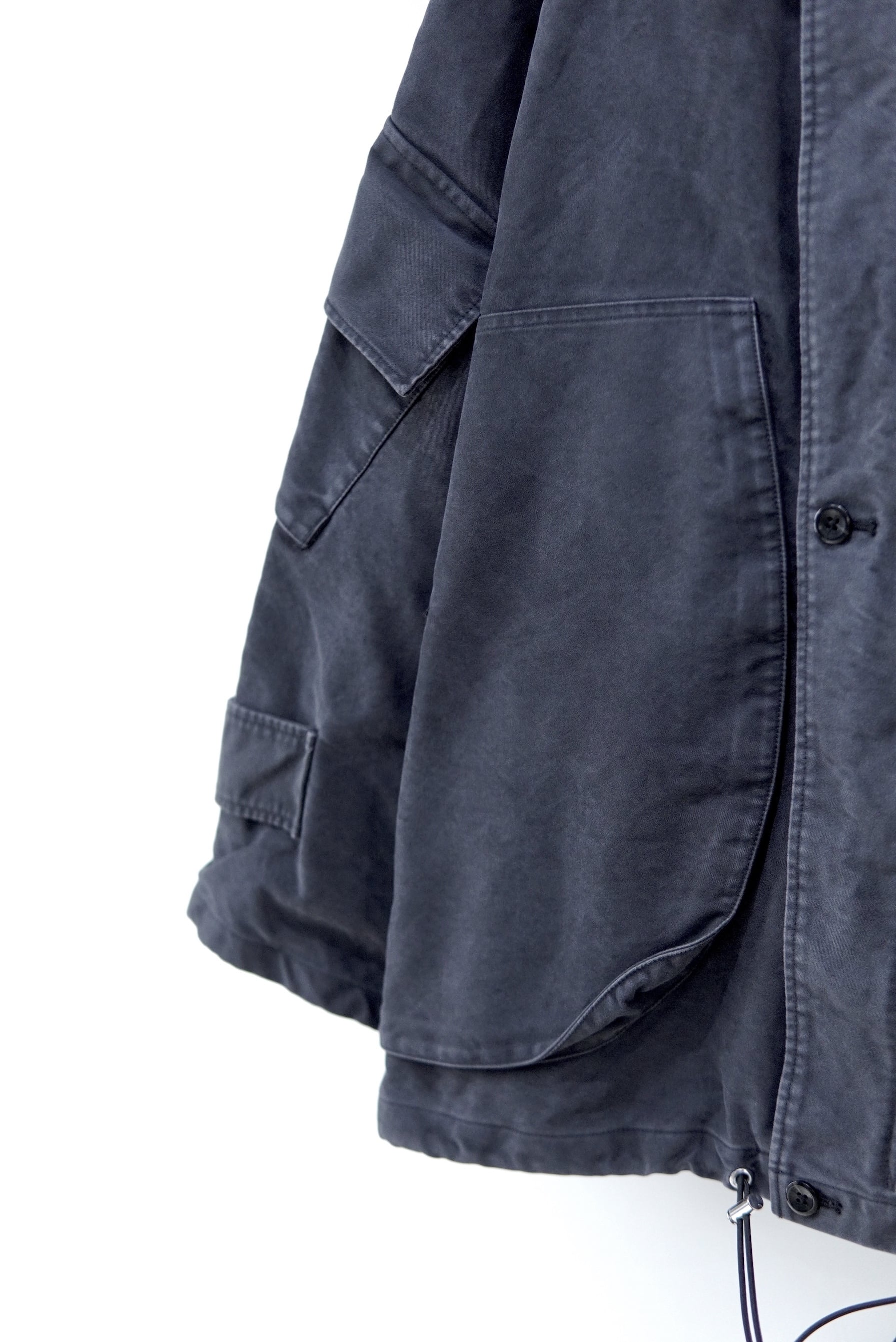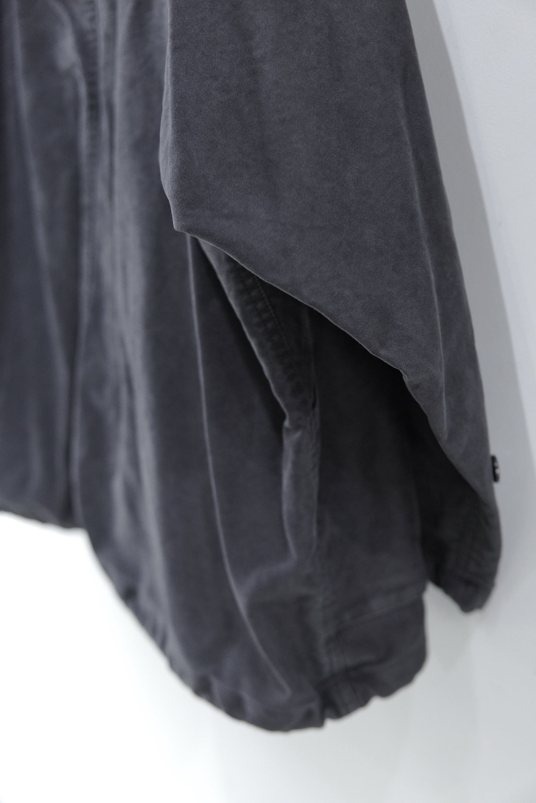 高密度に織り上げた日本製オーガニックコットン・モールスキンを硫化染めし、大きなフーデッドジャケットに仕立てました。製品洗いによって生まれるパッカリングと力強いフェードが、着込むほどに深まる表情を形成します。