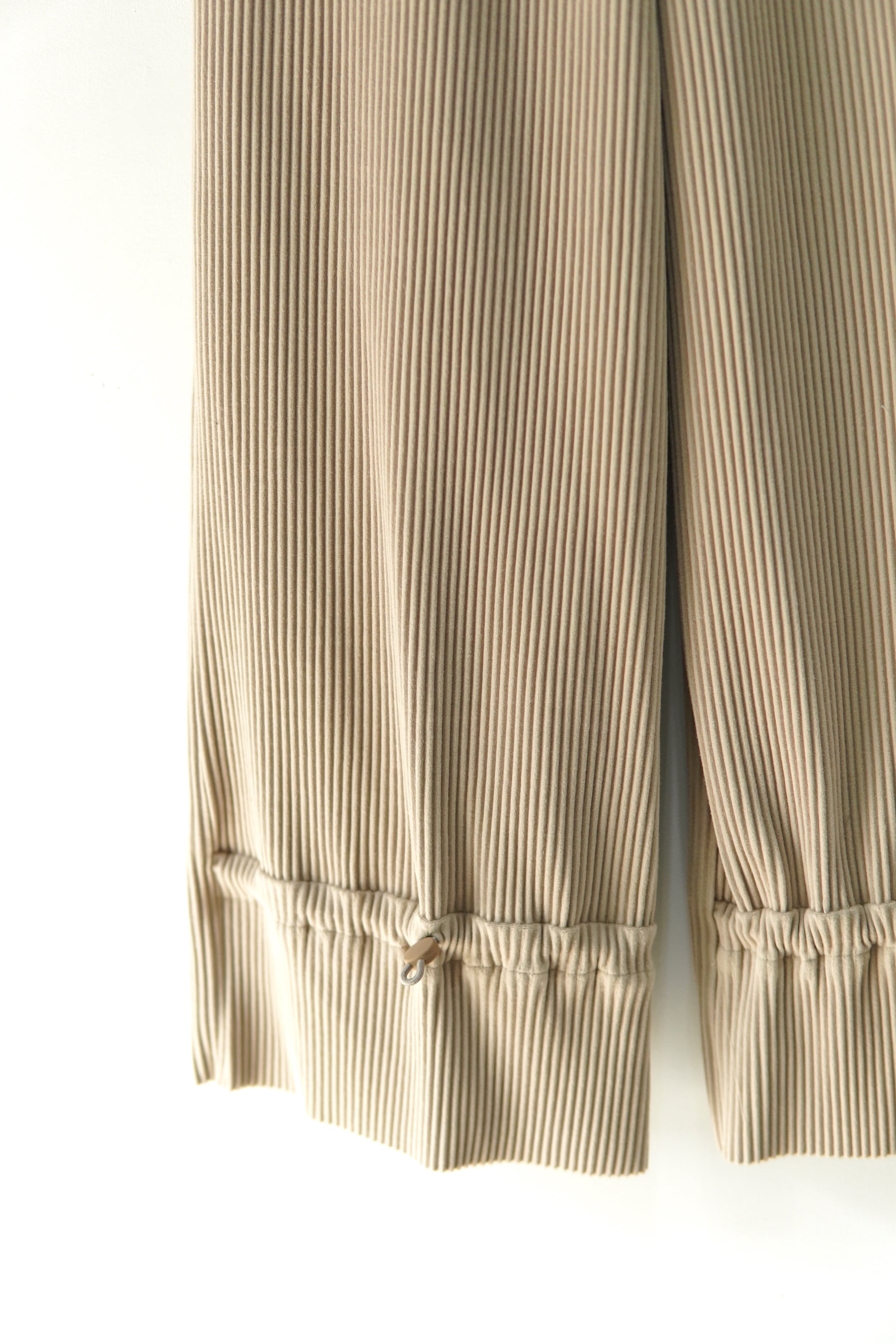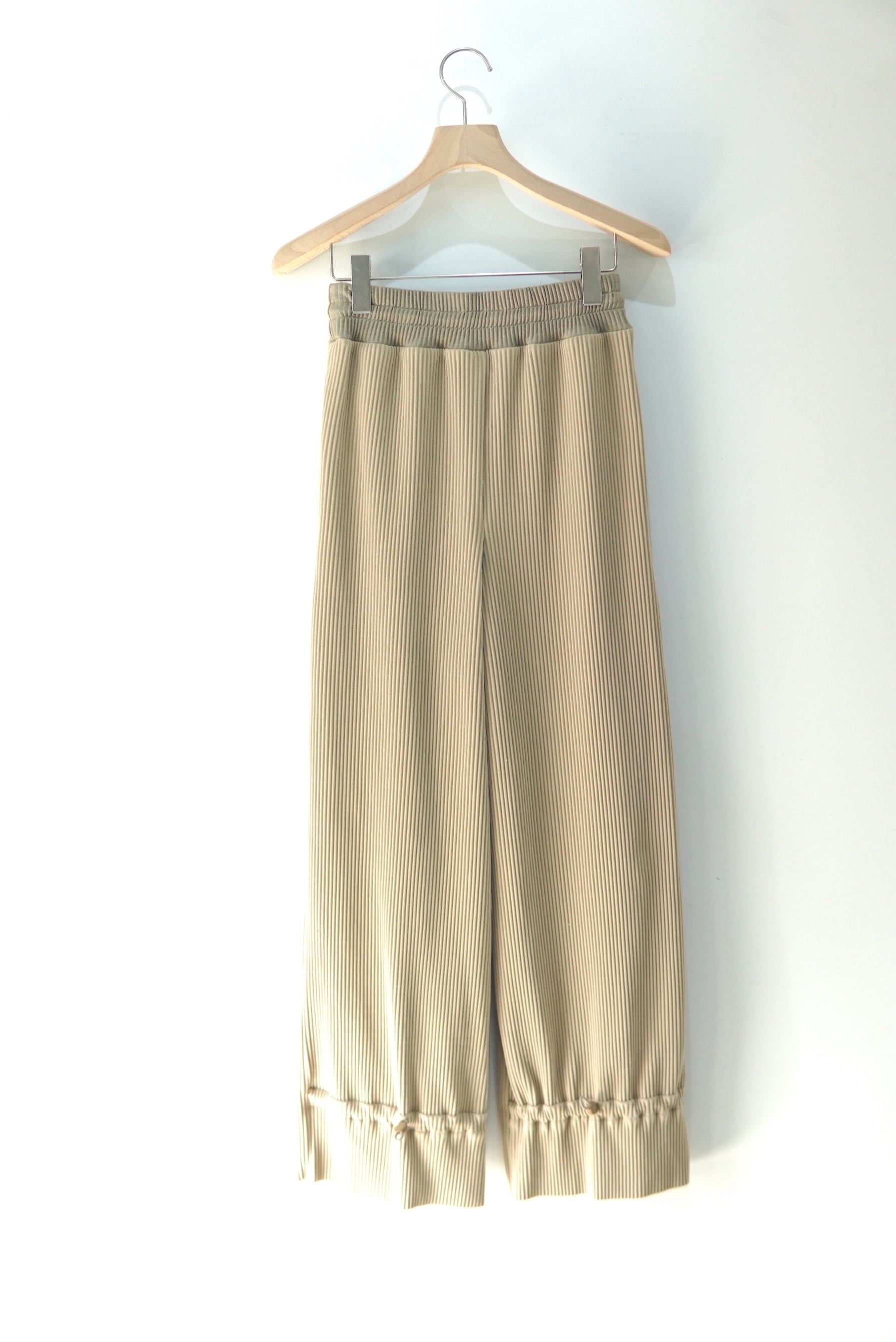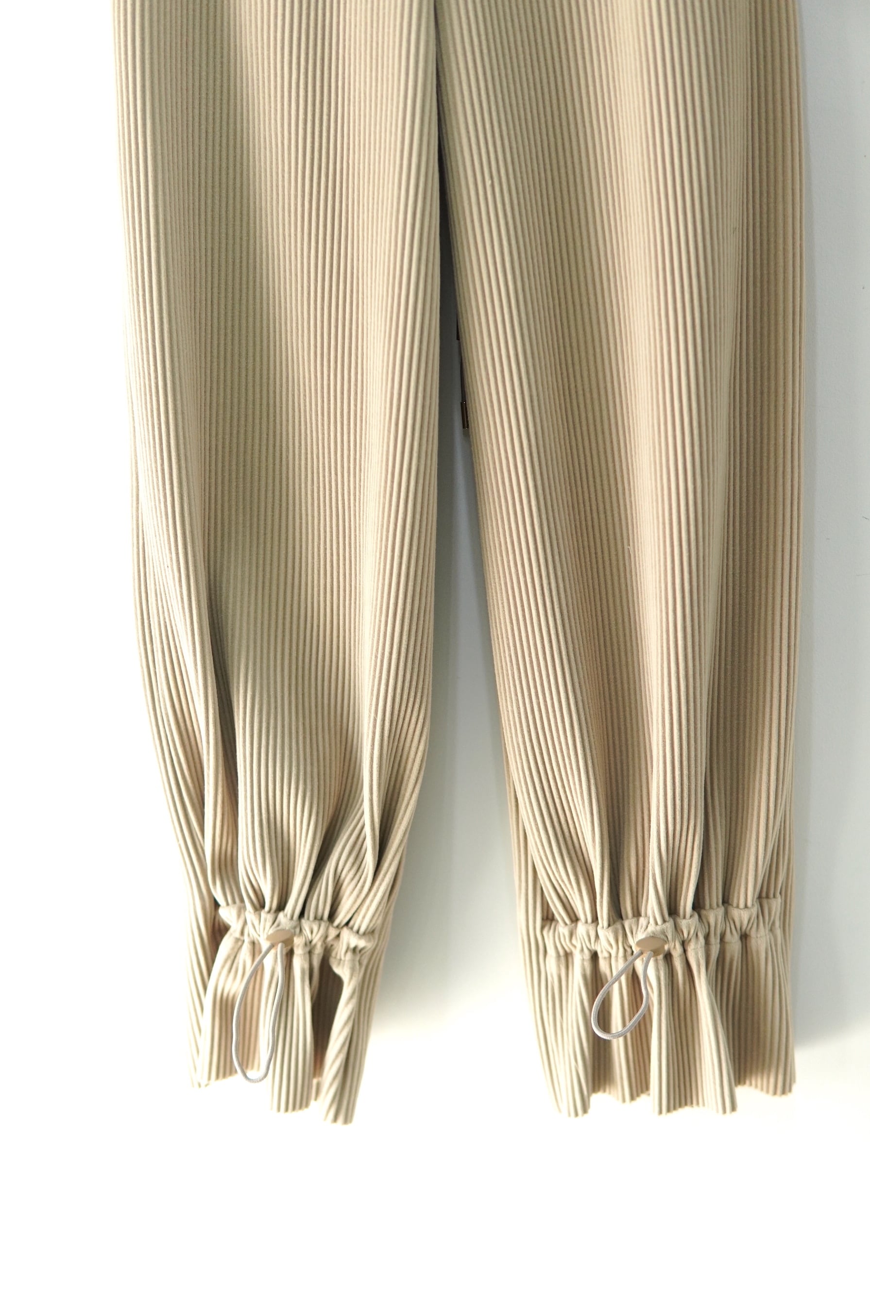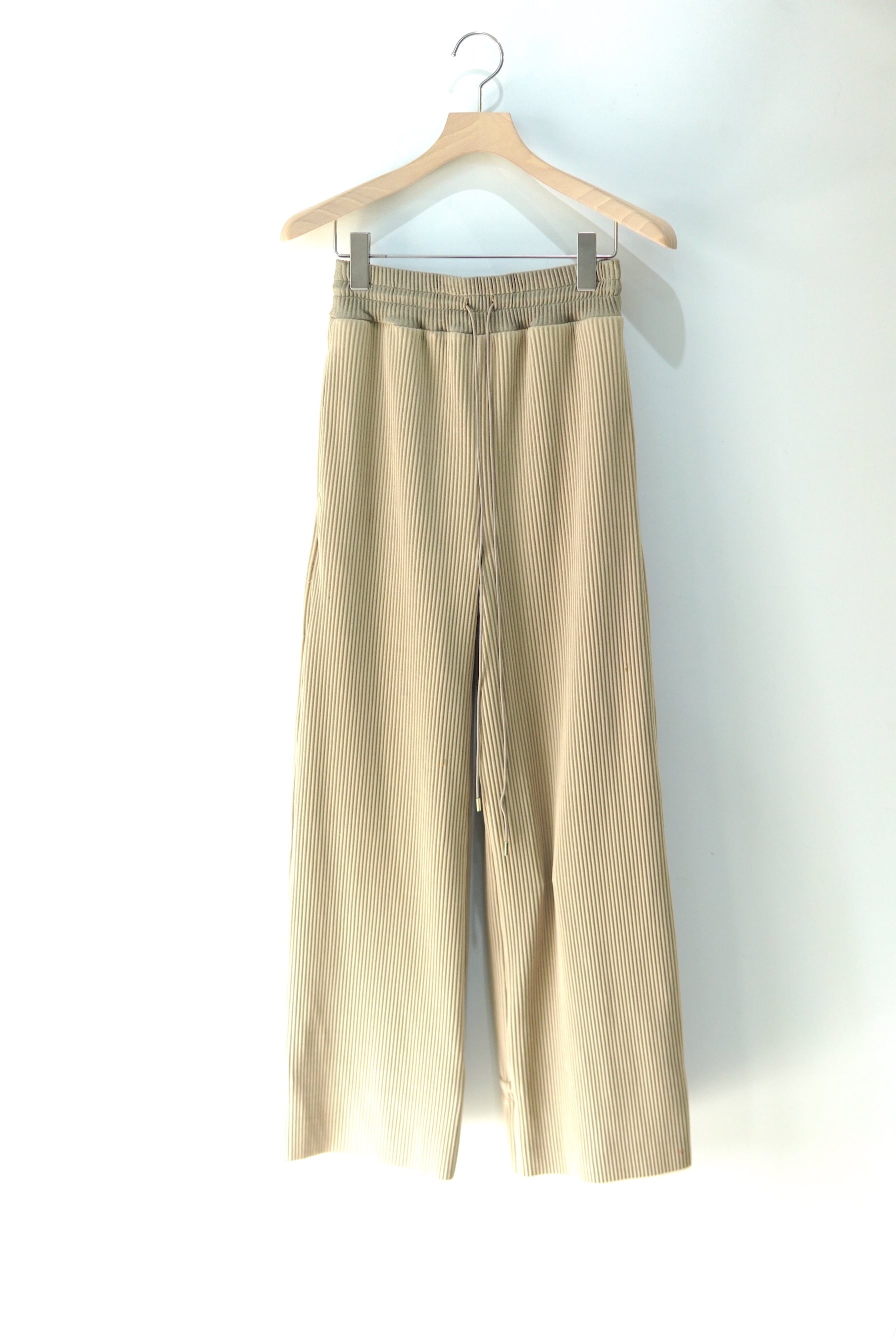 フリースの様な毛足と膨らみのある起毛生地を基布に選定し、3mmのクリスタルプリーツを施した今季を象徴するプリーツ素材。プルオーバー、パンツ、ドレスはスウェットの様なスポーティーさと休日感のある落とし込み。