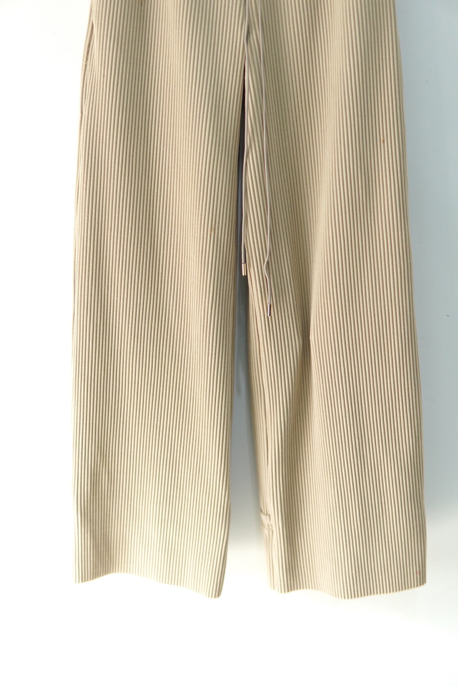 フリースの様な毛足と膨らみのある起毛生地を基布に選定し、3mmのクリスタルプリーツを施した今季を象徴するプリーツ素材。プルオーバー、パンツ、ドレスはスウェットの様なスポーティーさと休日感のある落とし込み。