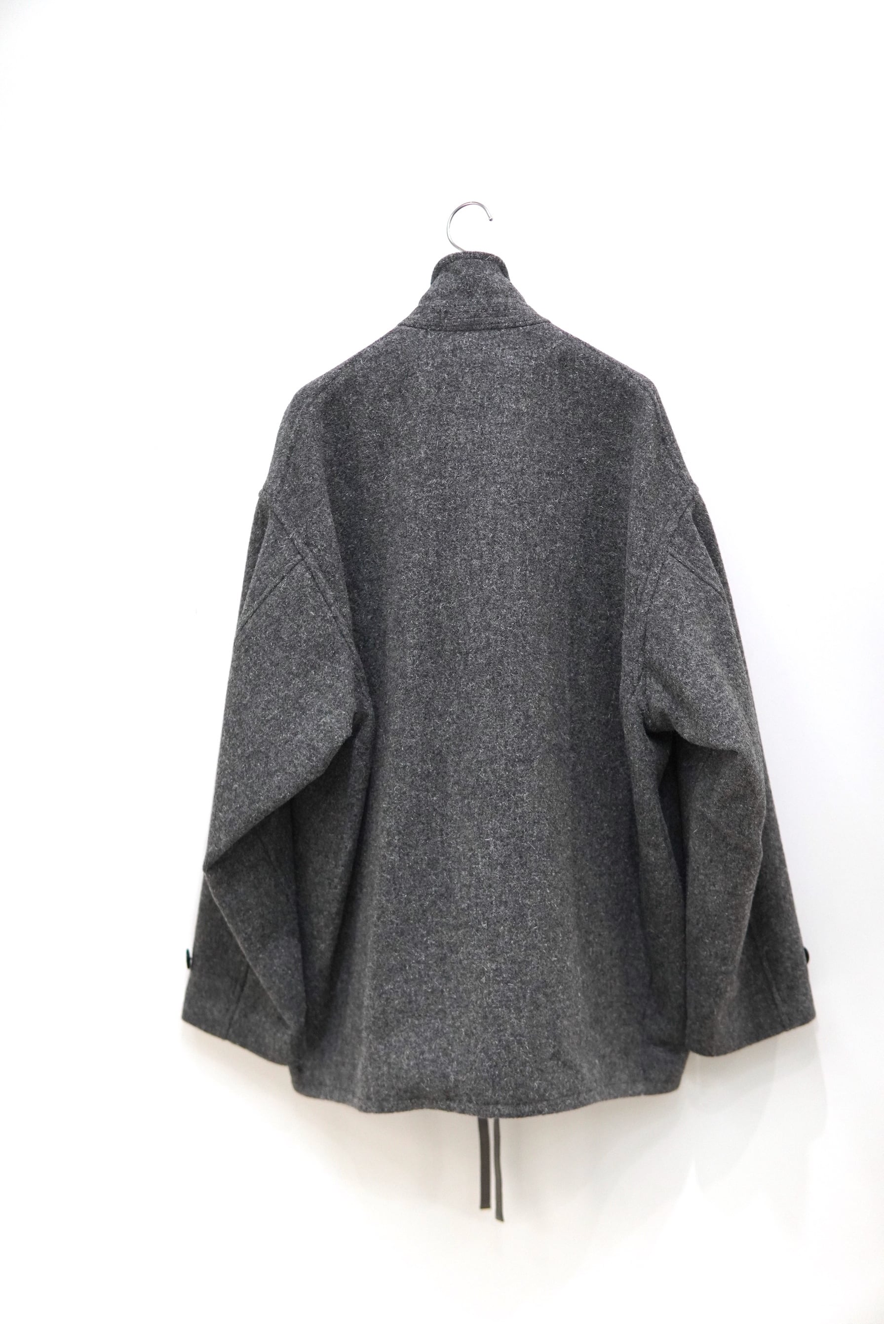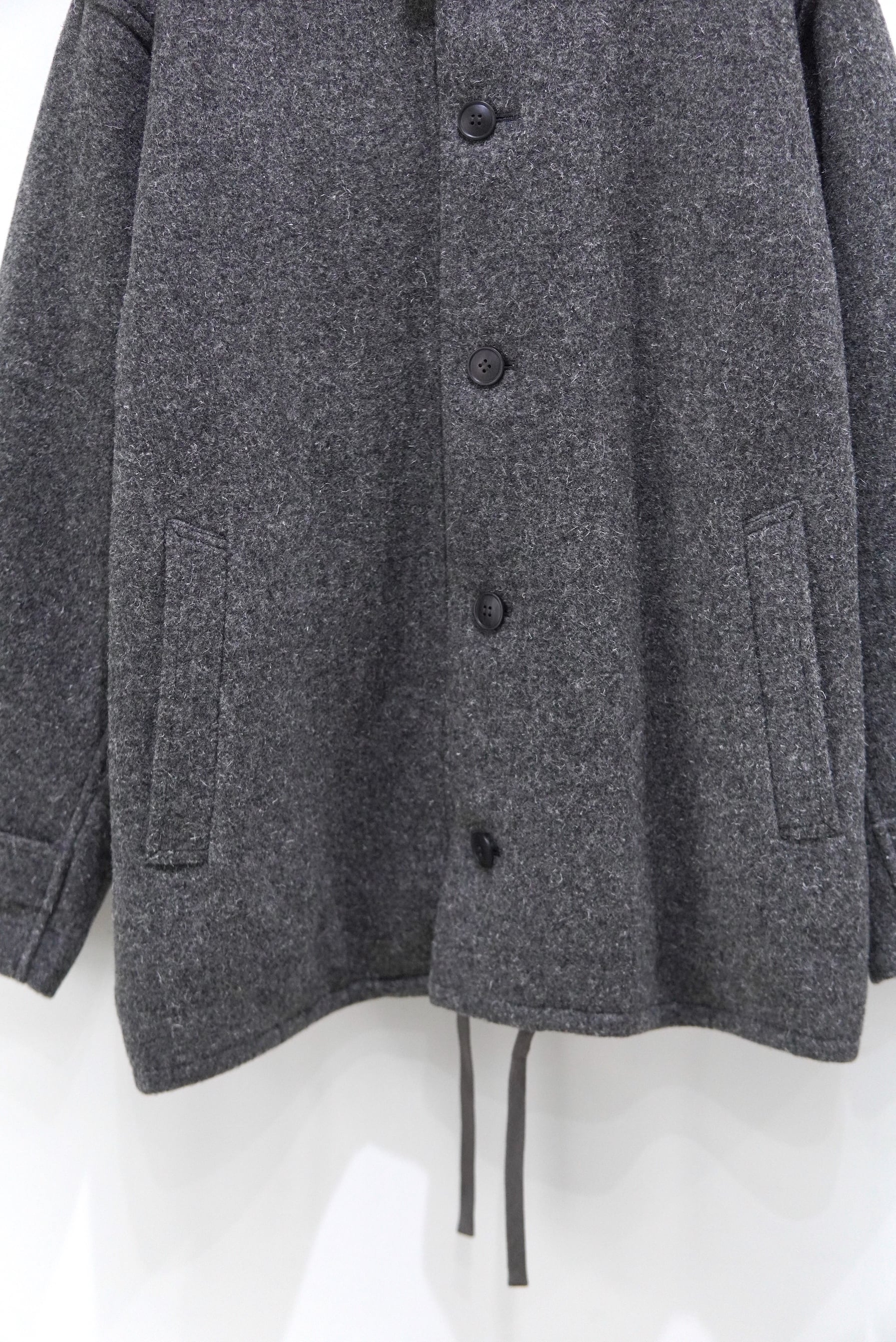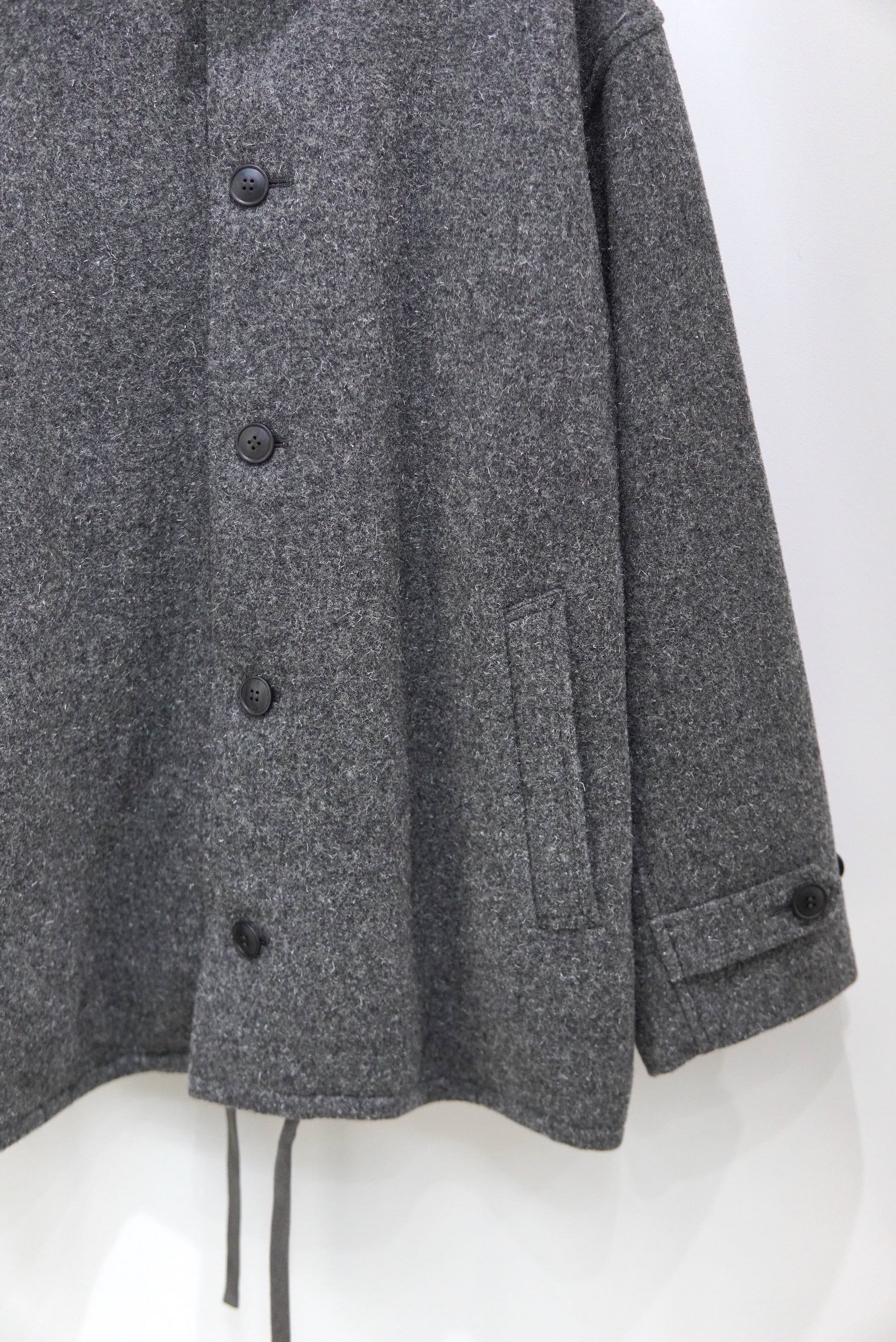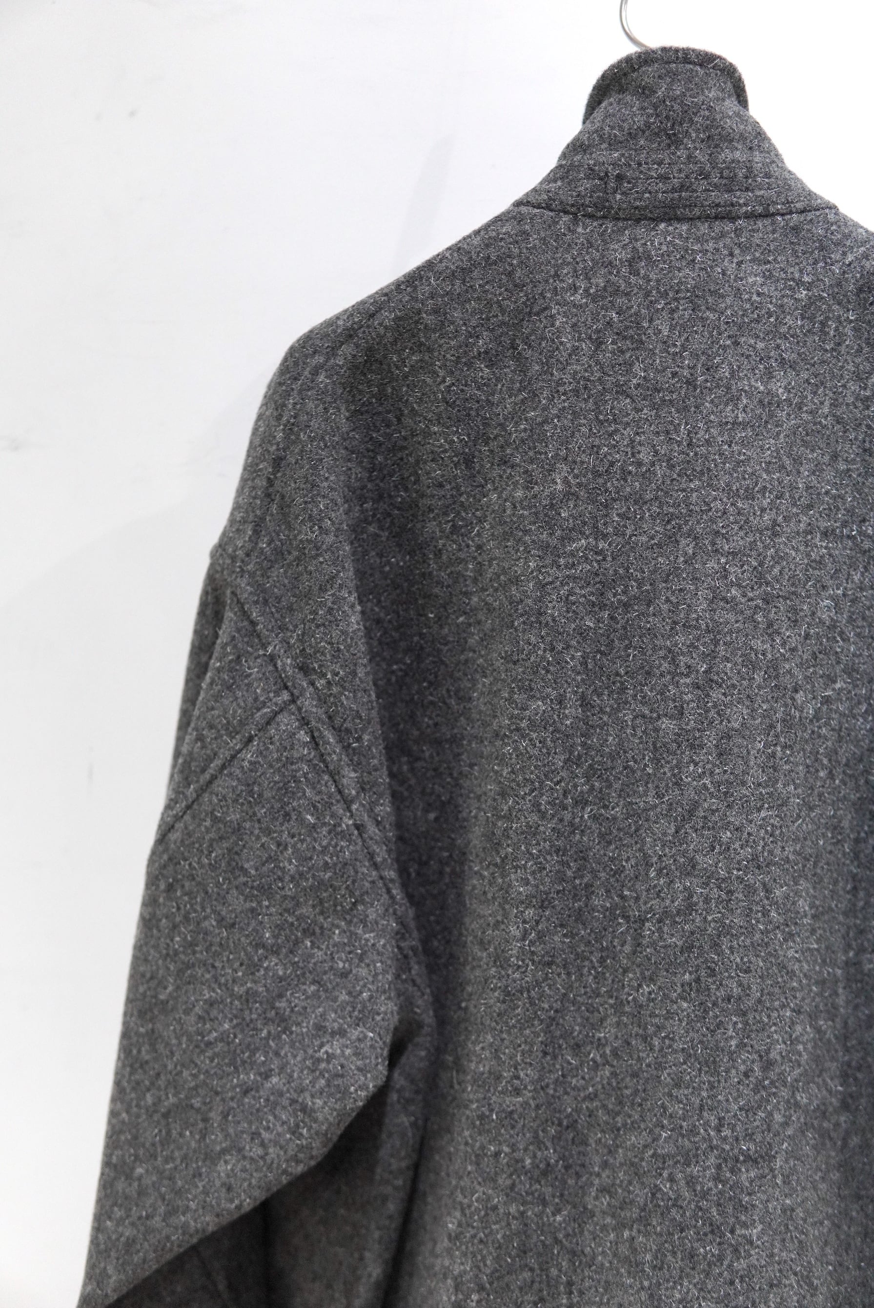 尾州地方の歴史のある機屋にて、旧式の織機を使用して製織したオリジナル素材。 希少性の高いケンピ混の紡毛糸を使用したクラシックなウールのコート生地です。 原料が持つ膨らみを最大限に生かした規格と仕上げにより、空気を多く含んだふっくらとした生地感。 重厚感のある見掛けとは裏腹に、比較的着疲れしない着心地も特徴です。