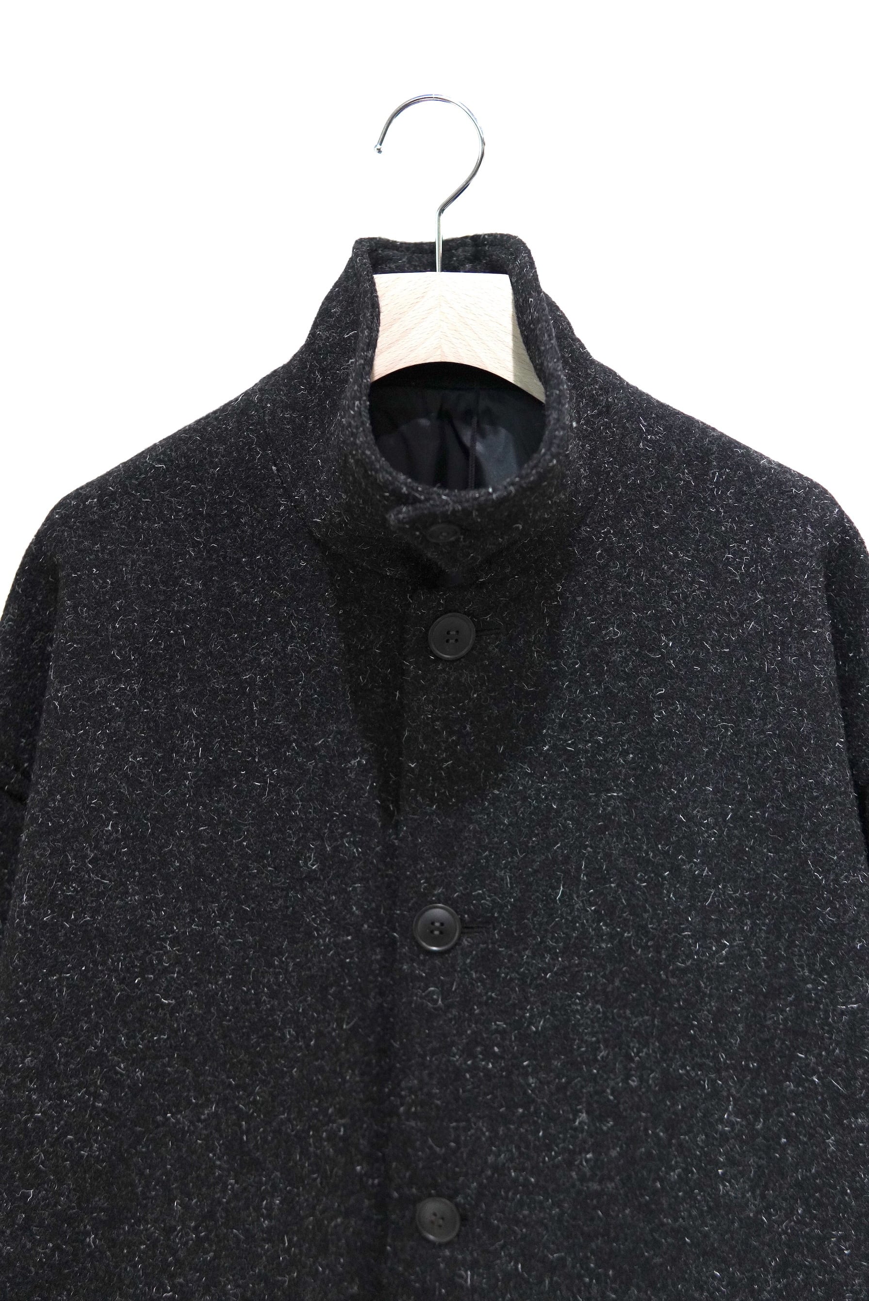 尾州地方の歴史のある機屋にて、旧式の織機を使用して製織したオリジナル素材。 希少性の高いケンピ混の紡毛糸を使用したクラシックなウールのコート生地です。 原料が持つ膨らみを最大限に生かした規格と仕上げにより、空気を多く含んだふっくらとした生地感。 重厚感のある見掛けとは裏腹に、比較的着疲れしない着心地も特徴です。