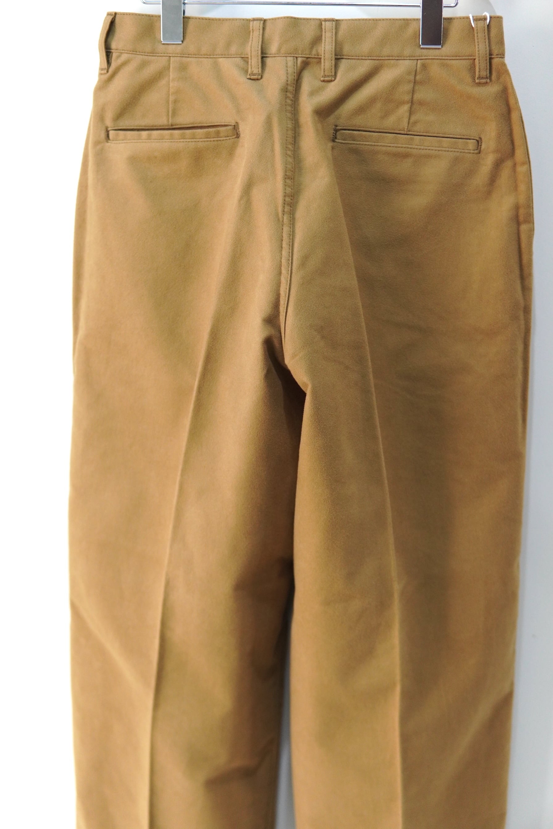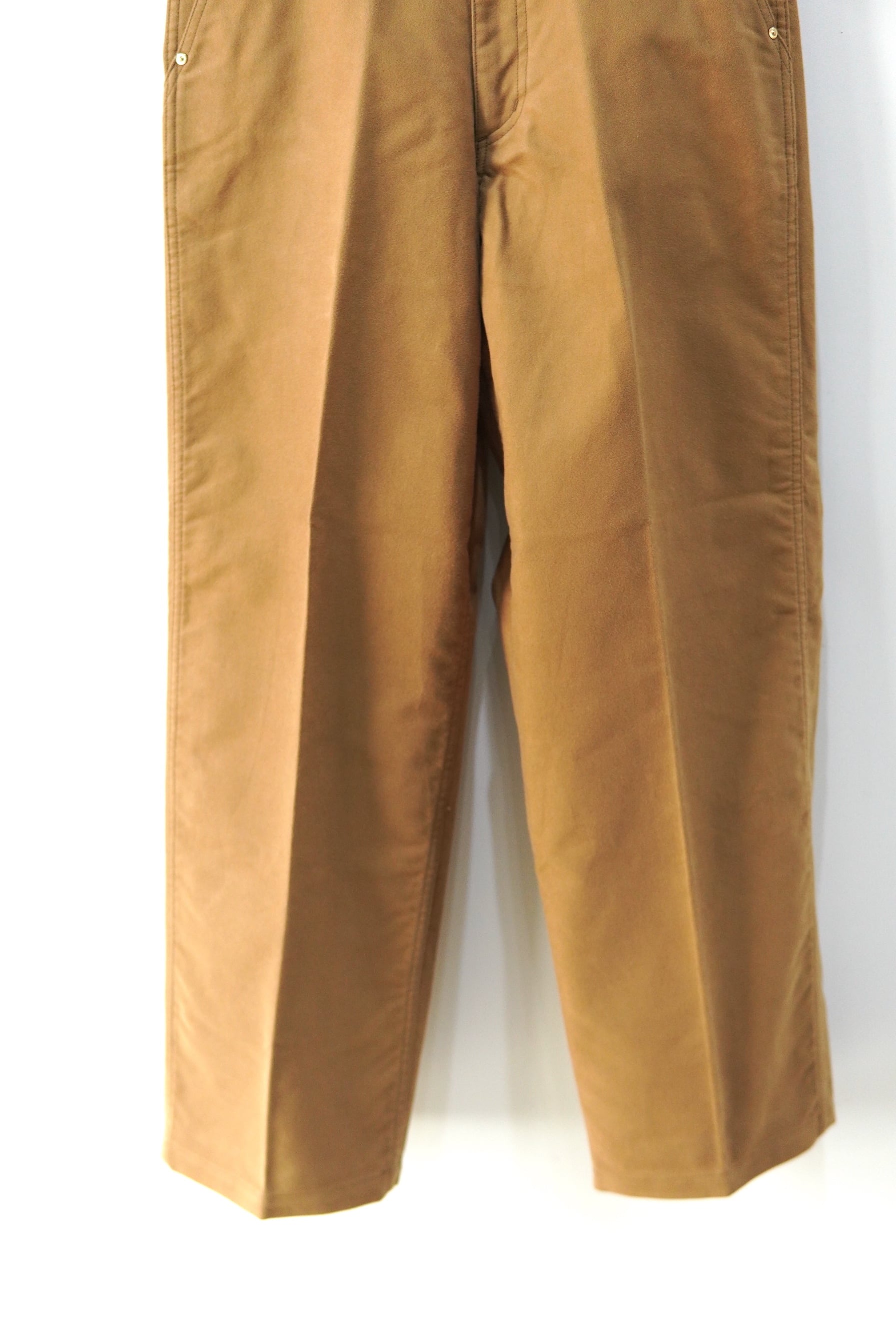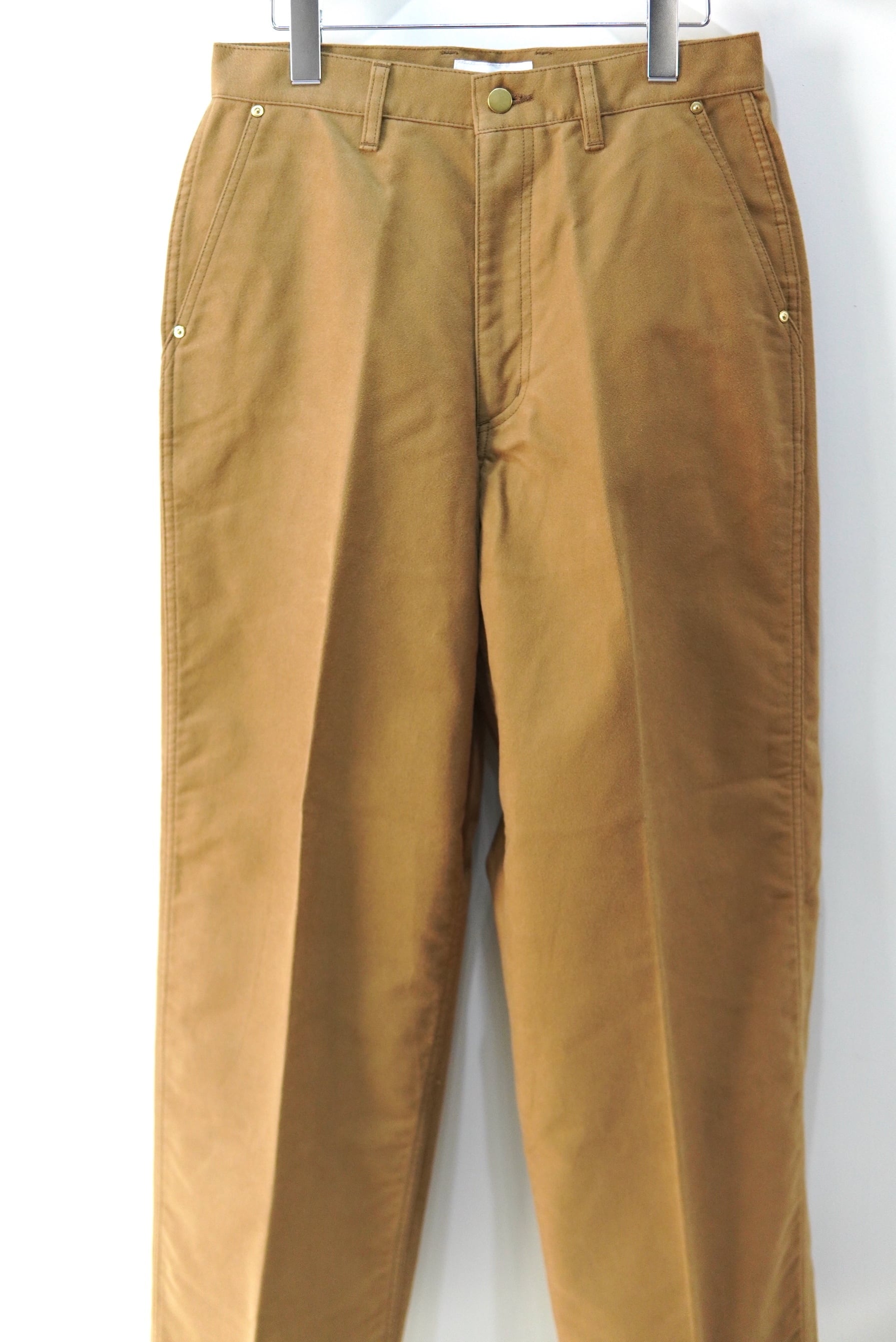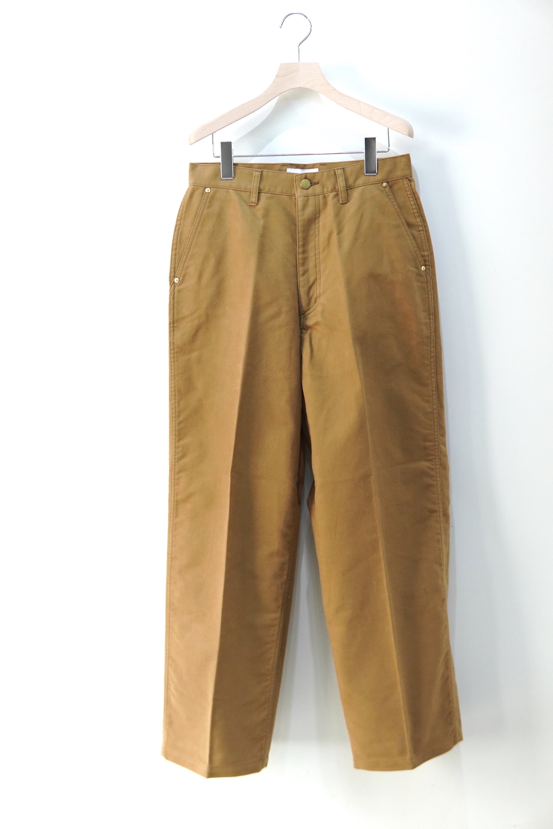 ワークのディテールを採用しながらも、スラックスの型紙を展開し、美しいシルエットになっている。メタルボタンや、リベットも経年変化していくと、生地色に馴染む様になる。超高密度のモールスキンを使用。