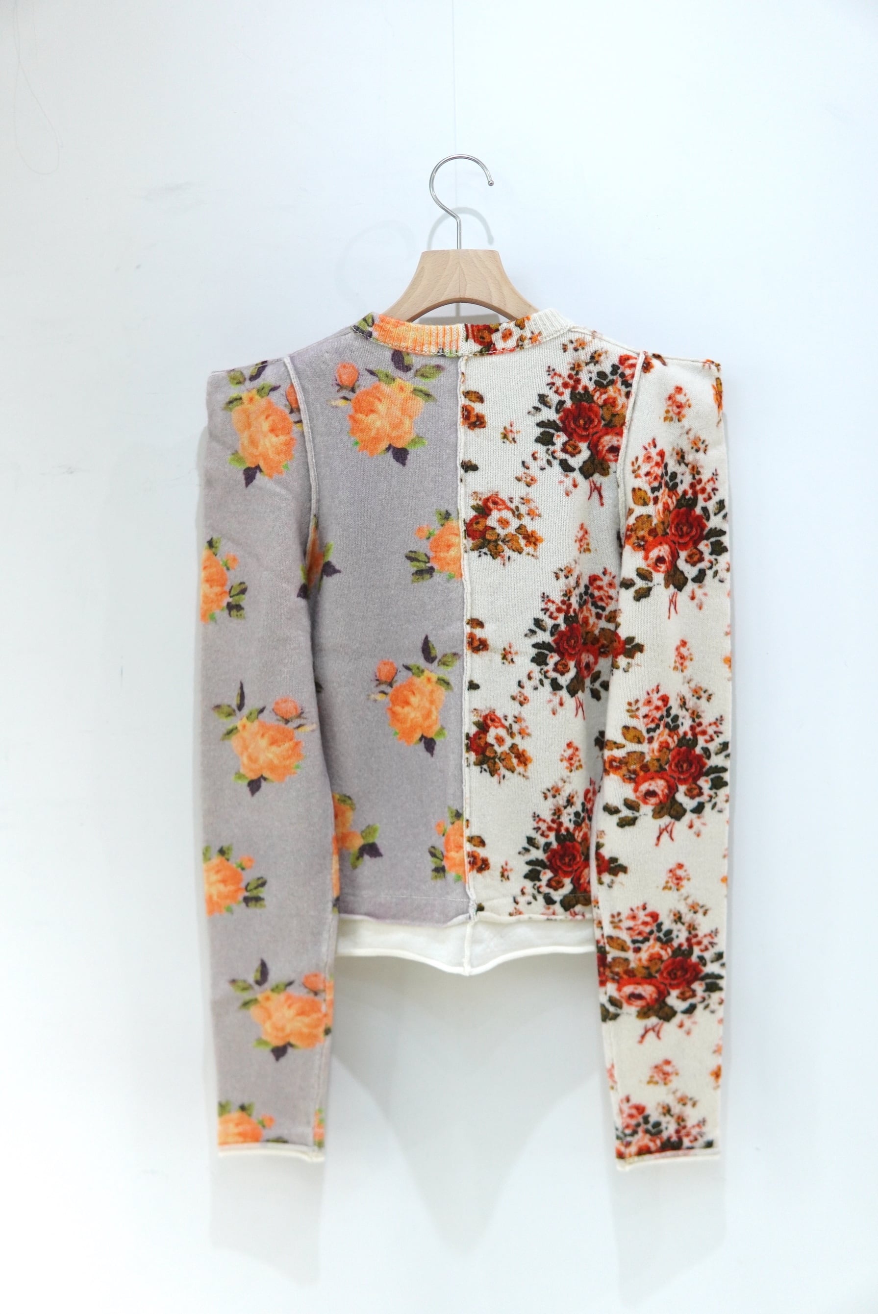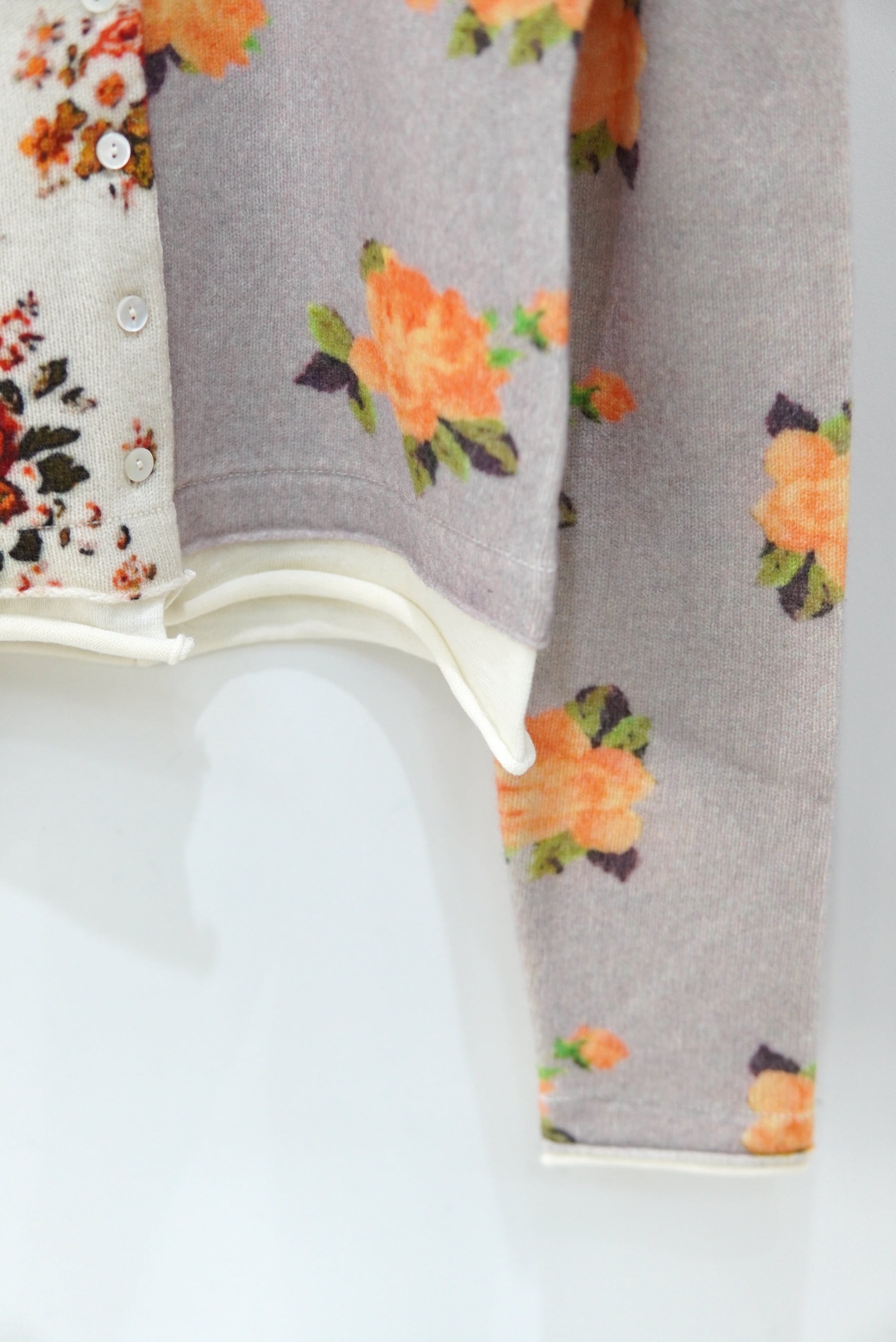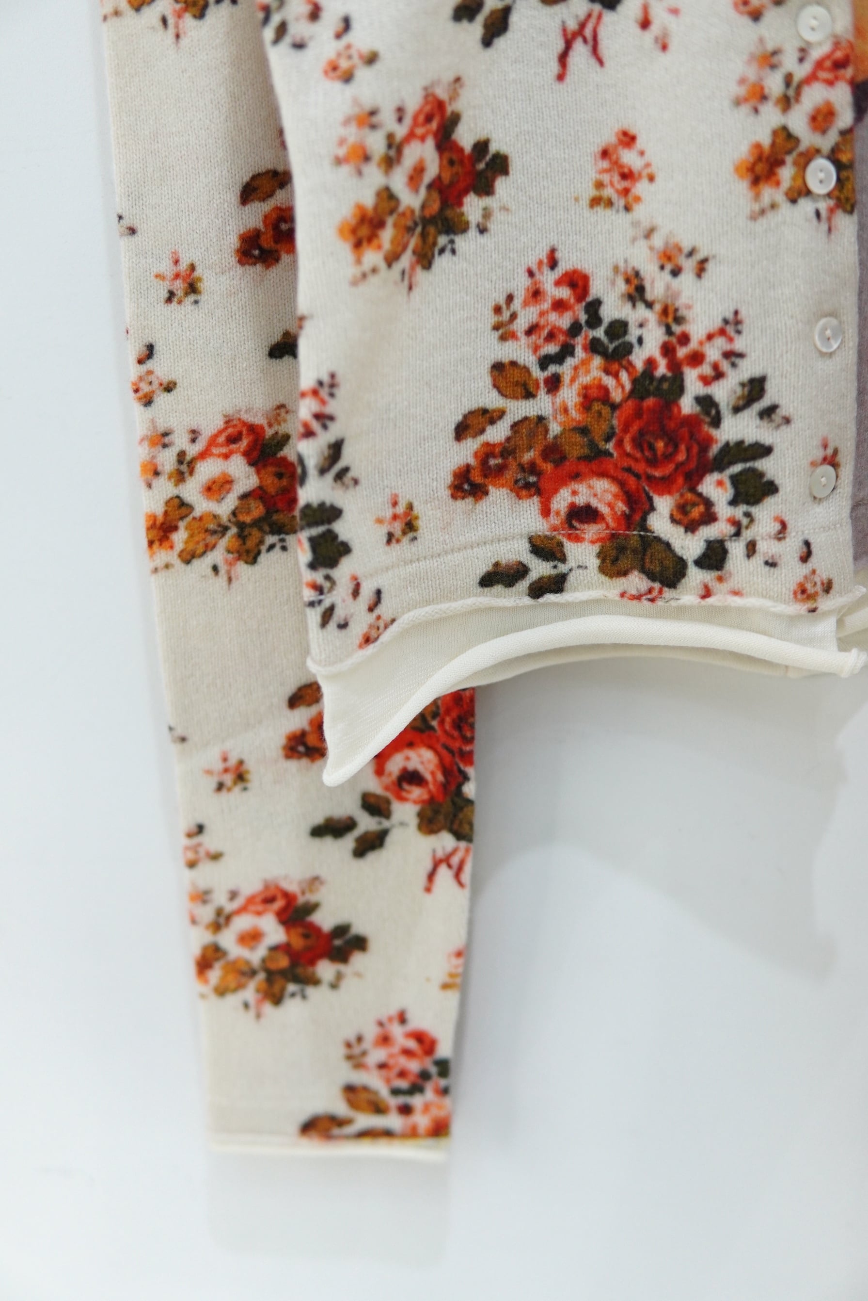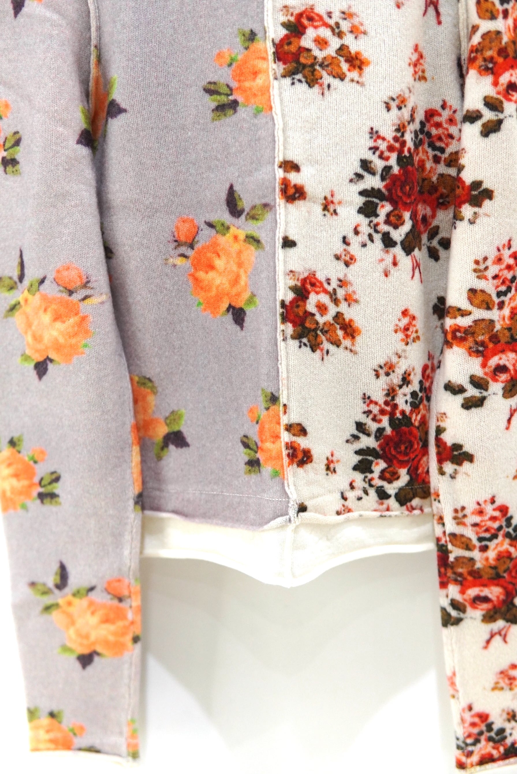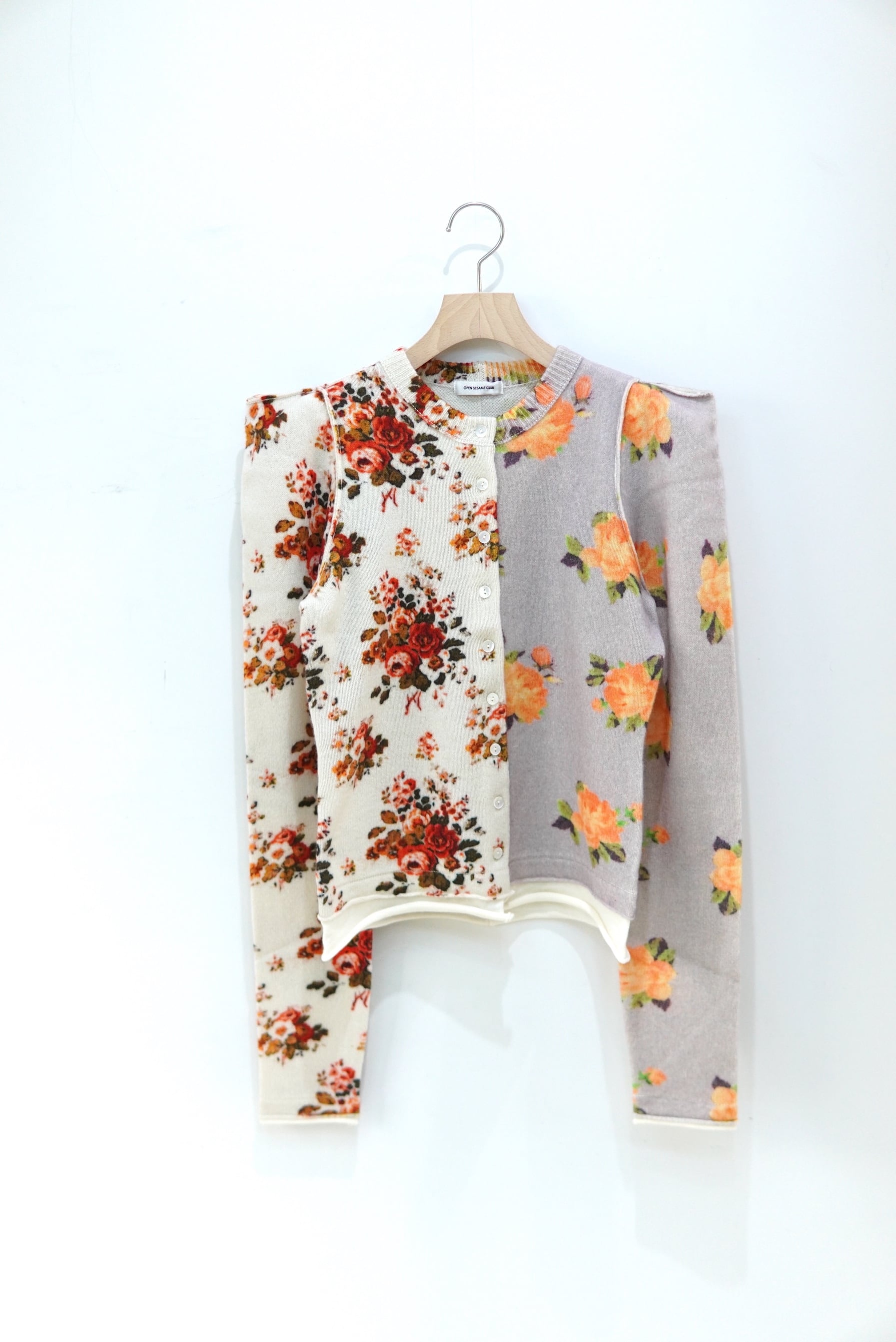 アシンメトリーなフラワープリントのカーディガン。ウール100%の柔らかな素材にプリントを施し、さらに起毛加工を加えることでヴィ ンテージ感ある雰囲気に、またアシンメトリーな配色が大胆な存在感を与えます。