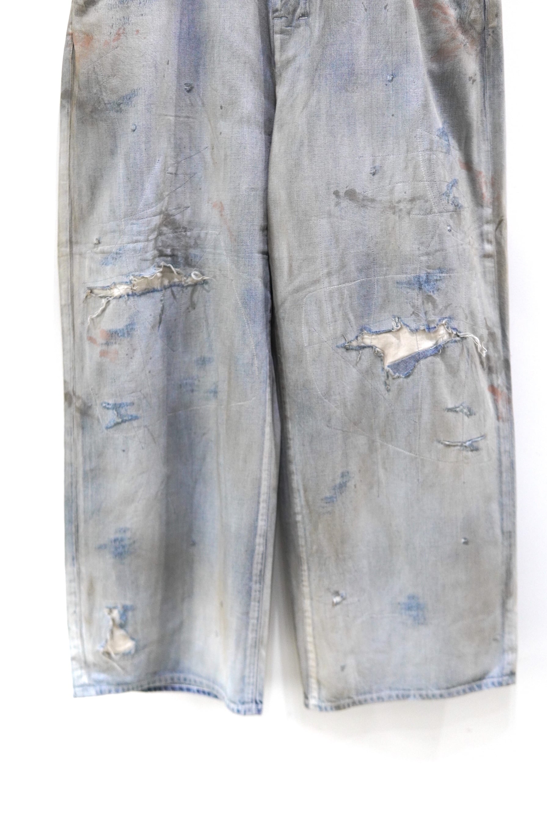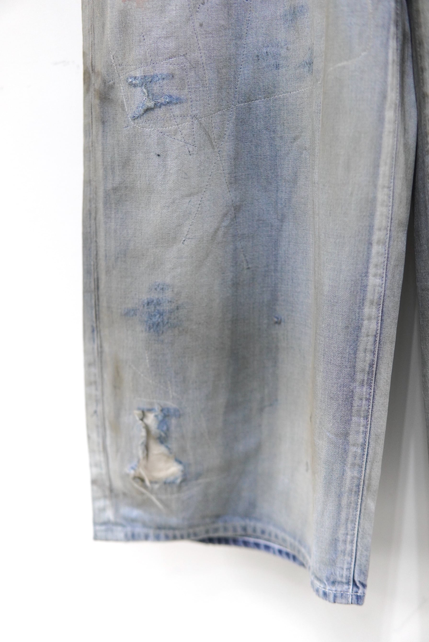 リペア部分を切り取って見るとアートのように映るよう一般的なやり方ではなく縦横無尽にステッチを走らせ汚しを散らせることでムードと迫力を加えました。