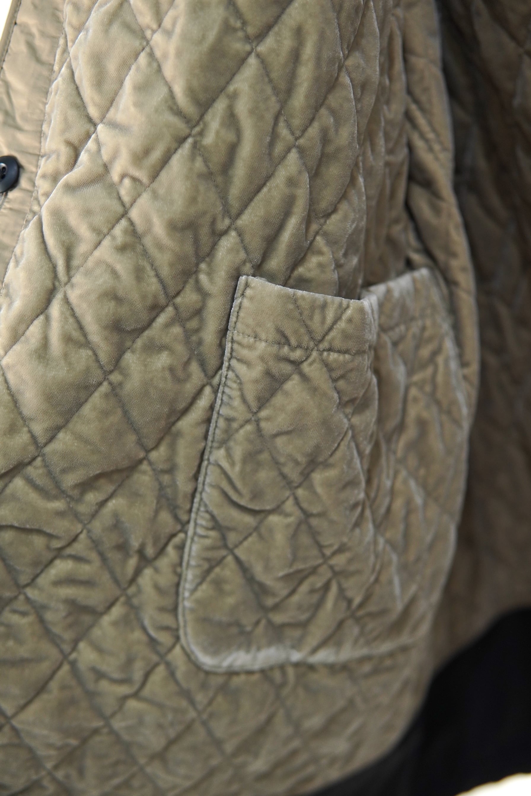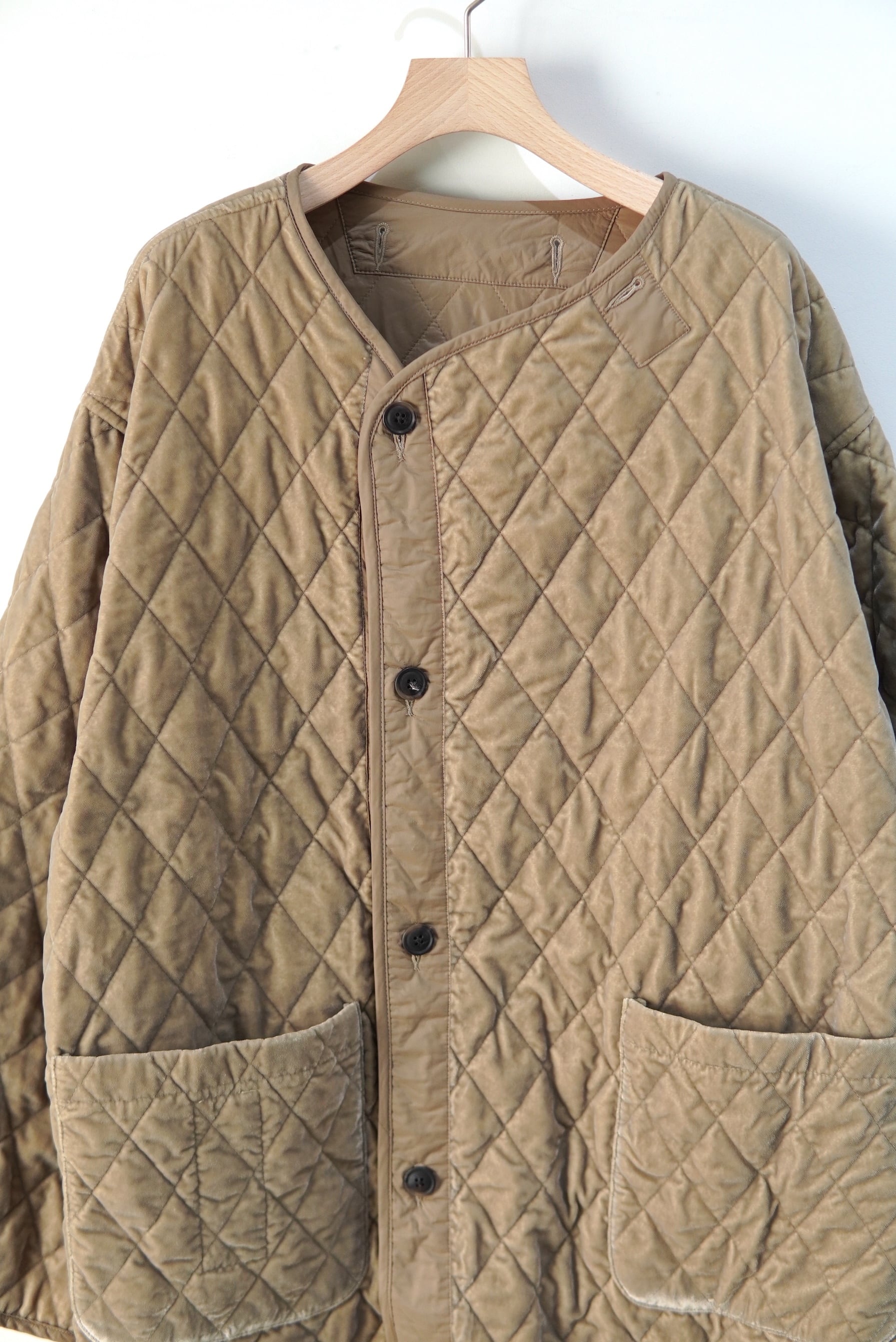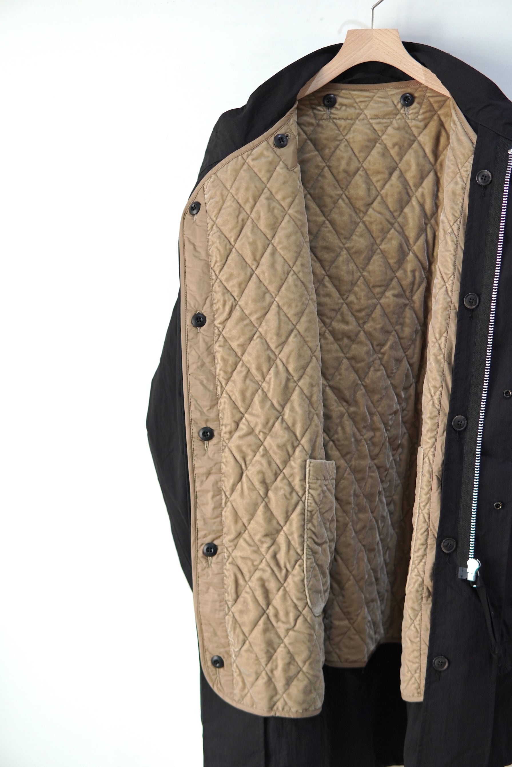ダイヤキルトを施したライナーは、セミダブル仕様 で、素材には鈍い光沢が目を引く短毛のベルベットを使用し、裏返して1枚で着用してもサマになる存 在感です。