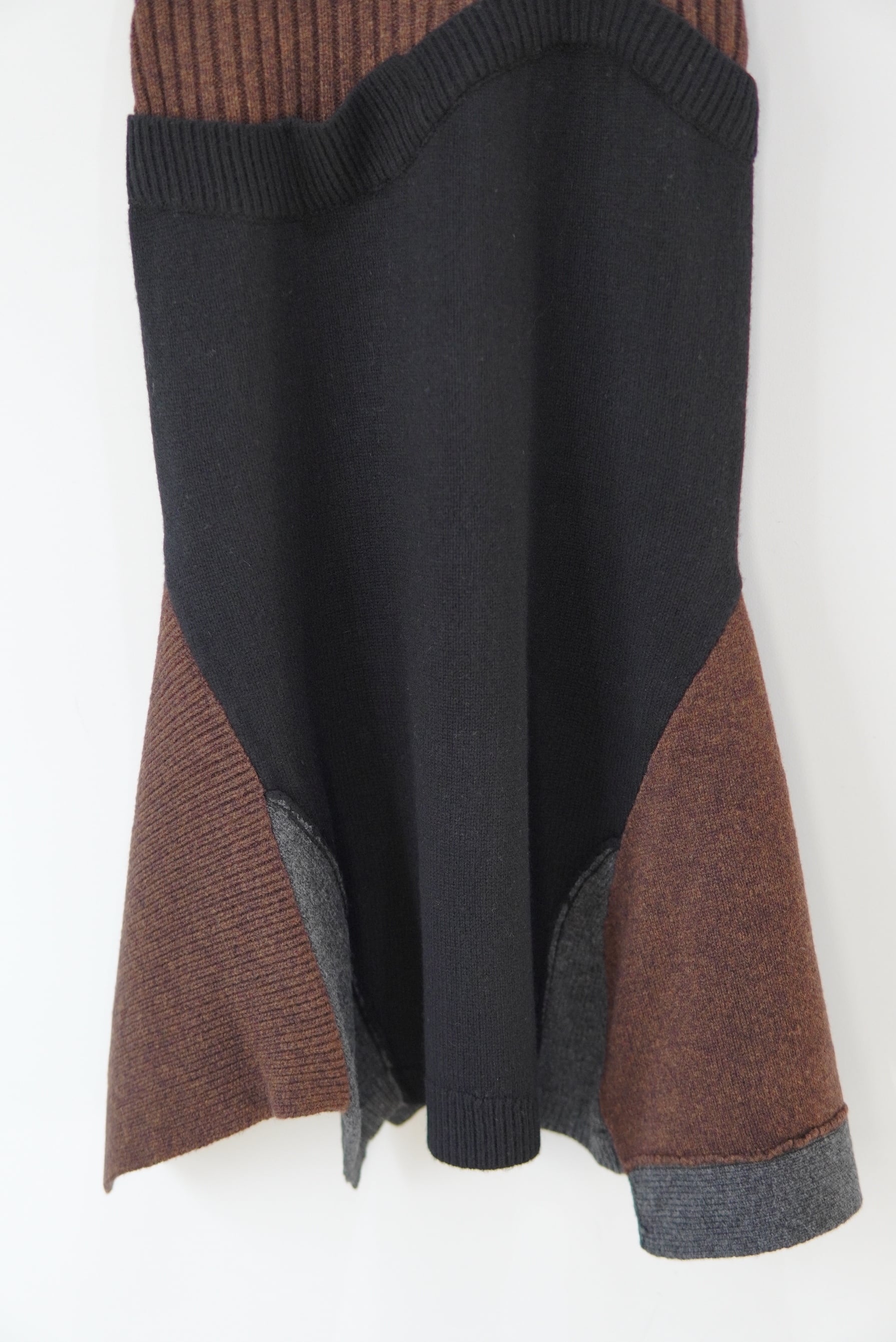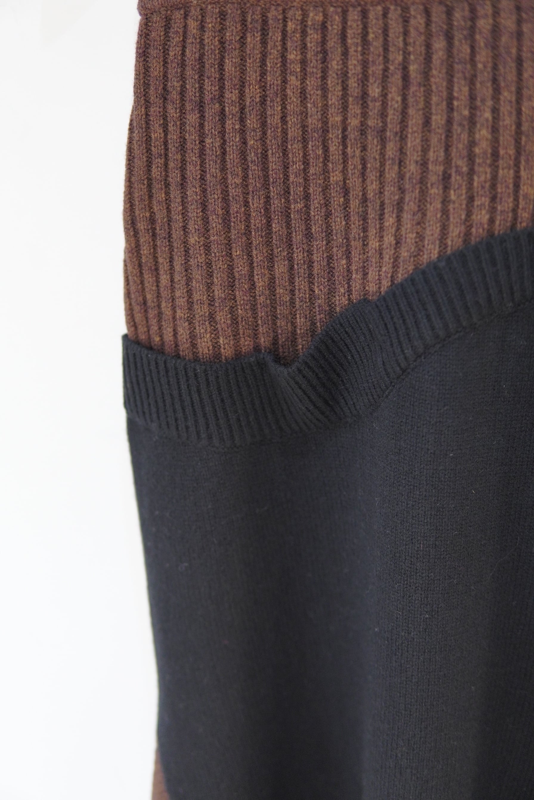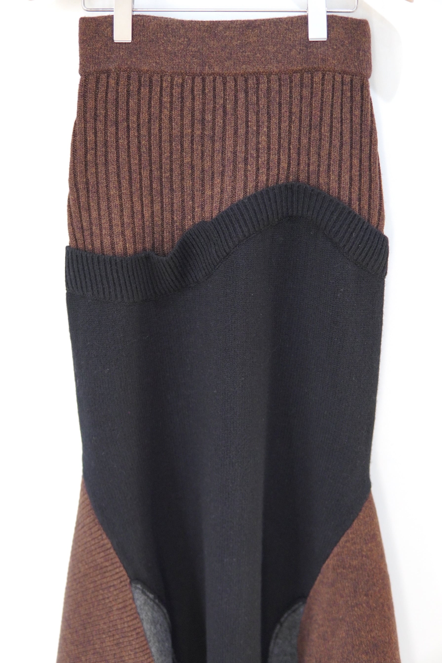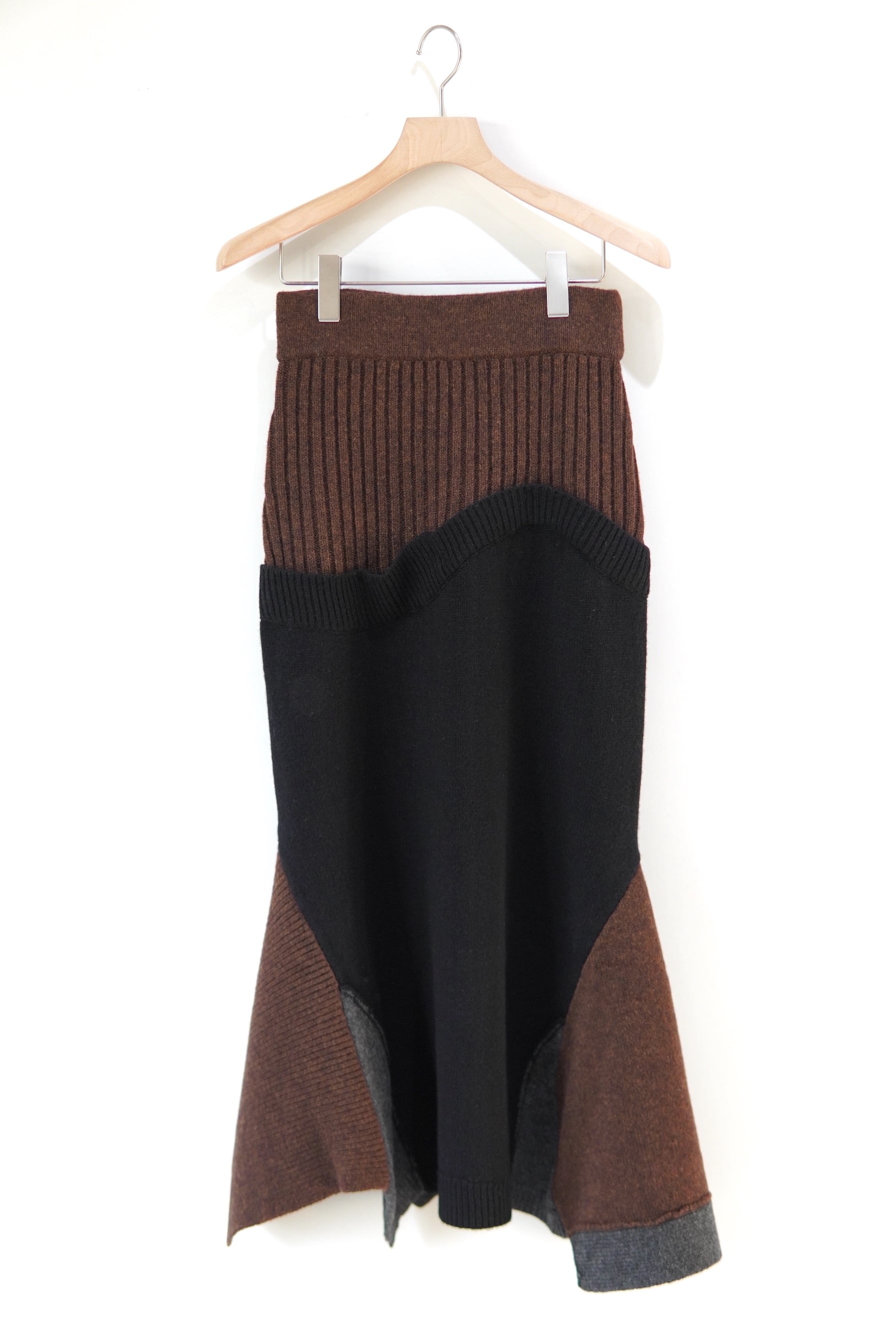 いくつものベーシックなニットを解体し、再構築することで生まれたリブニットスカート。3色〜4色のパネルをアシンメトリーに配置した デザインが、まるでパッチワークのように大胆な存在感を放ちます。リブ編み特有の厚みとハリを活かした構築的なシルエットに、揺れる ヘムラインが遊び心をプラス。前後関係なくスタイリングバランスに合わせて配色やヘムの位置をずらして着用できるのも魅力です。さら に、使用しているウールはRWS(Responsible Wool Standard)の原料を採用し、環境にも配慮したサステナブルな仕上がりに。同素材の トップスとセットアップで着こなせば、より印象的なトータルコーディネートに、単品使いでもスタイリングを一気にアップデートしてく れる一着です