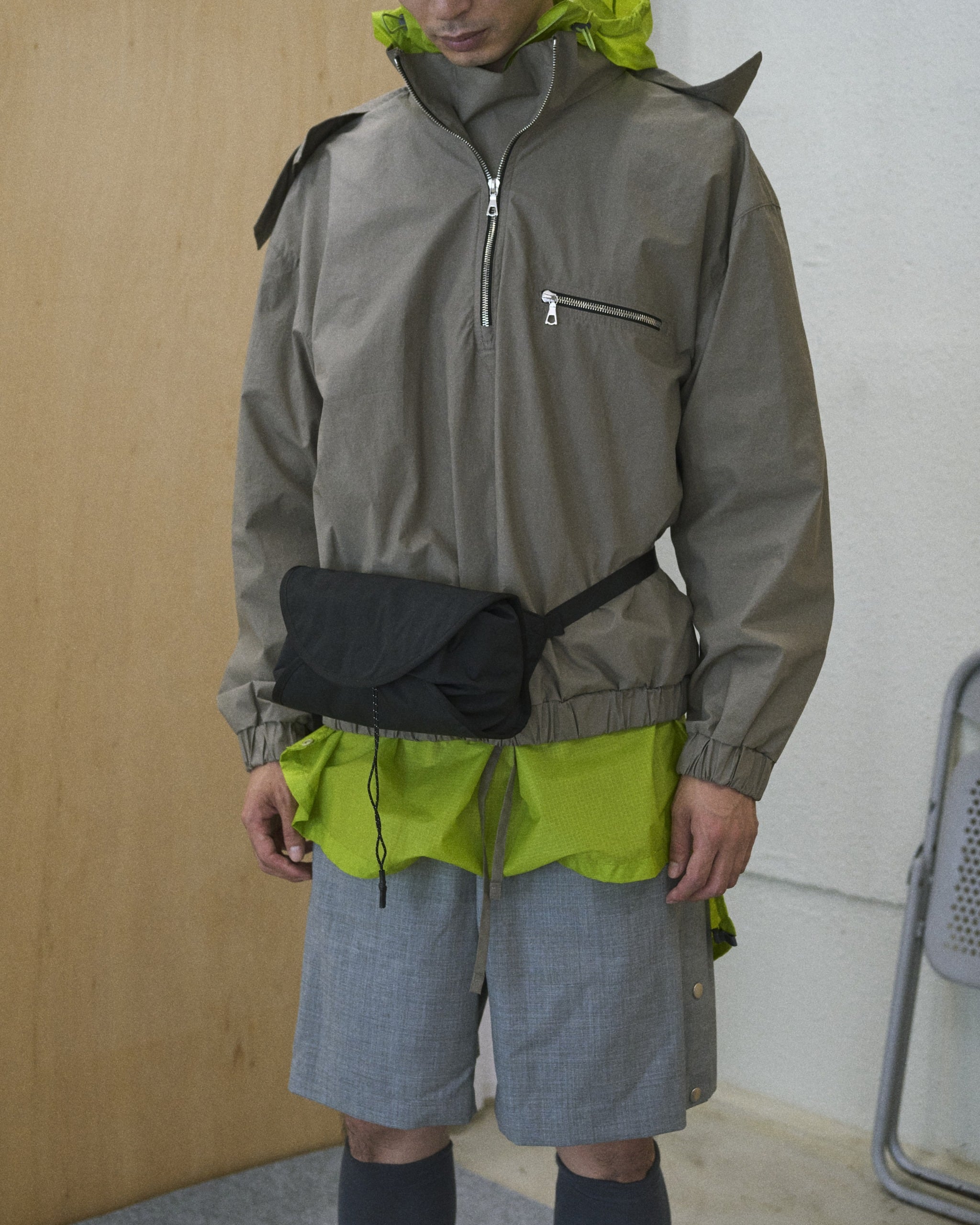 巻くをコンセプトに設計されたウェストポーチ。収納するアイテムを包み込む。容量は2Lと500mlのペットボトルを収納しても余裕があるサイズで、インナーには小物を収納するためのメッシュポケットを配置。アウターポケットはスマートフォンを収納できるサイズでキーホルダーが付属しています。テープ末端のリフレクターテープもポイントになっています。