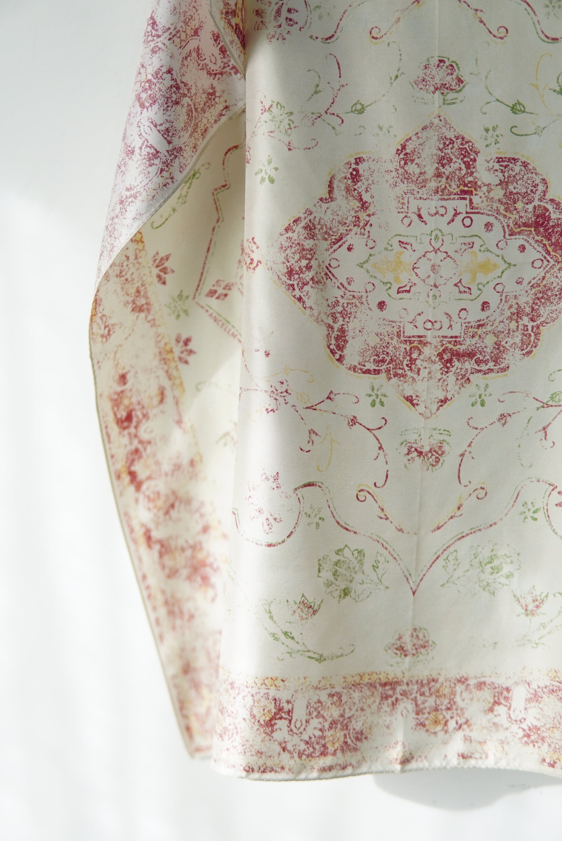 上質で細いシルクを細かく織り上げることで、艶やかで美しい光の浮かぶスカーフに、使い込んで掠れたプリントを施し、ムードを対比させております。