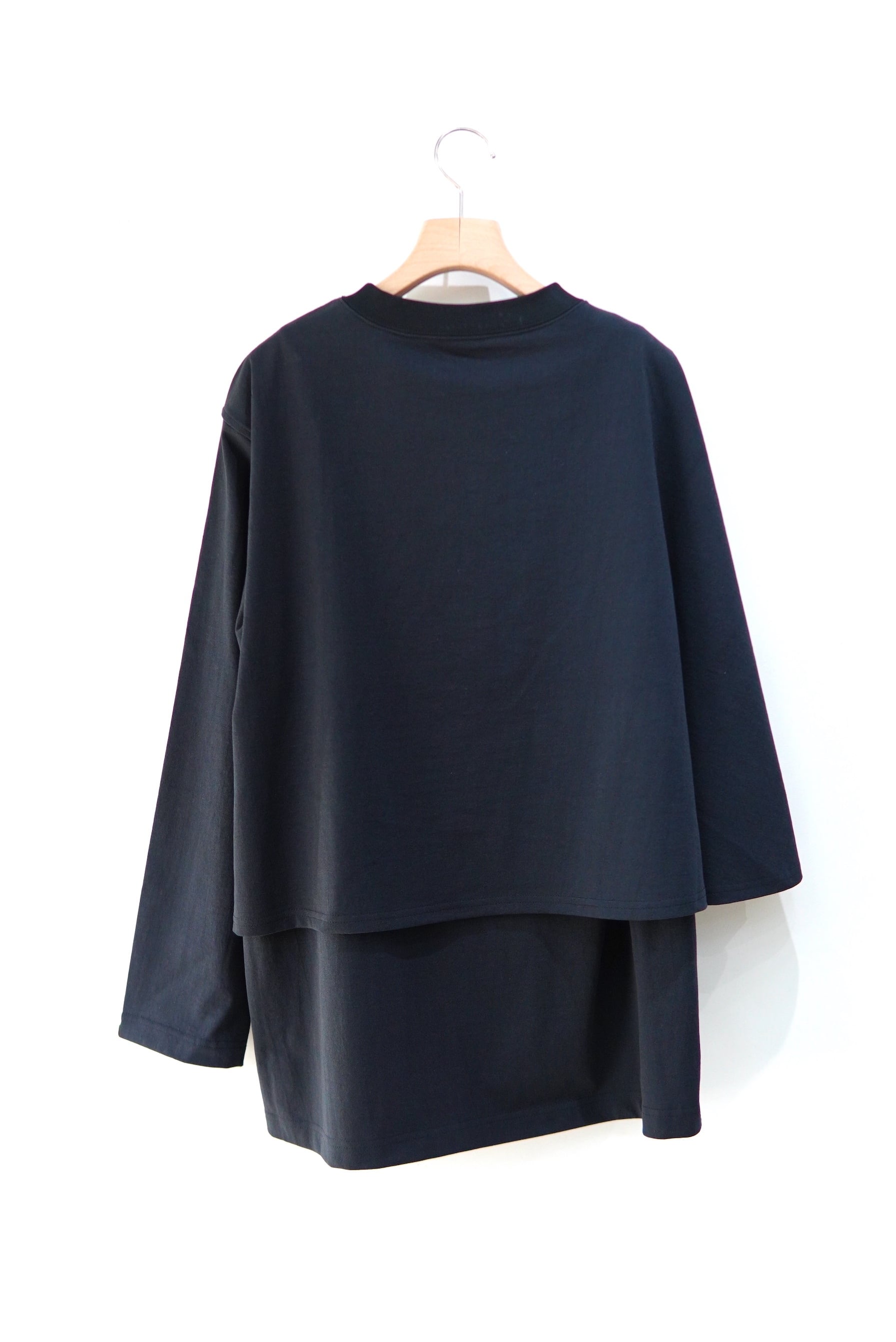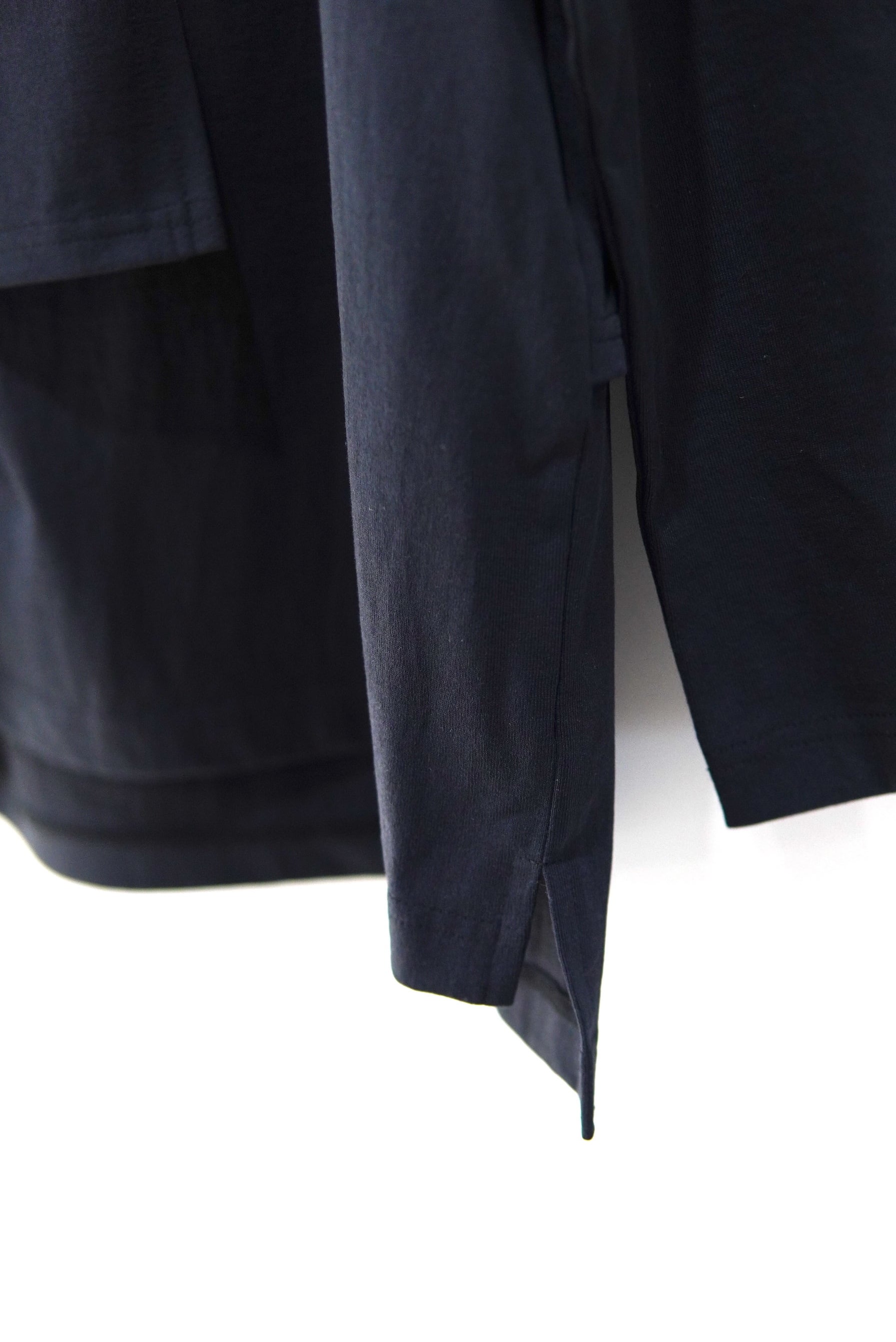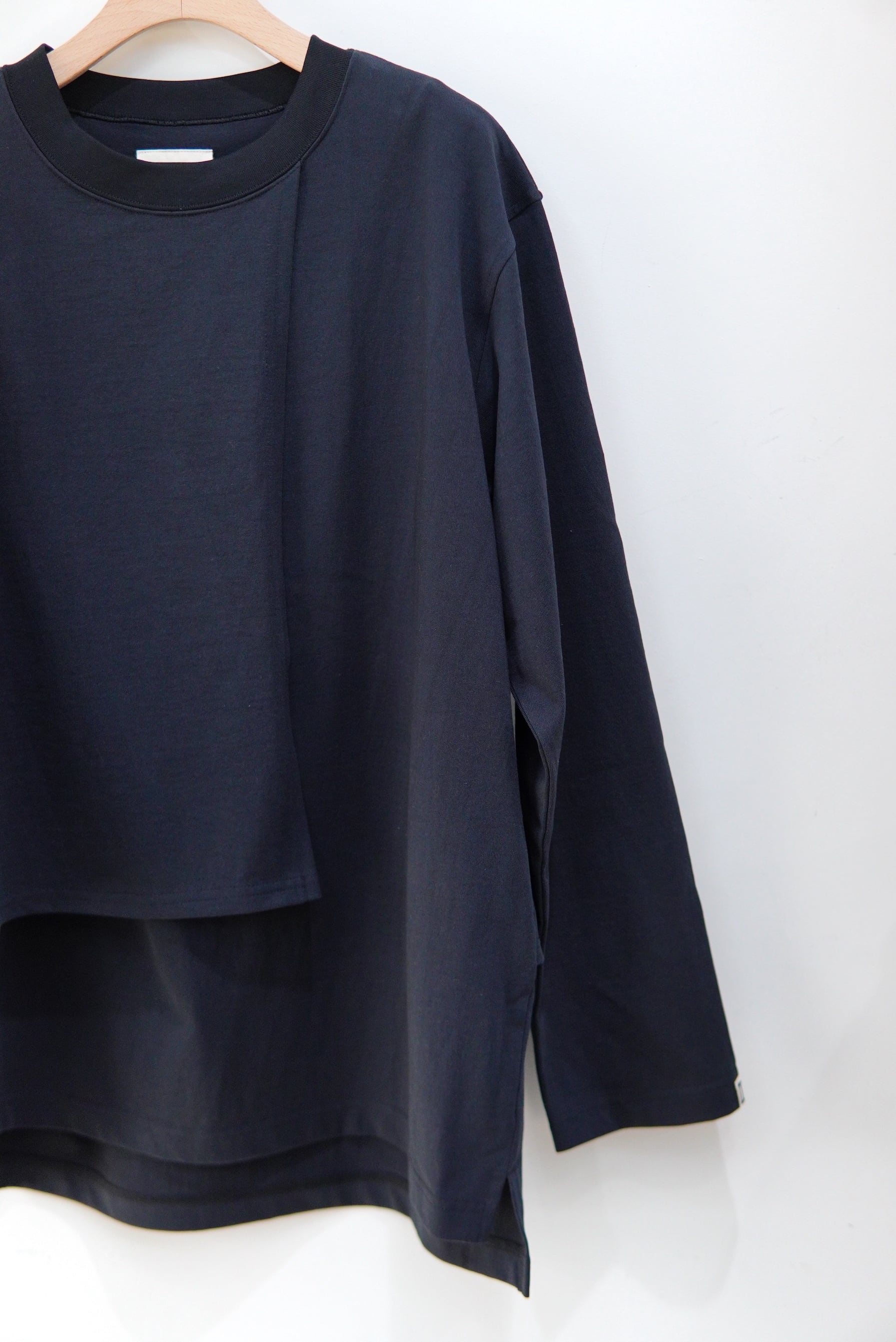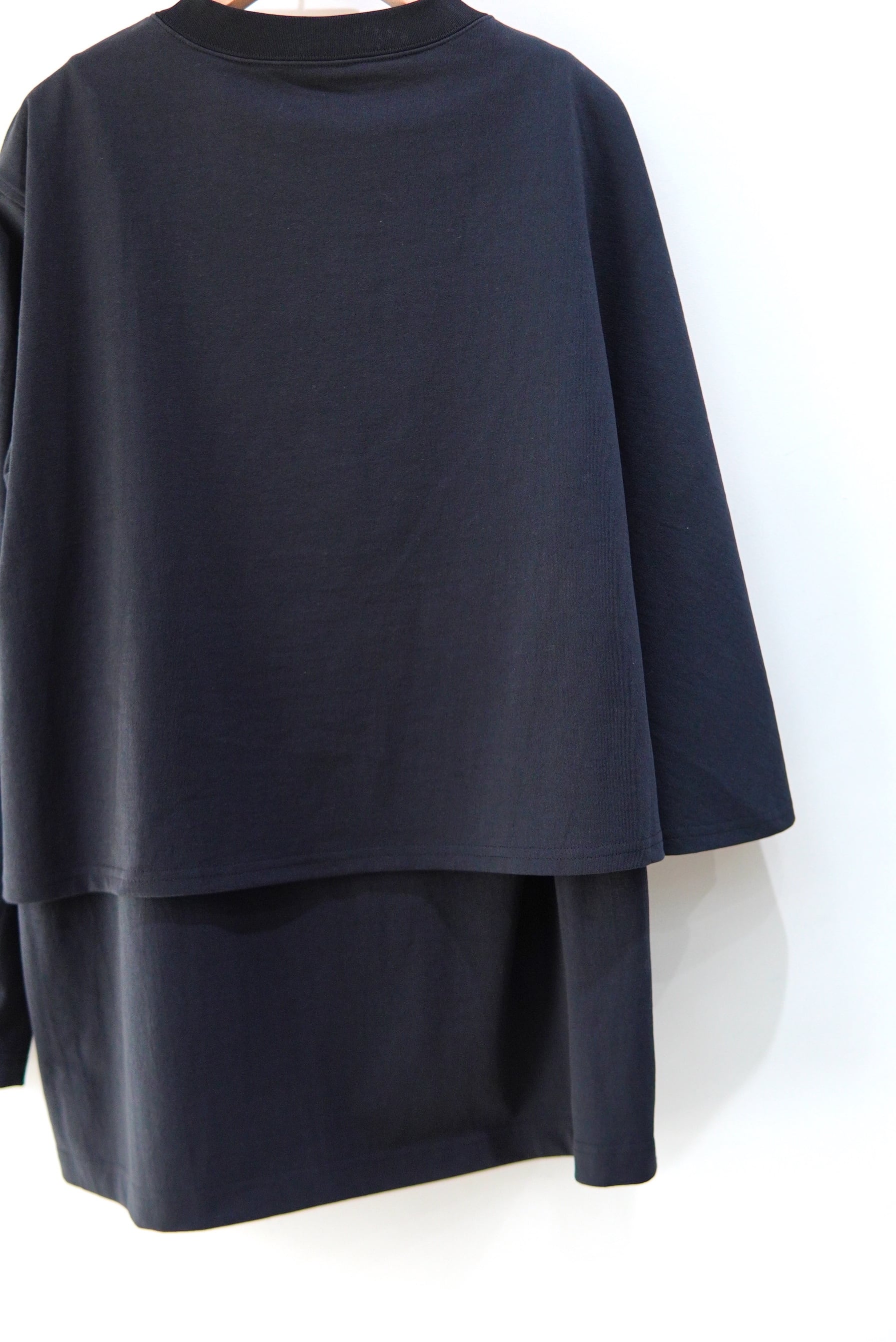 コットン素材のクルーネックに、ガンフラップとアンブレラヨークをレイヤードしたデザイン。