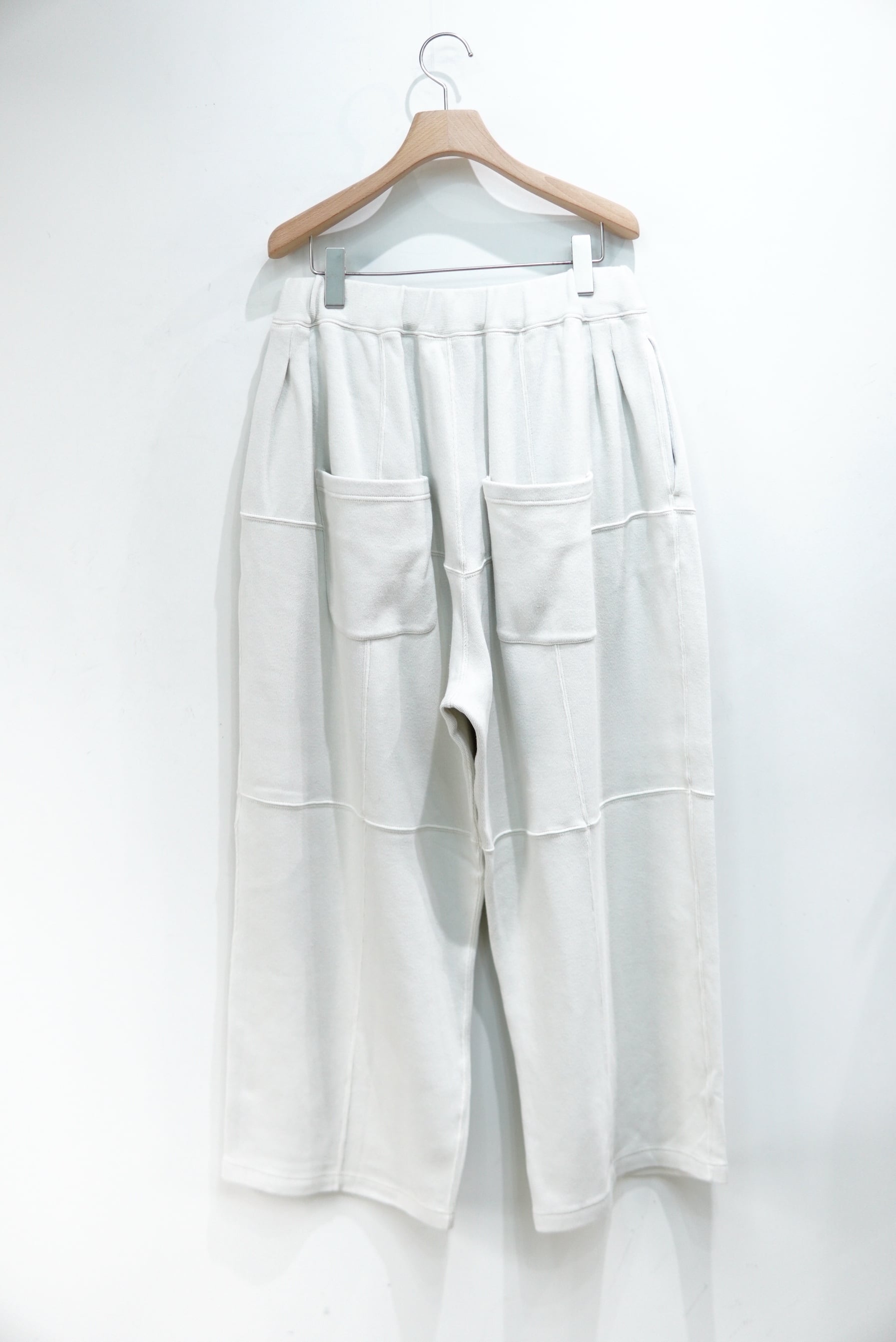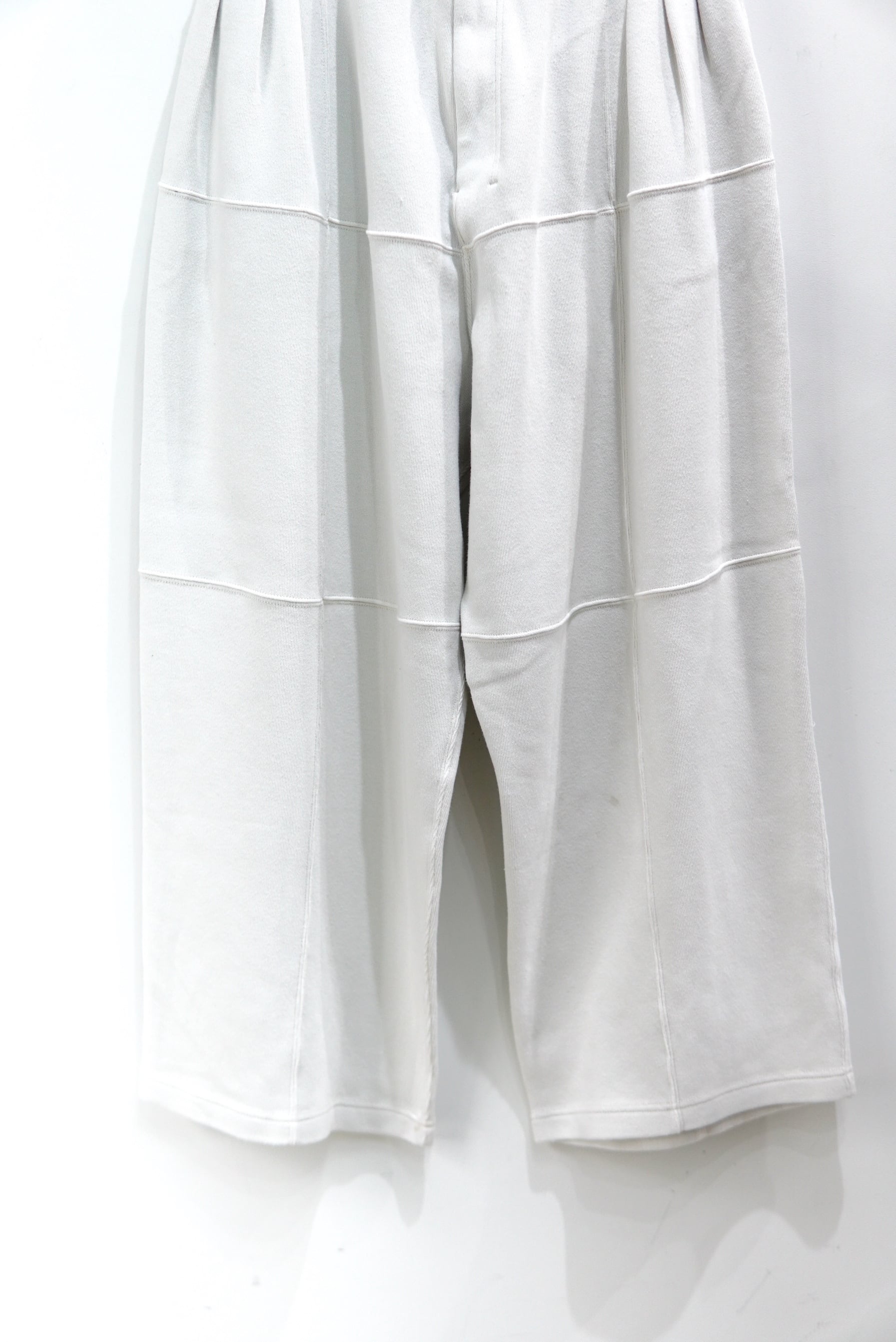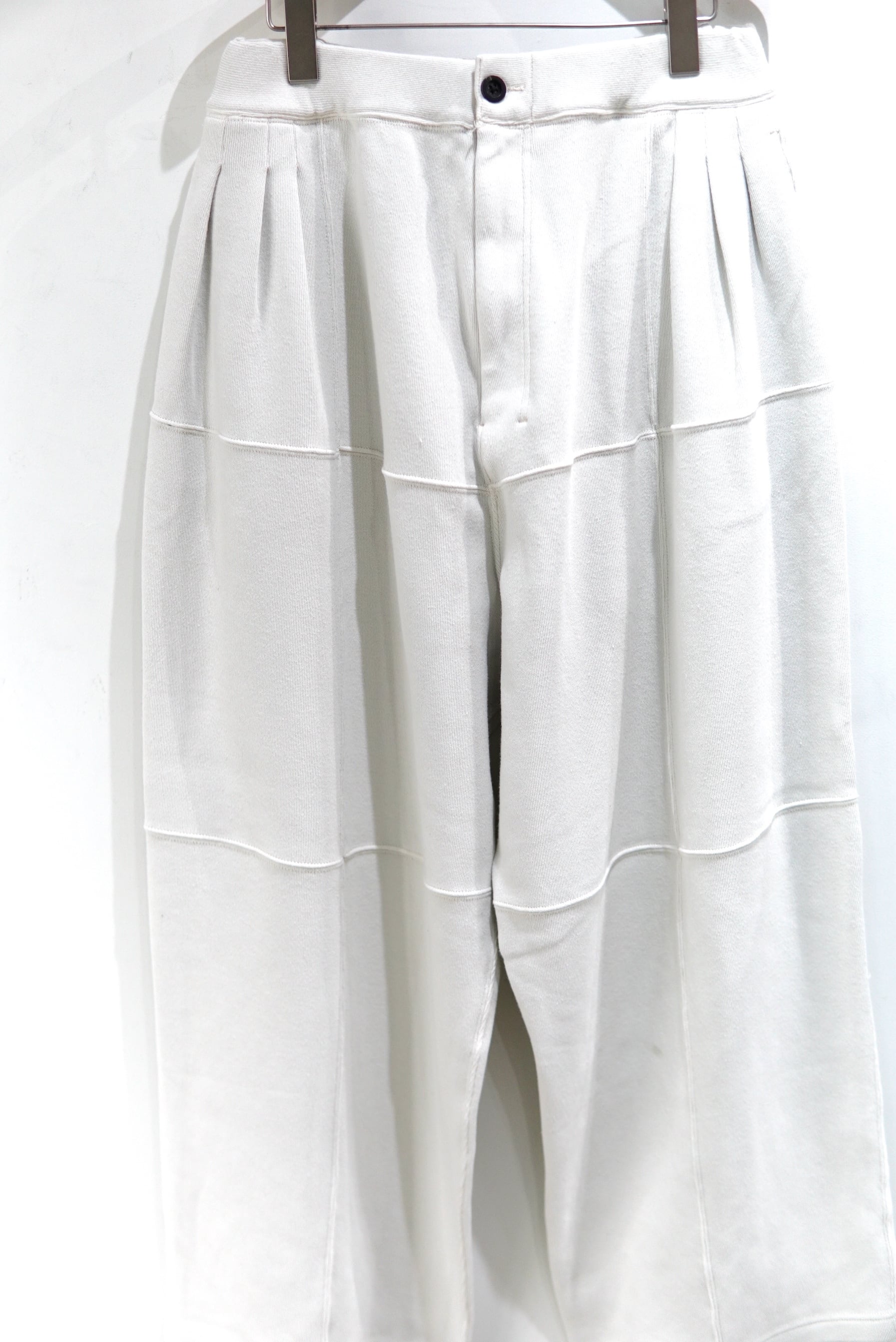 パネルでの切り替えを駆使し、立体的な表情を作ったスムースニットのパンツ。
