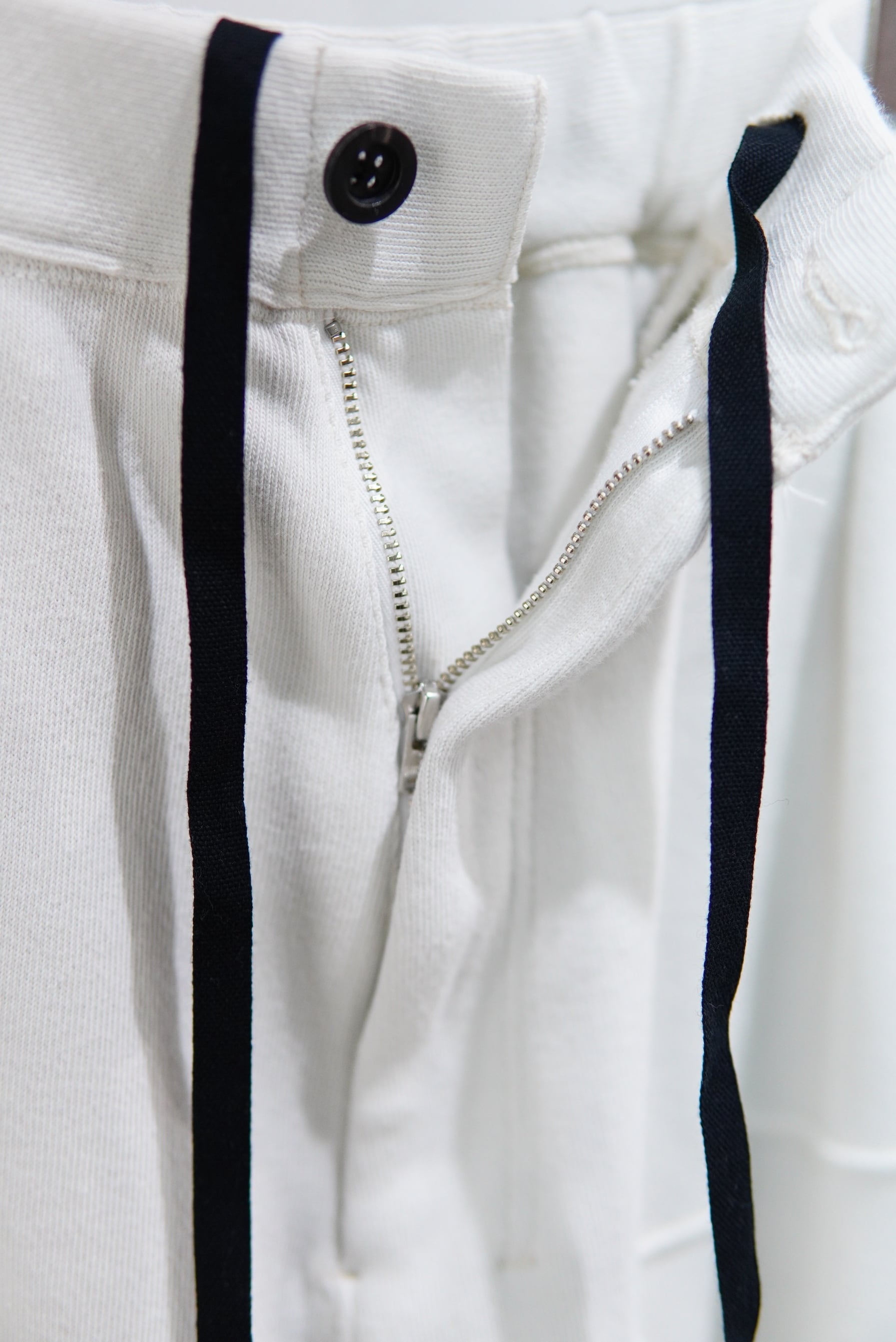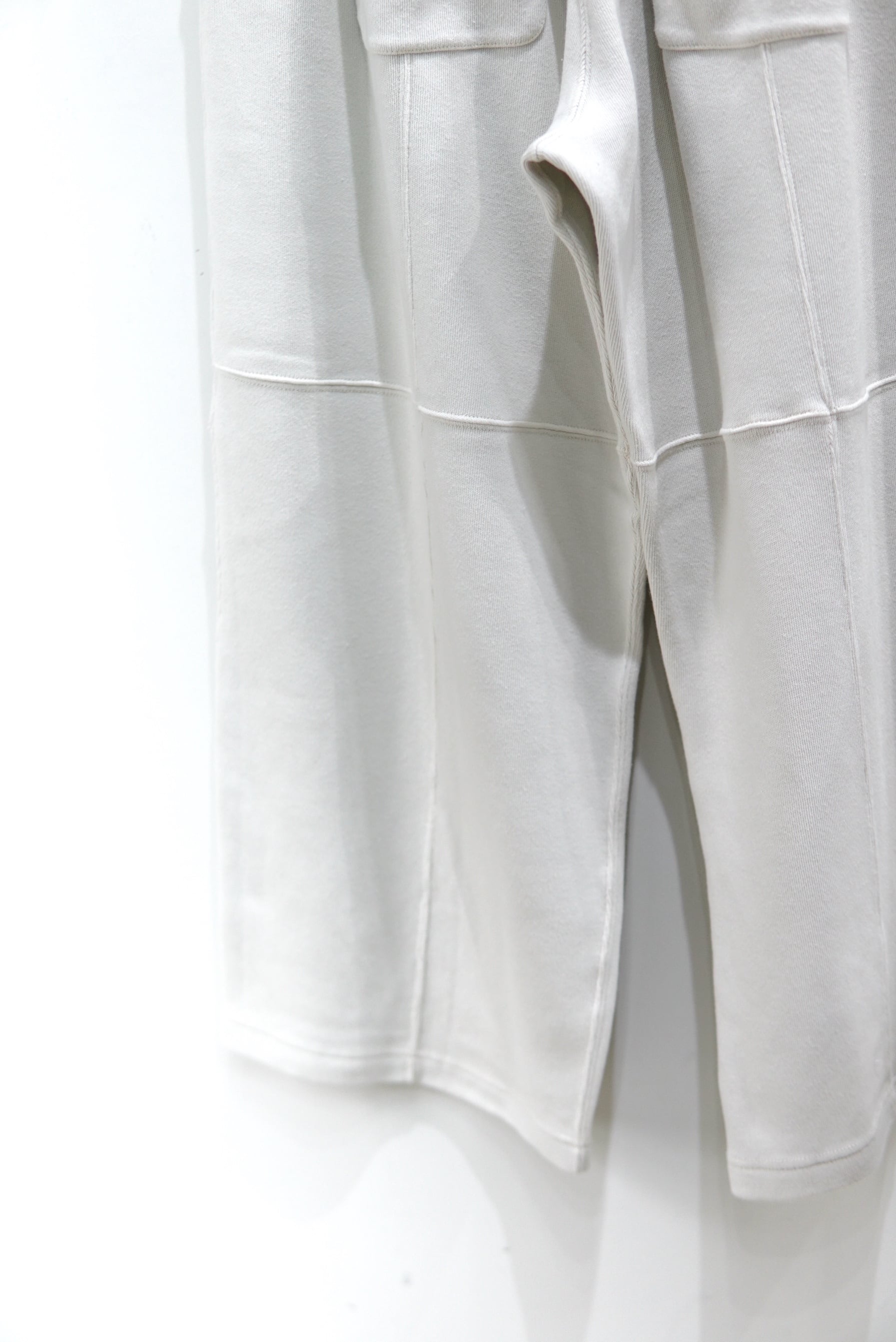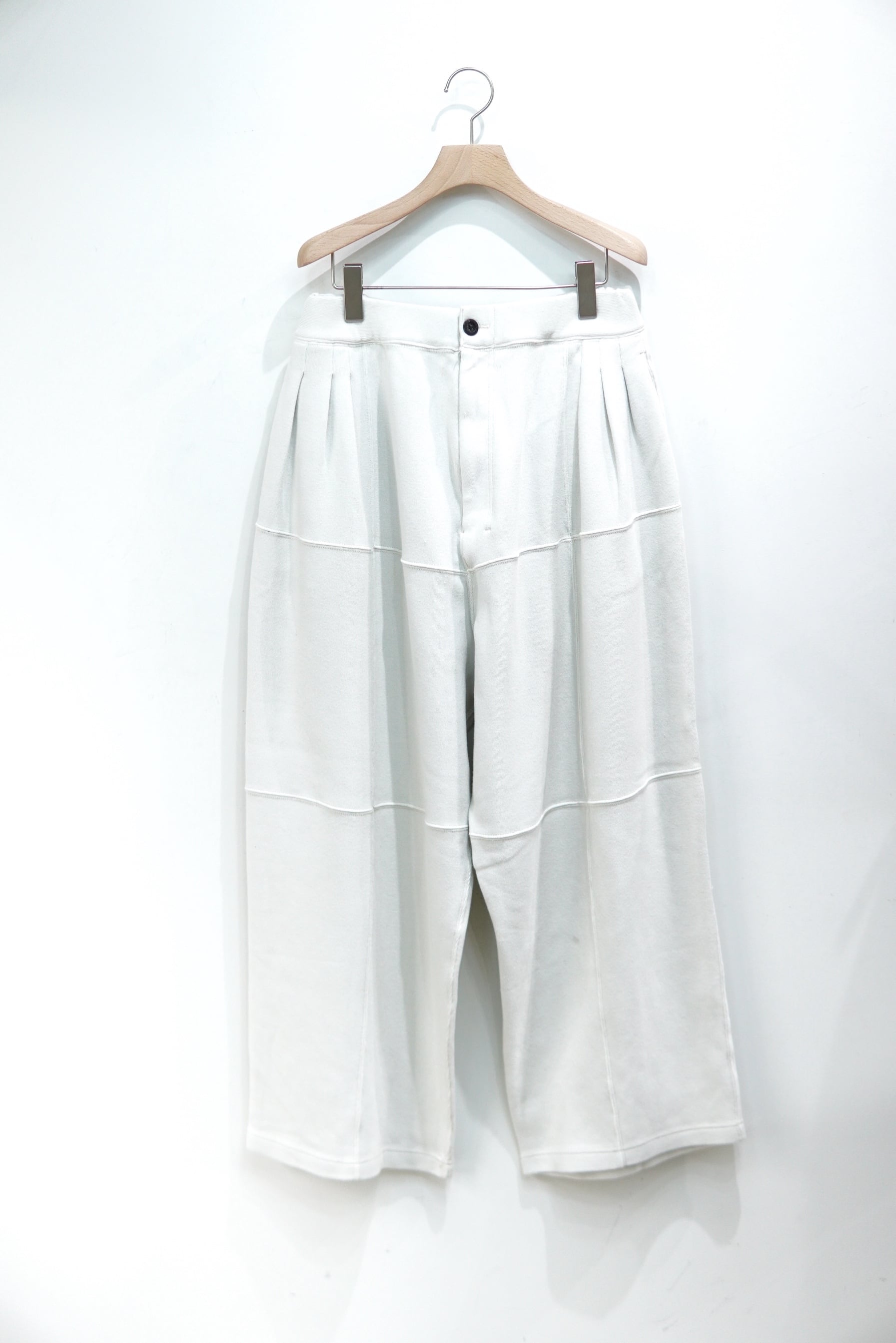 パネルでの切り替えを駆使し、立体的な表情を作ったスムースニットのパンツ。