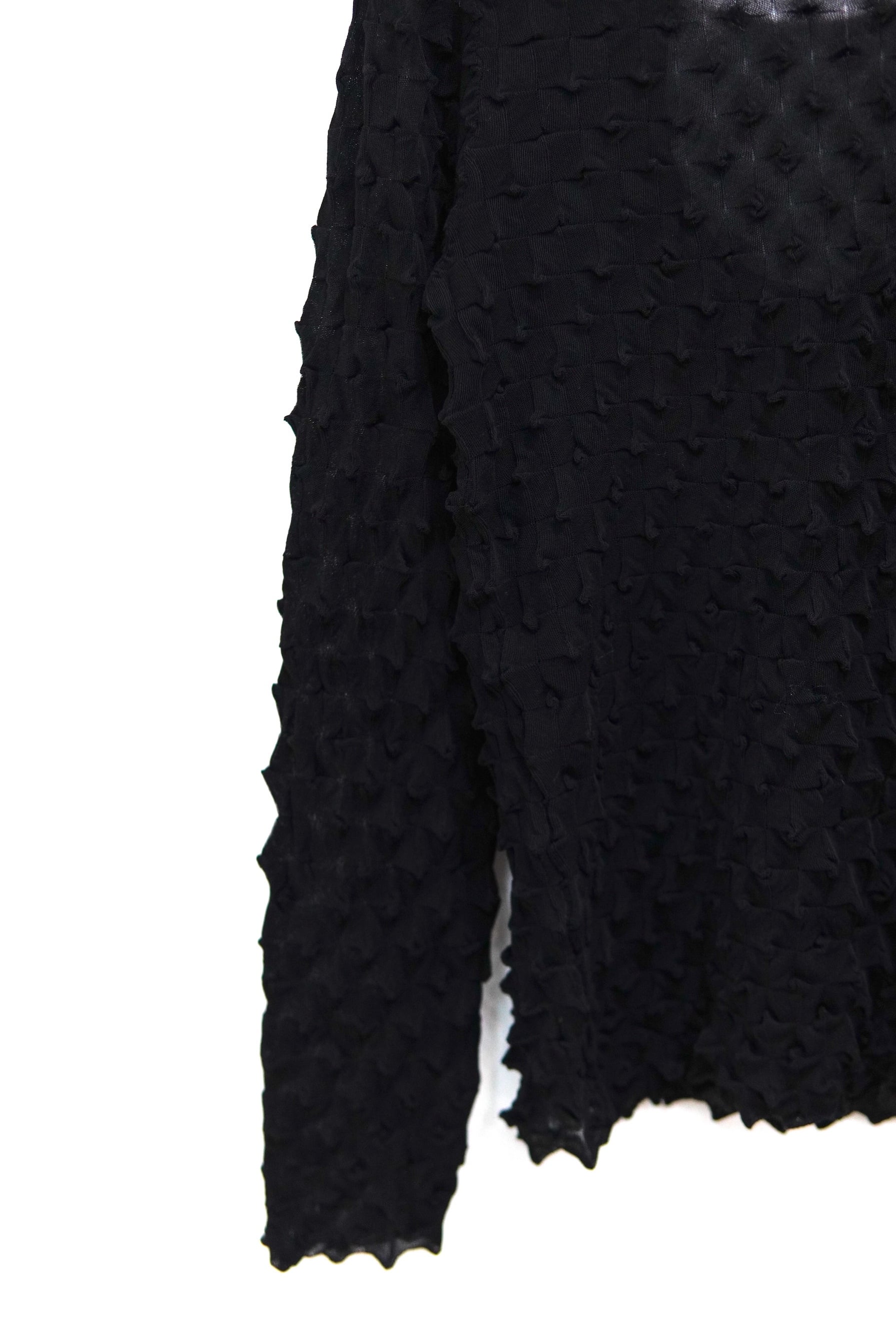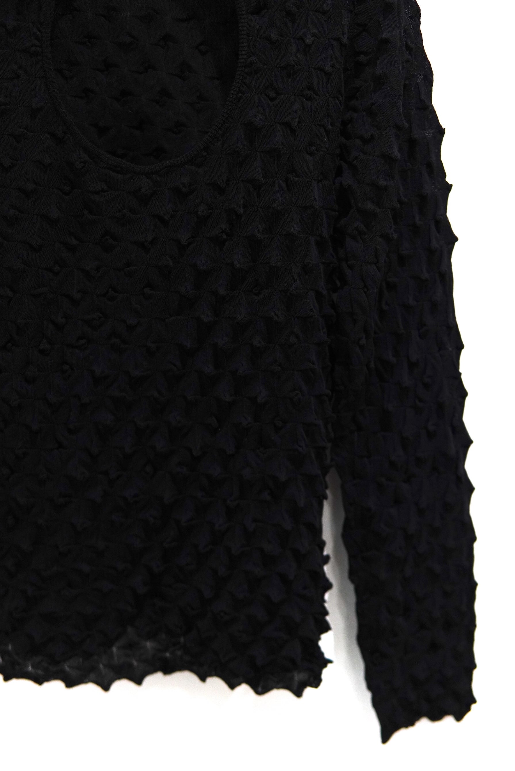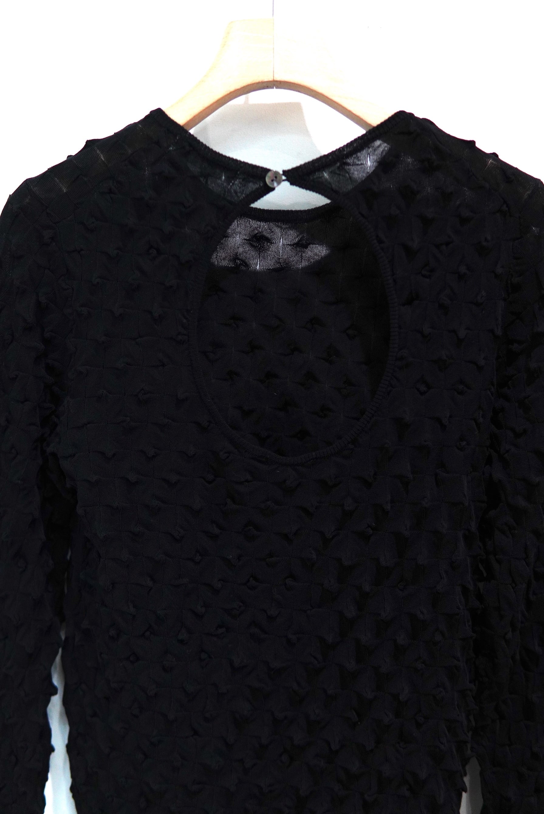 綿紡績の伝統を誇るスイス SPOERRY(スポエリー)社 が開発した、化学繊維や後加工を一切施さずに接触冷感機能を備えた綿素材を贅 沢に使用。特殊なZ撚り糸を用い、斜行の特性を活かして編み上げた独自のテクスチャーは、まるでドリアンを思わせる立体感を持ち、 OPEN SESAME CLUBのアイコンを象徴するモードな存在感を放ちます。