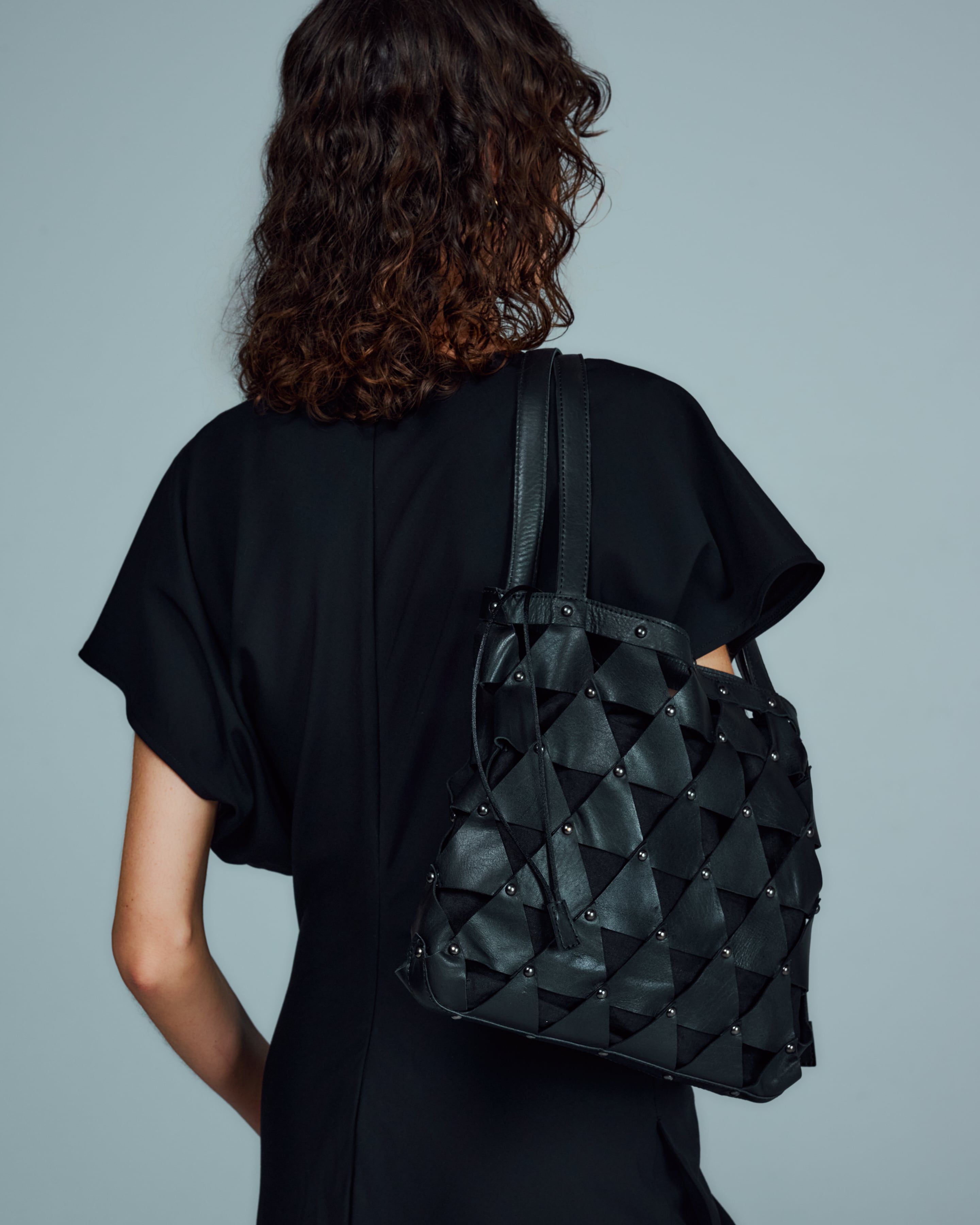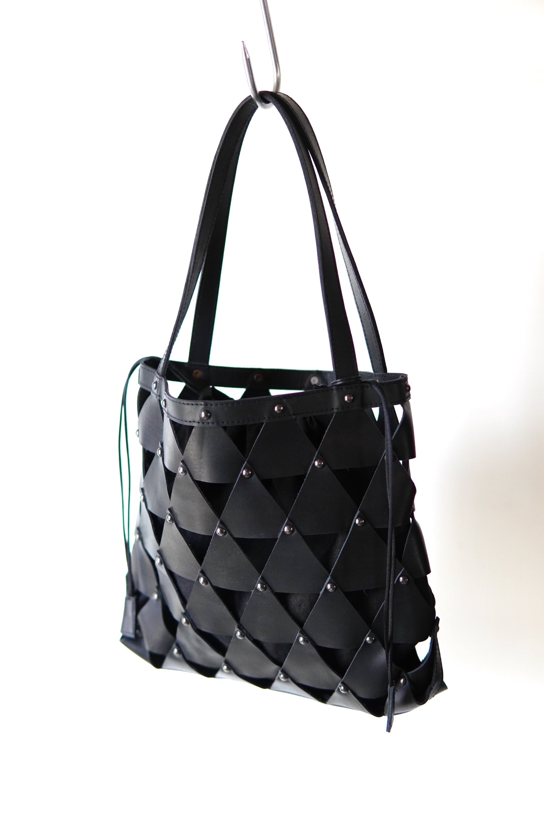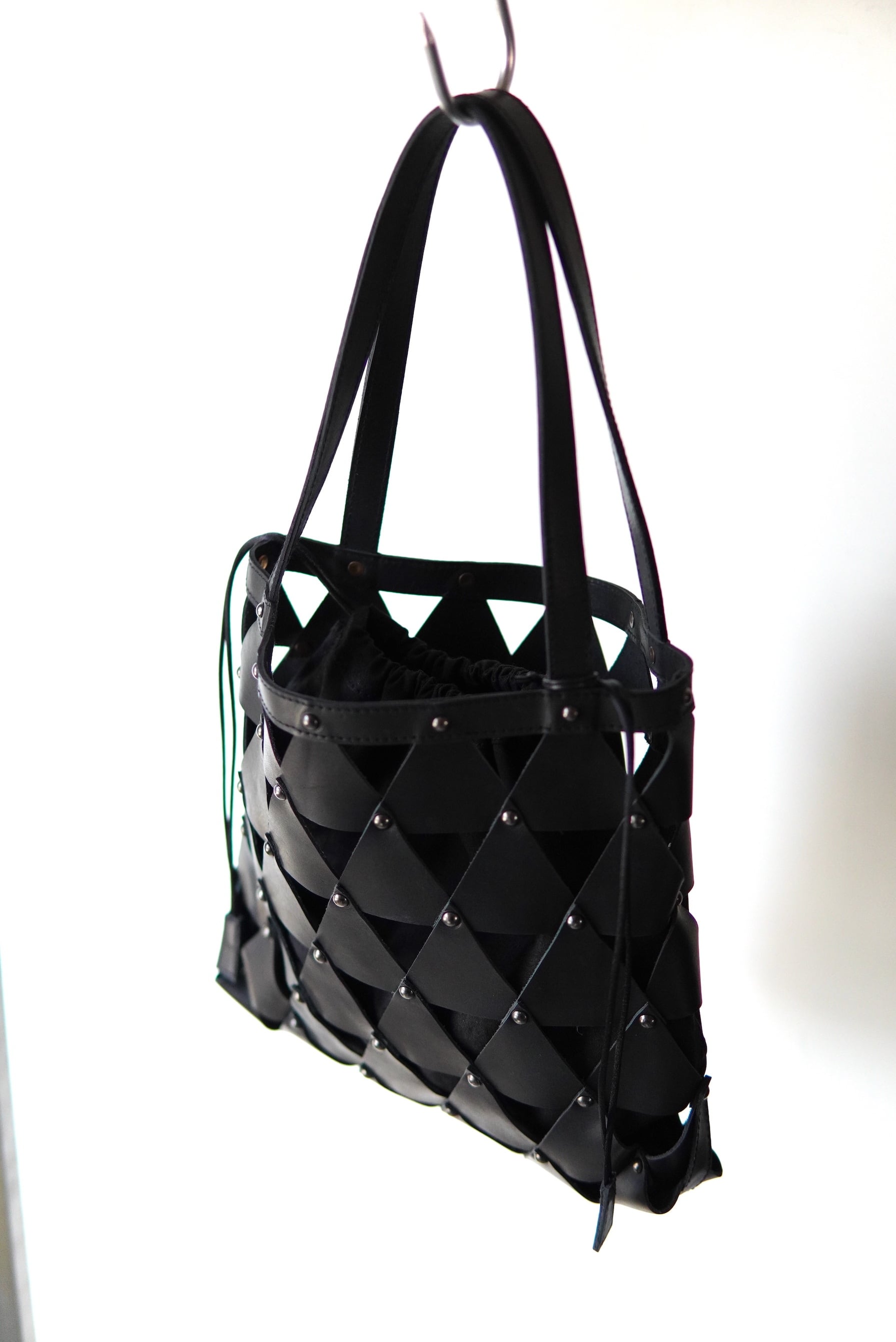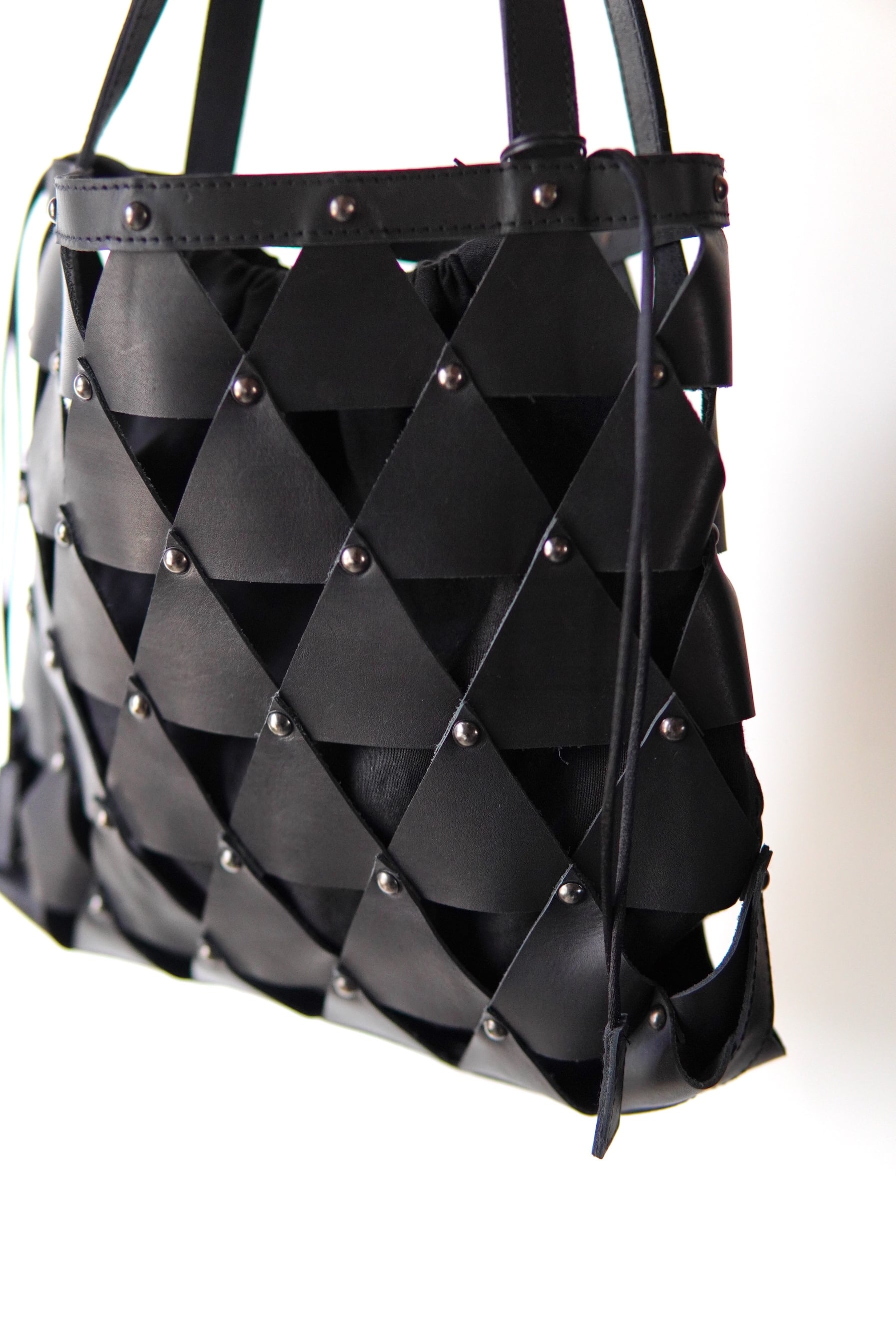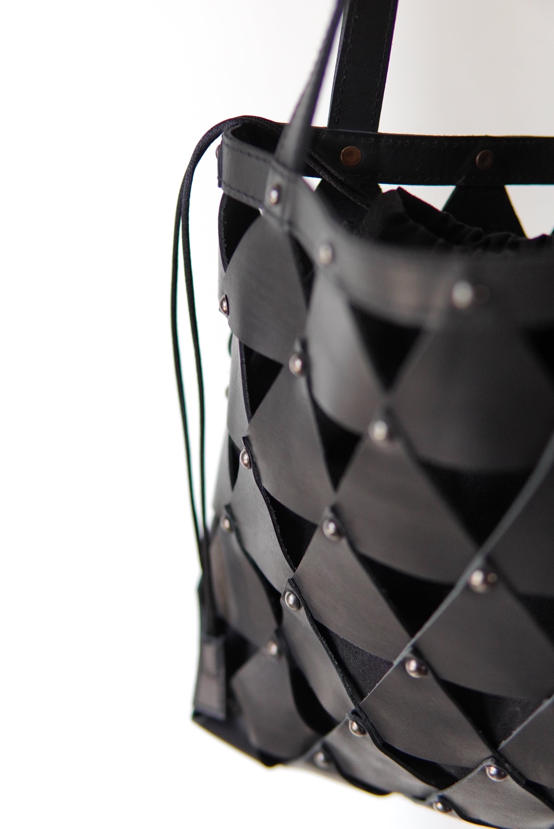クラフト感溢れるカウレザーバッグ。 トライアングルモチーフだけで構成されたデザインが特徴のバッグ本体部分は、ほとんど縫製をせずカシメで止めて形成しています。 革は使い込む程にツヤが出る耐久性に強いCOW NAPPAを使用。 和紙リネンの内袋にはポケットもあり、巾着状になっているため使い勝手も良い仕様になっております。 MATERIAL 100% COW LEATHER 袋 54% PAPER 46% LINEN SIZE 縦 約25cm 横 約29cm 幅 約5cm