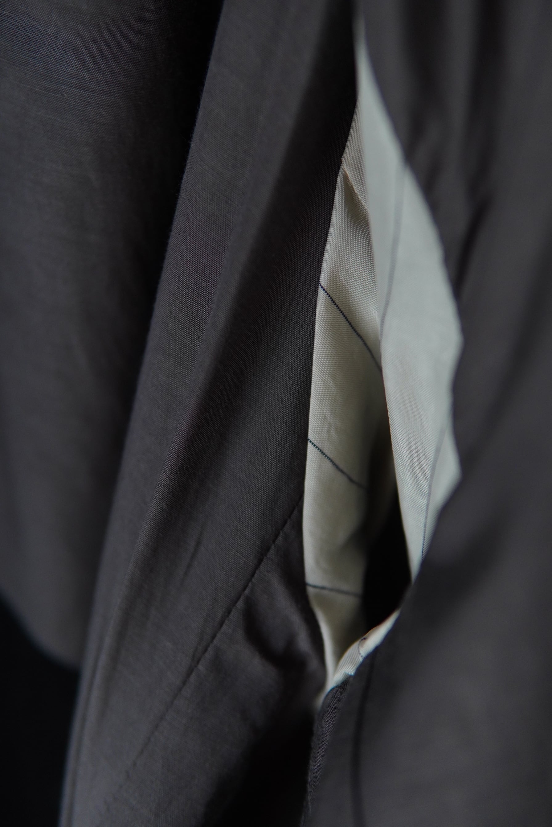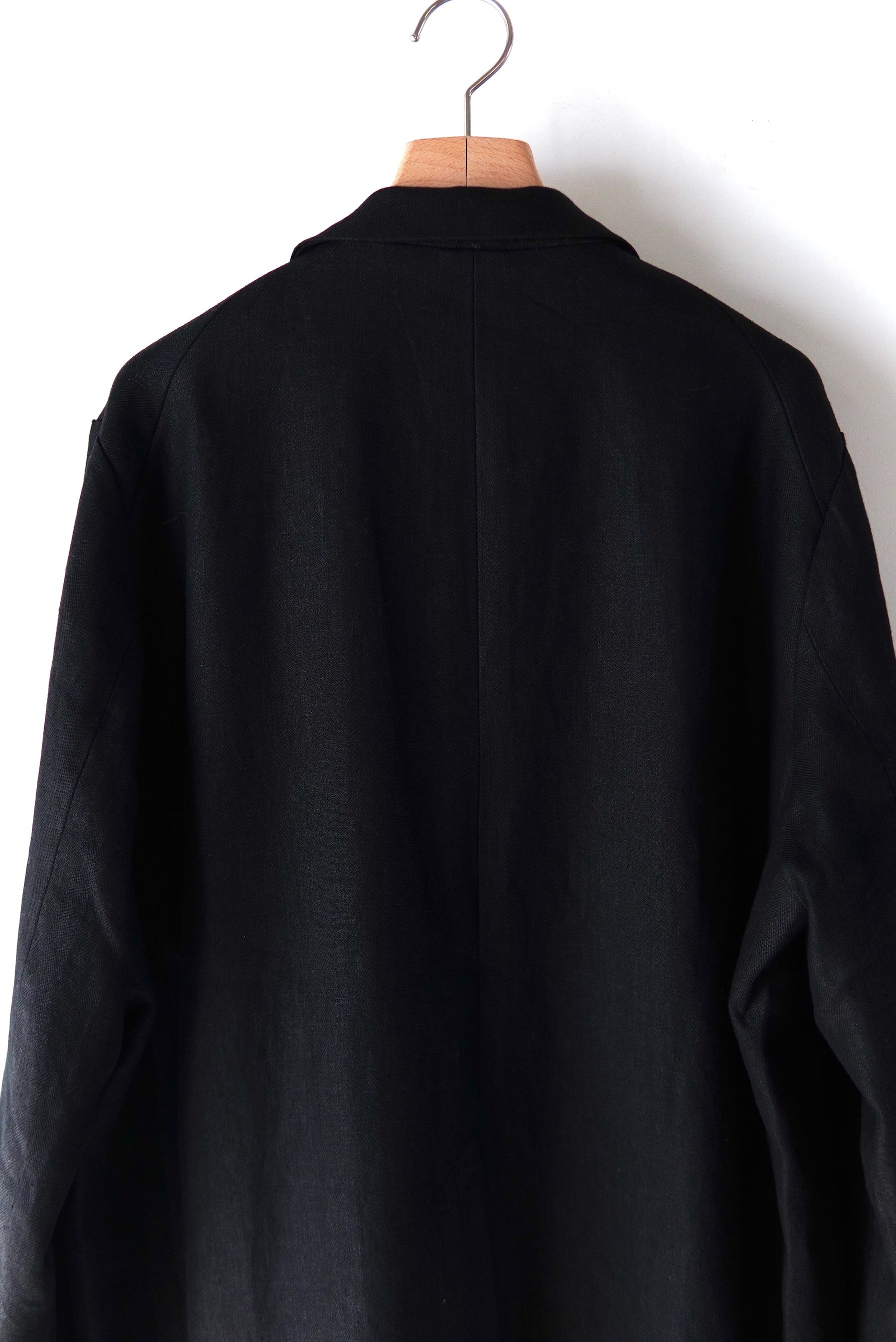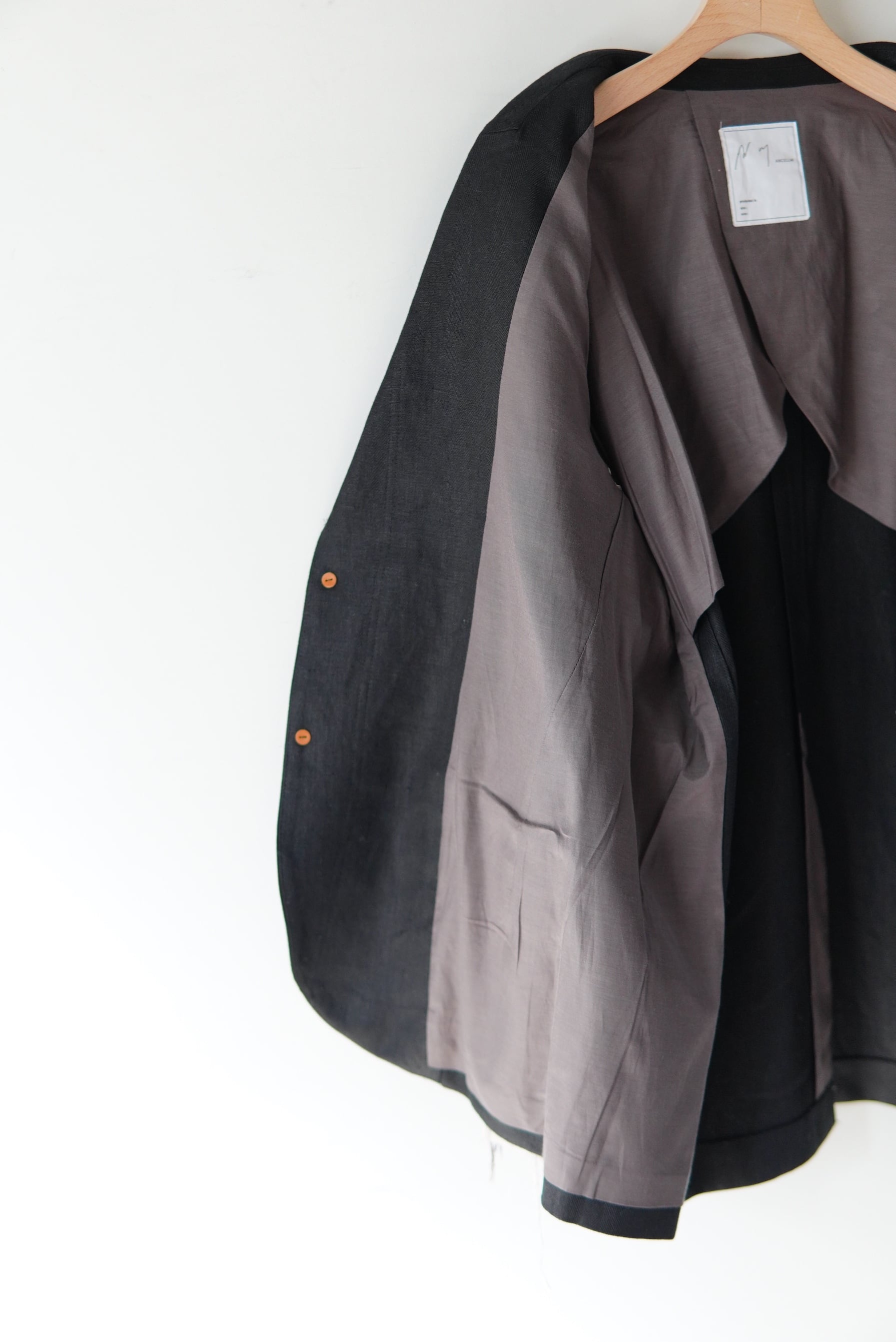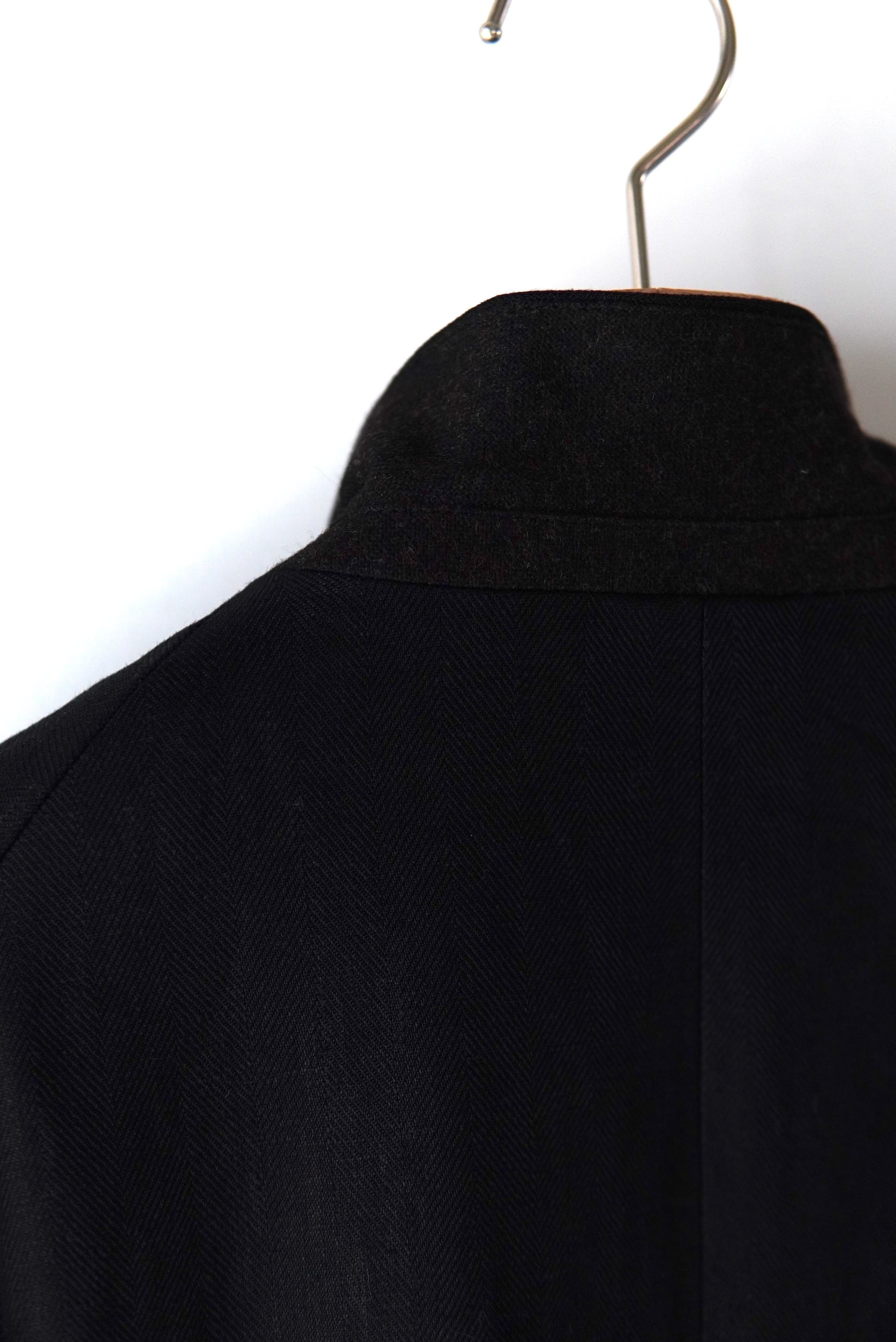 フロントからラペルまでボタンを連ね、ボタンの掛け方次第で多様にスタイルを楽しめる仕様と致しました。衿を立てるとスタンドカラーに変わり、衿裏で切り替えた生地がアクセントとなります。