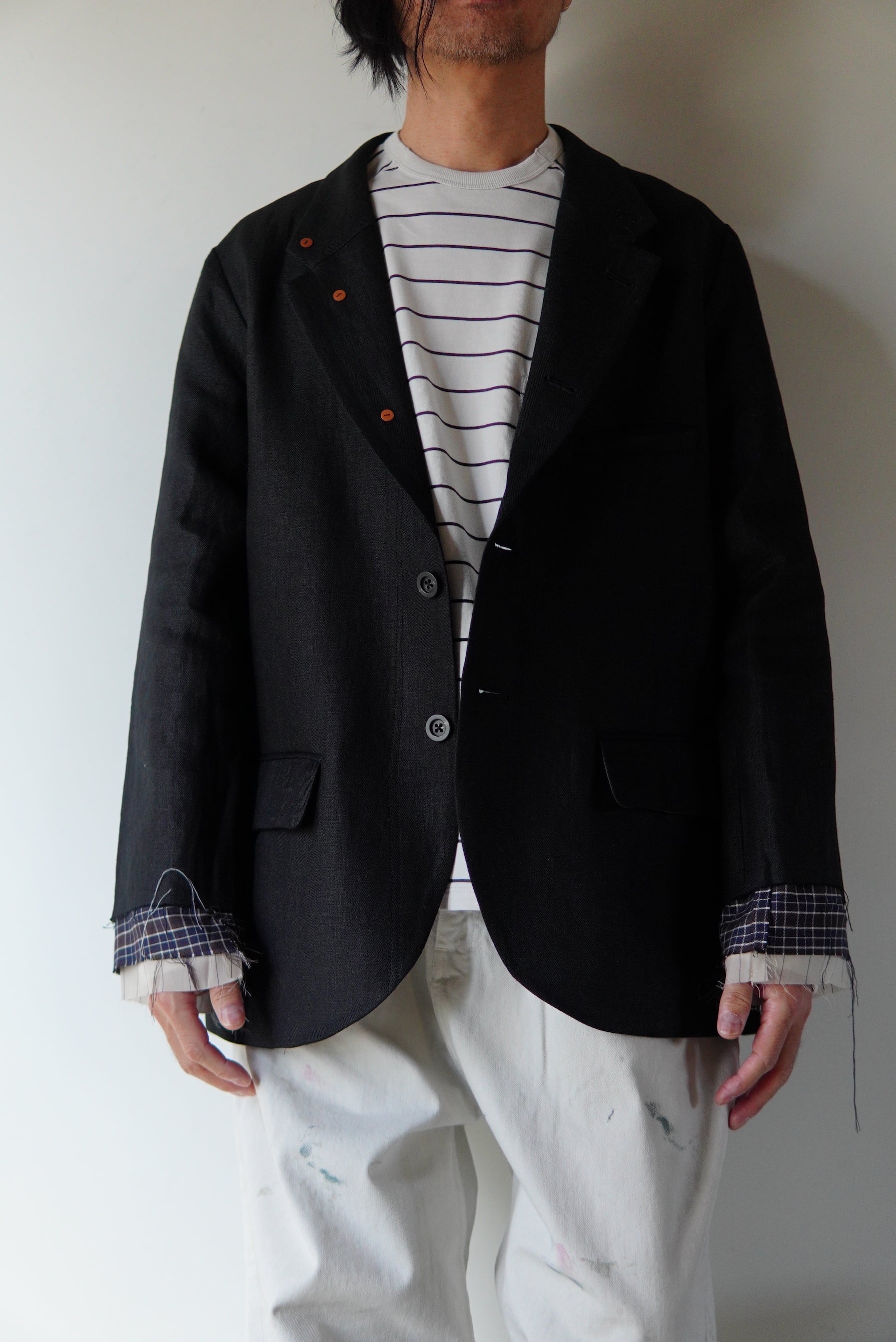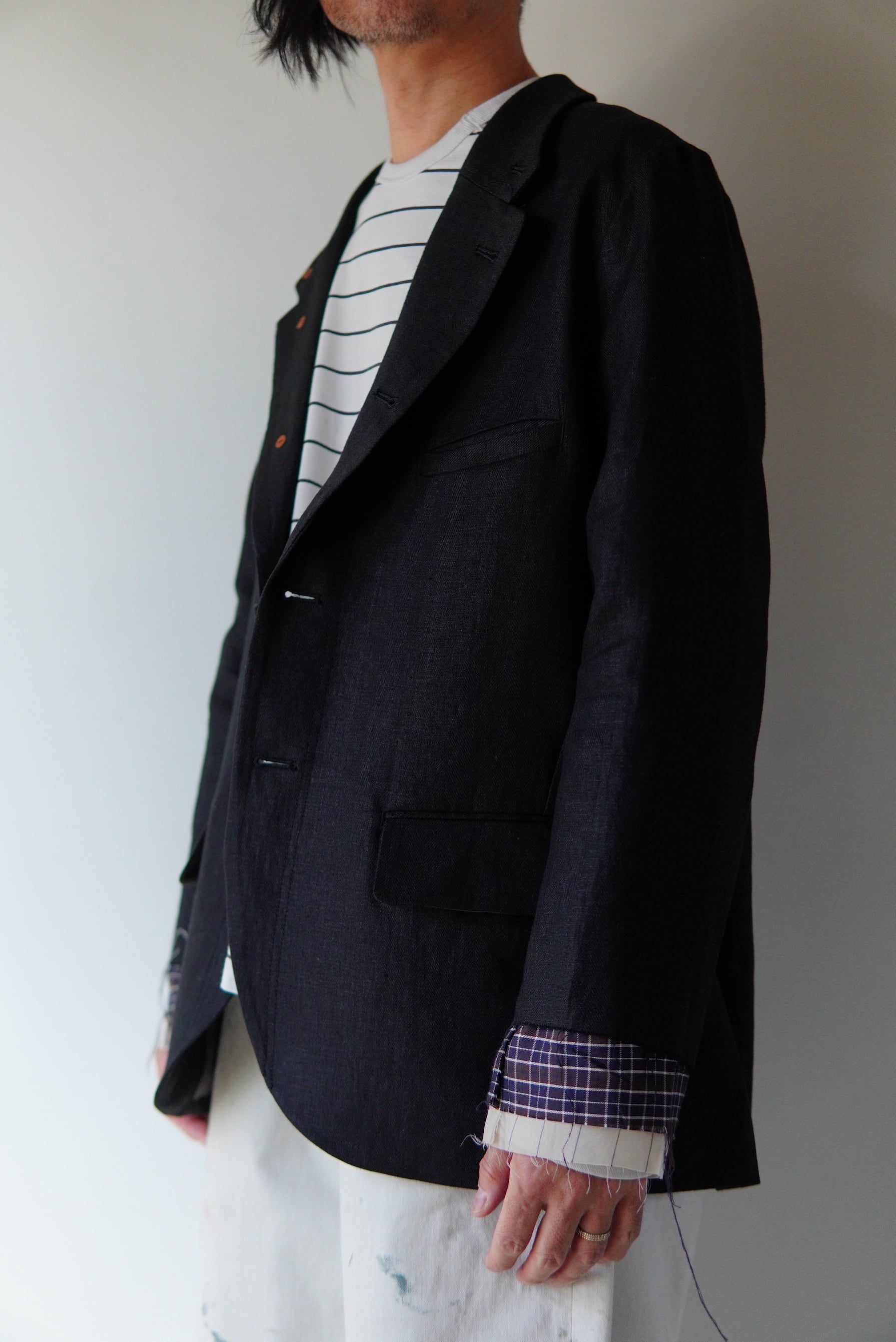 艶と表情の美しいリネンを使用した、フェイクレイヤードのテーラードジャケット。
