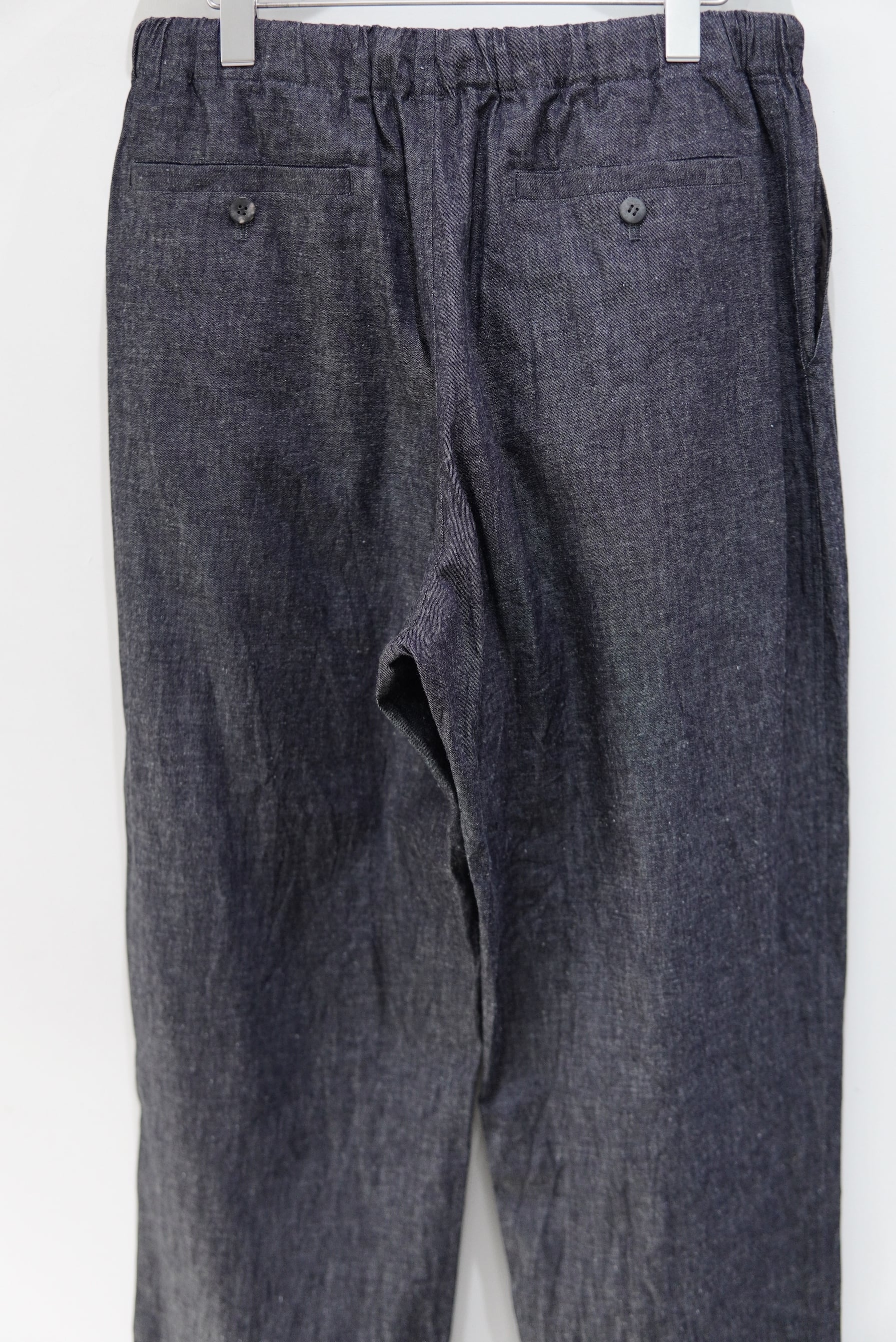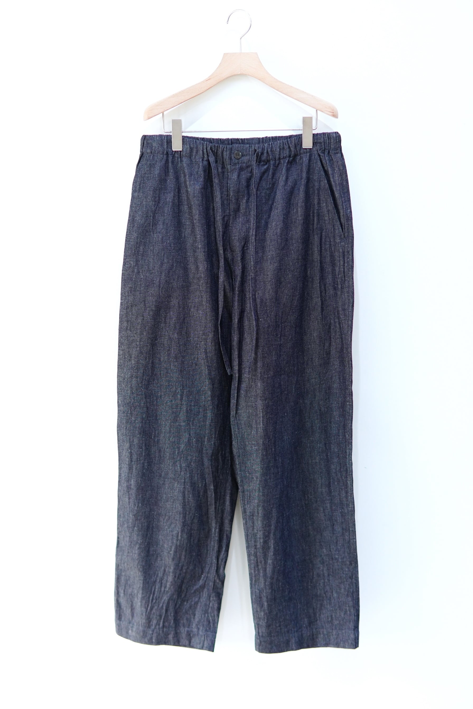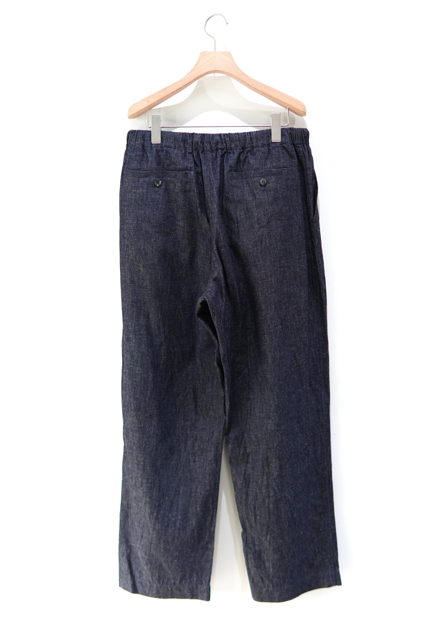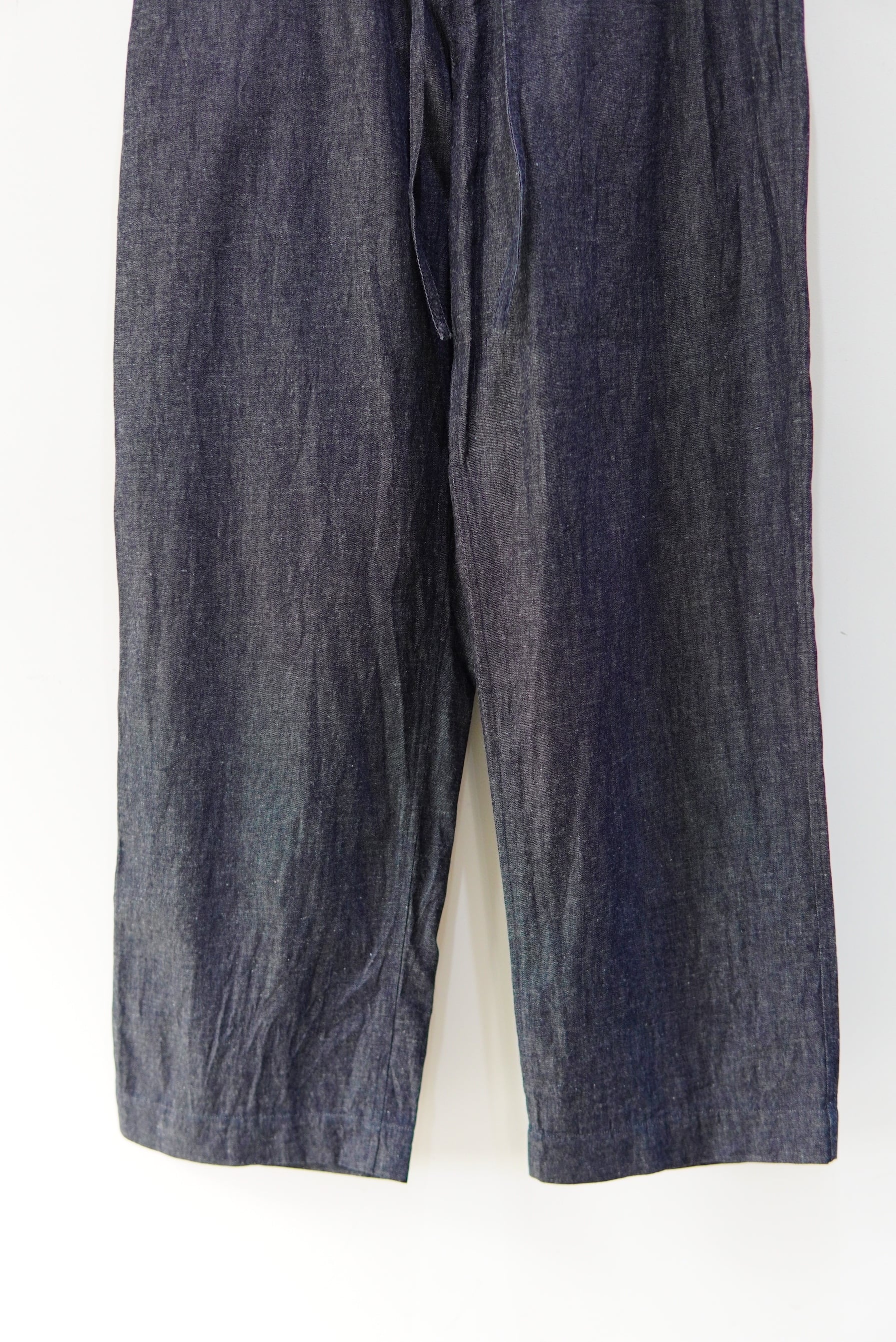 cale コットンリネンとラミーのとても軽めな素材感のイージーデニム。 若干のワイドテーパードのスラックスのようなシルエット。 サマーニット、シャツなどに合わせて頂けるパンツです。