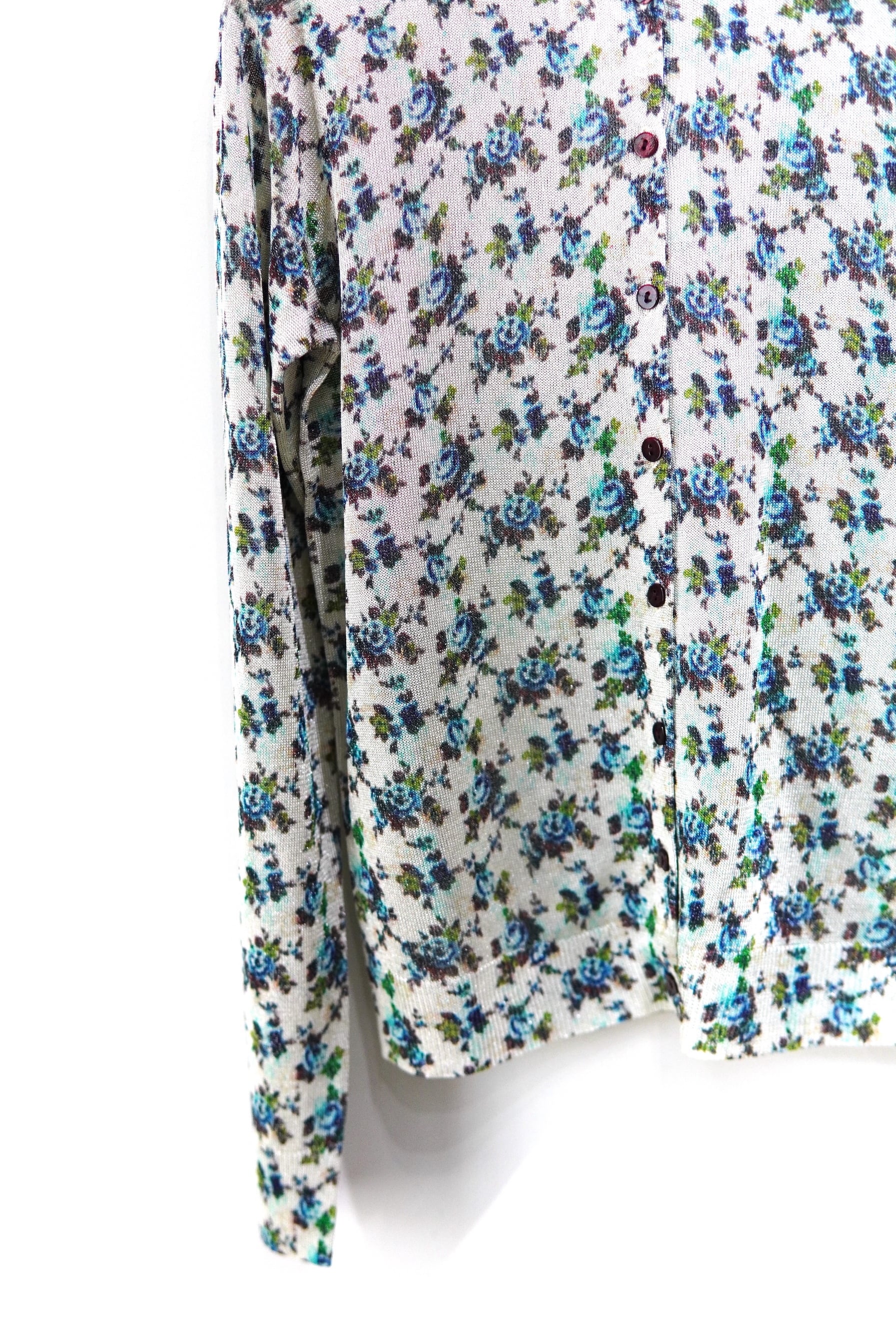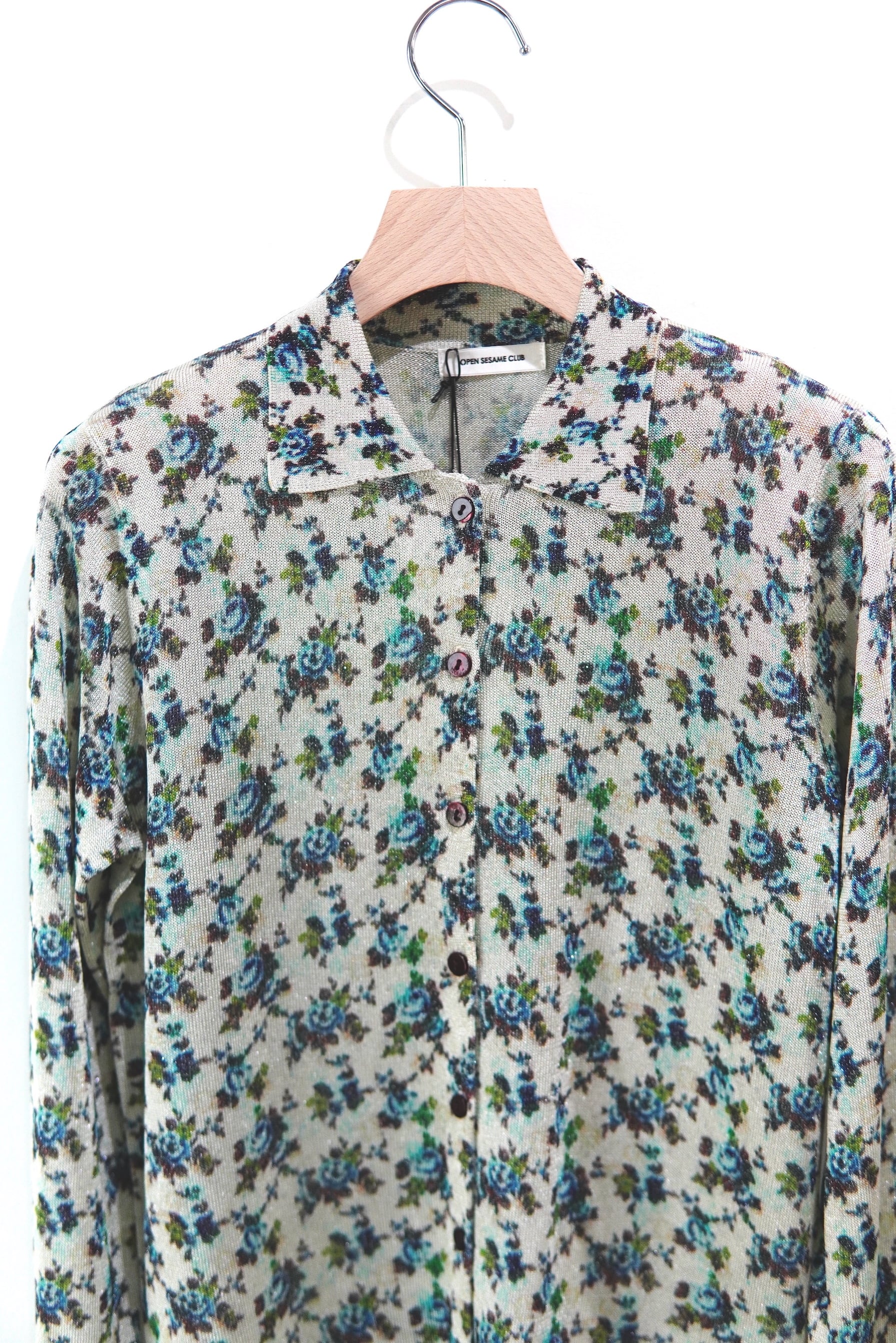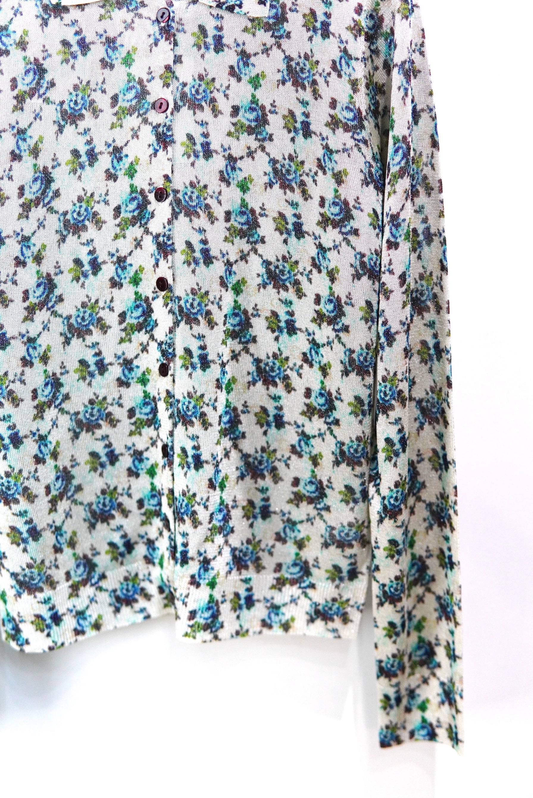 ヴィンテージプリント ニットシャツ。 ひんやりとした落ち感のあるラメ糸で編み立て、さらにその上からプリントを施した特別な一枚。 プリントはヴィンテージスカーフやテキスタイルの断片をもとにオリジナルで起こした柄を採用。 布帛にはない柔らかな落ち感とニュアンスが、装いに奥行きを与えます。 MATERIAL VISCOSE89%Polyester6%Nylon5% SIZE FREE ニット素材で収縮性がございますので幅広く着用いただけます。