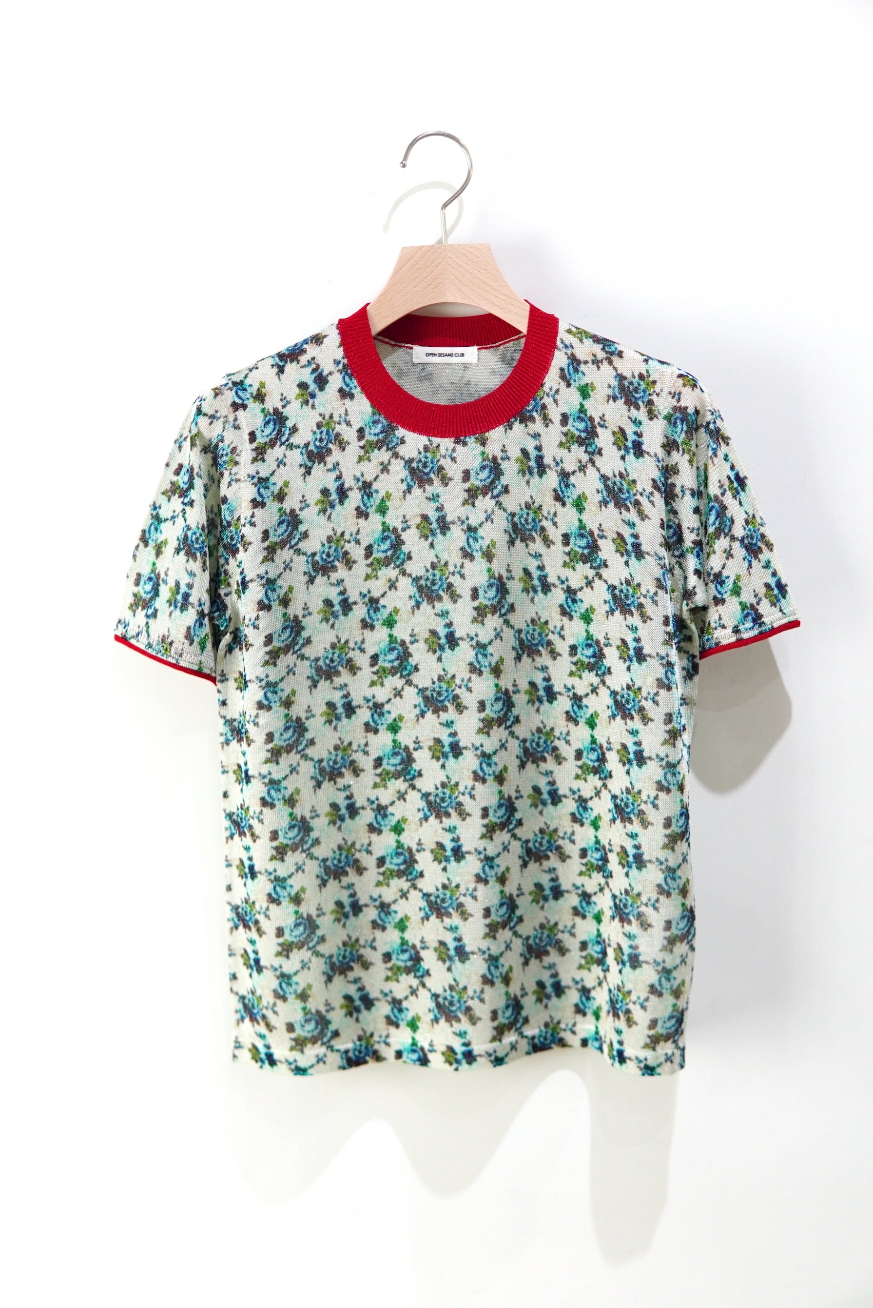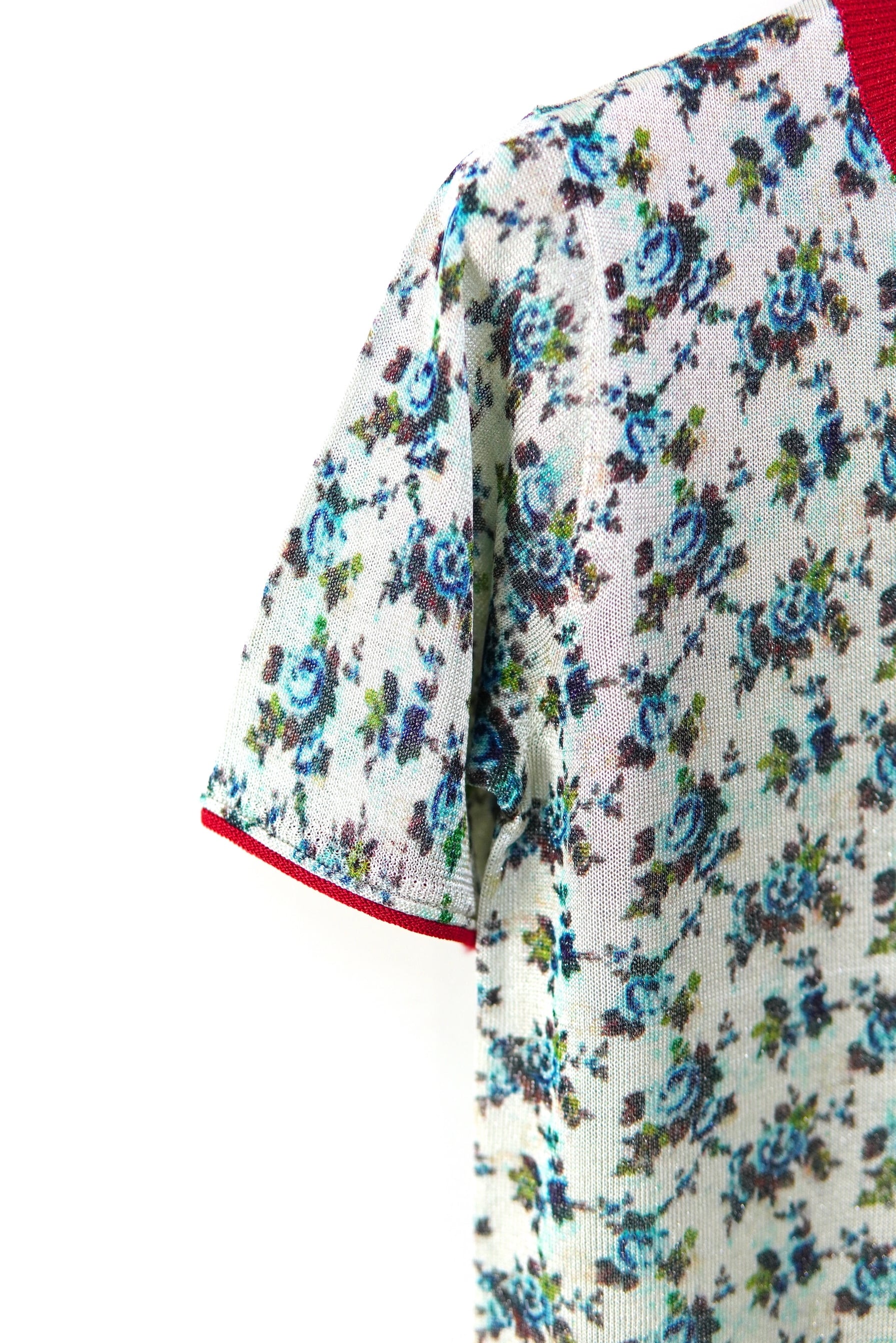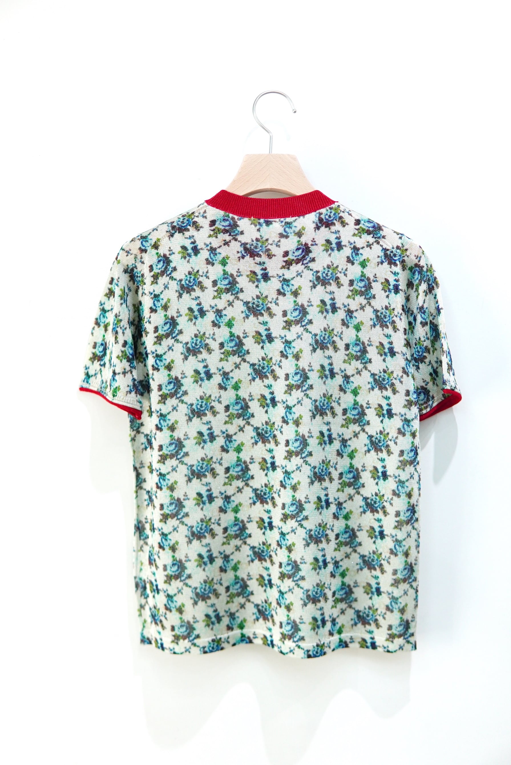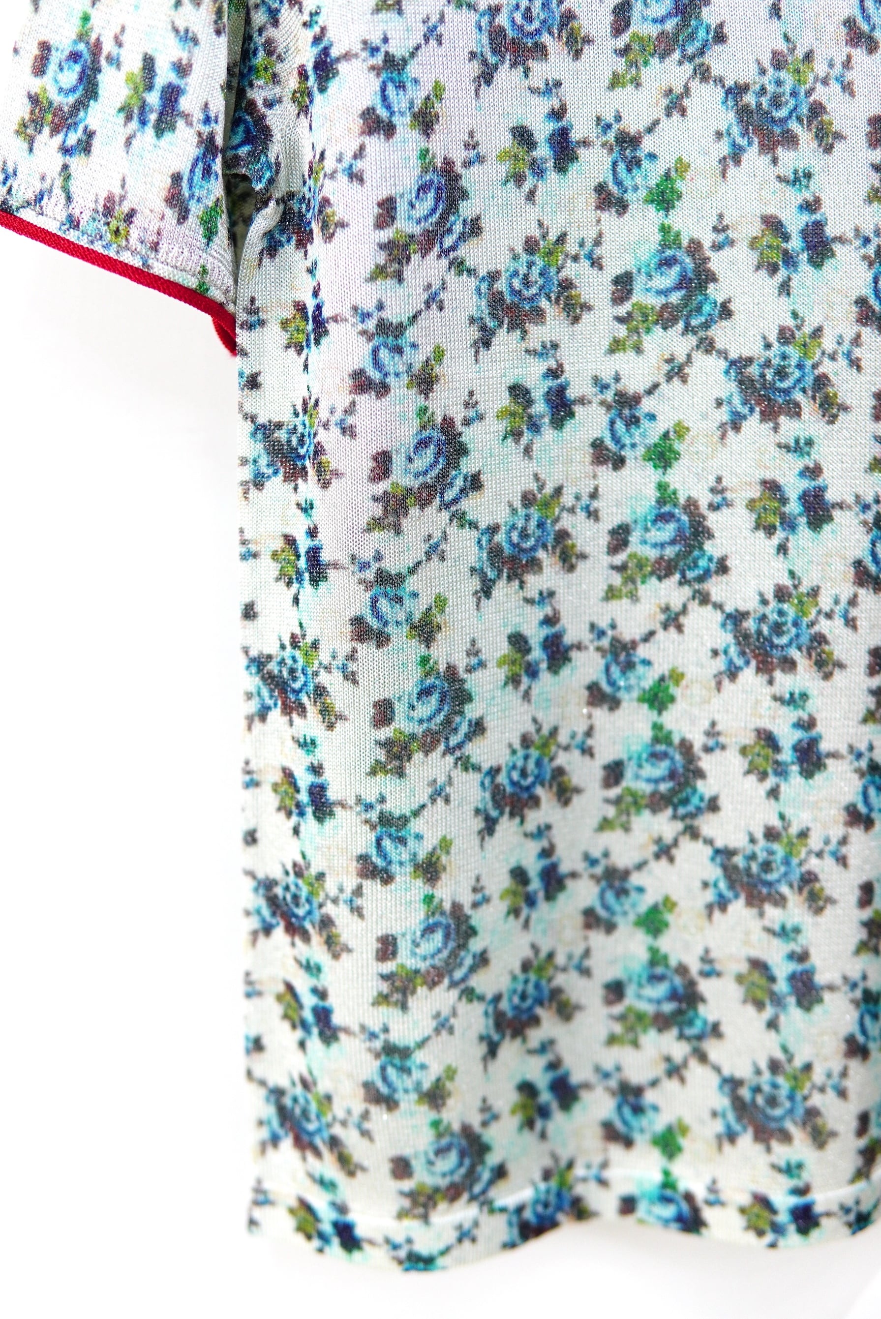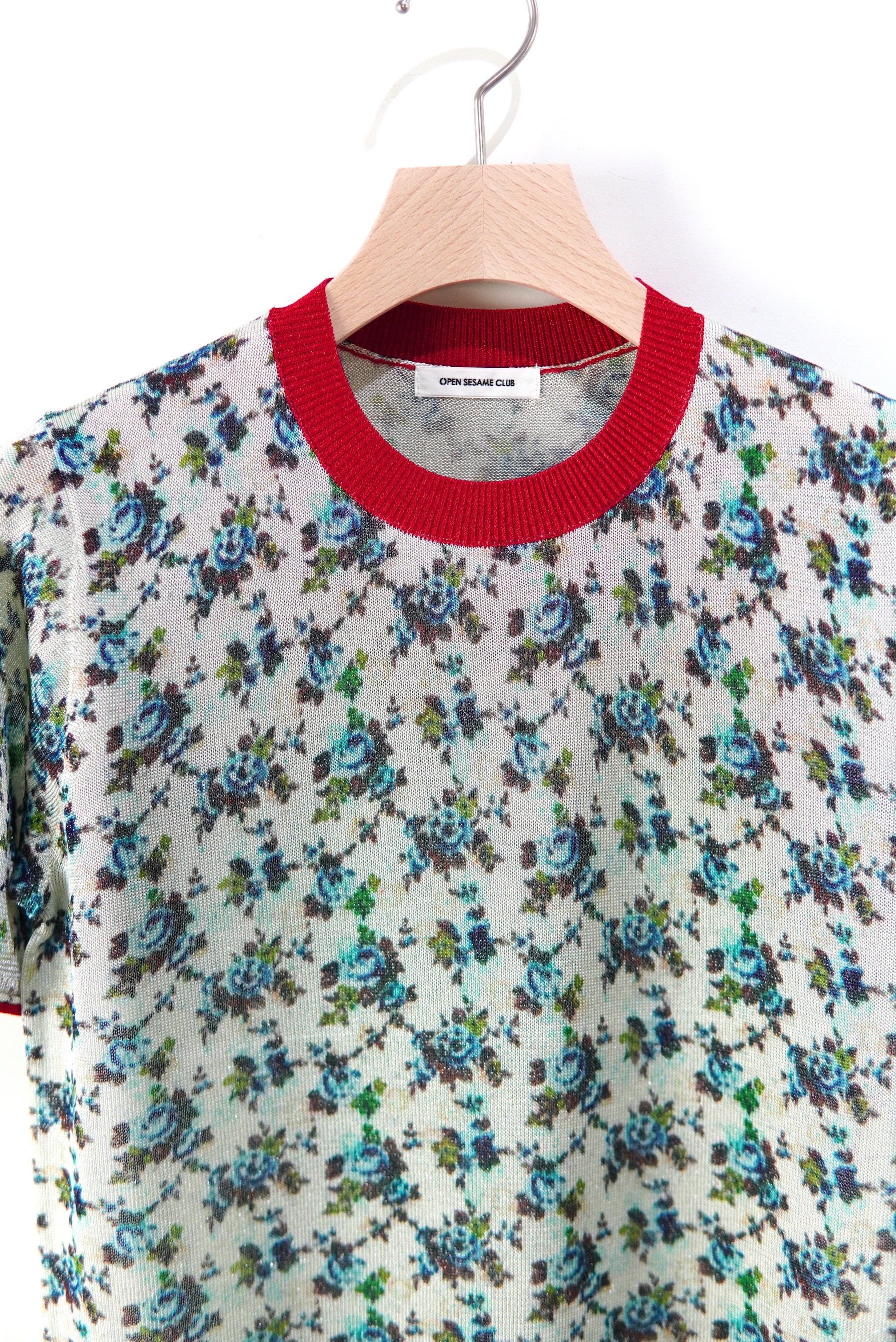 ひんやりとした落ち感のあるラメ糸で編み立て、その上からプリントを重ねた特別な一枚です。 プリントはヴィンテージスカーフやテキスタイルの断片をもとにオリジナルで描き起こした柄。 布帛にはない柔らかな落ち感とニュアンスが、装いに奥行きを添えます。