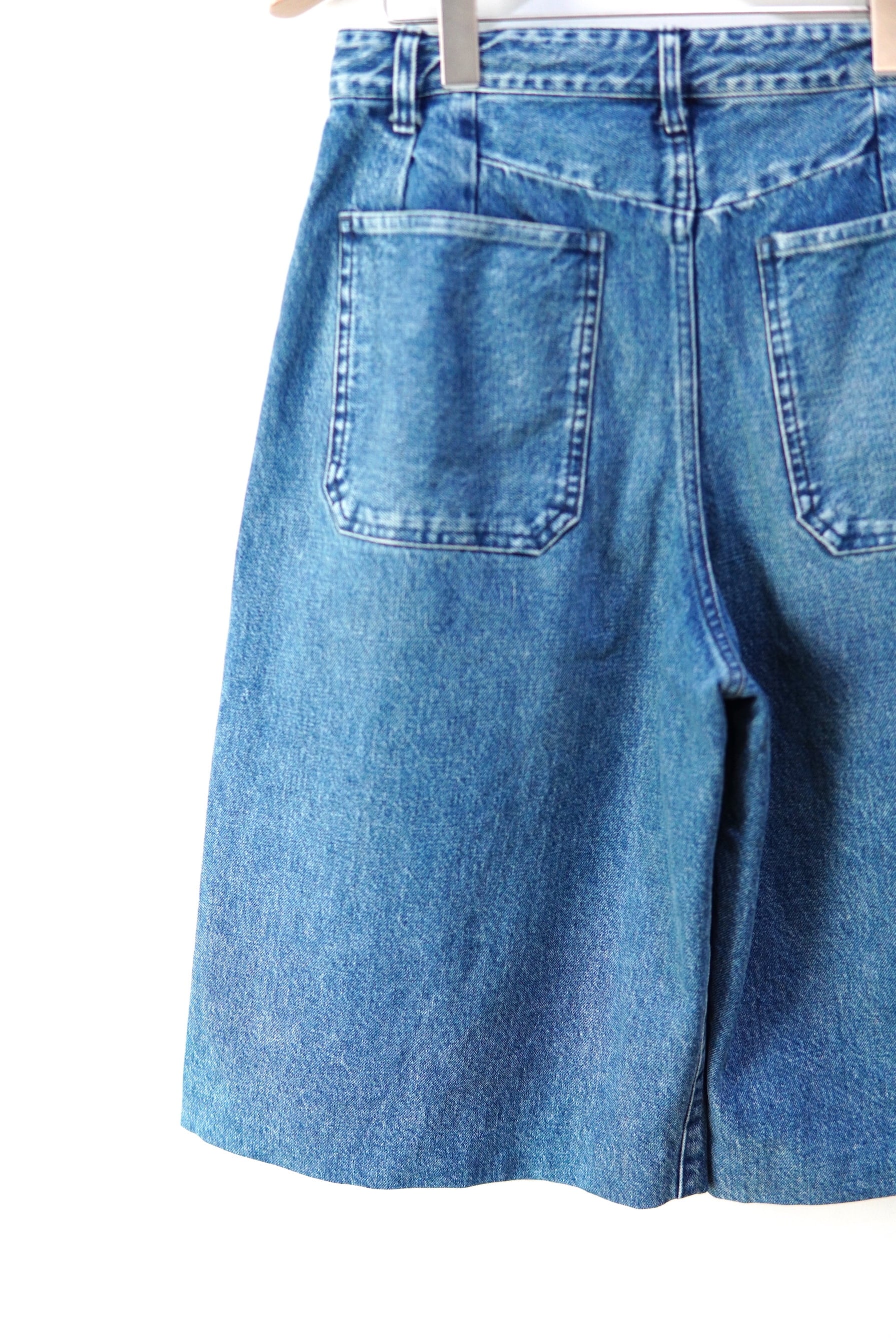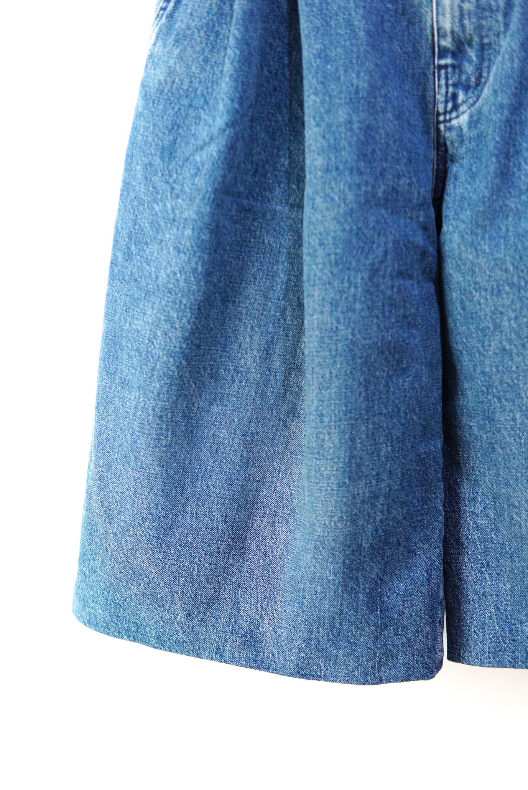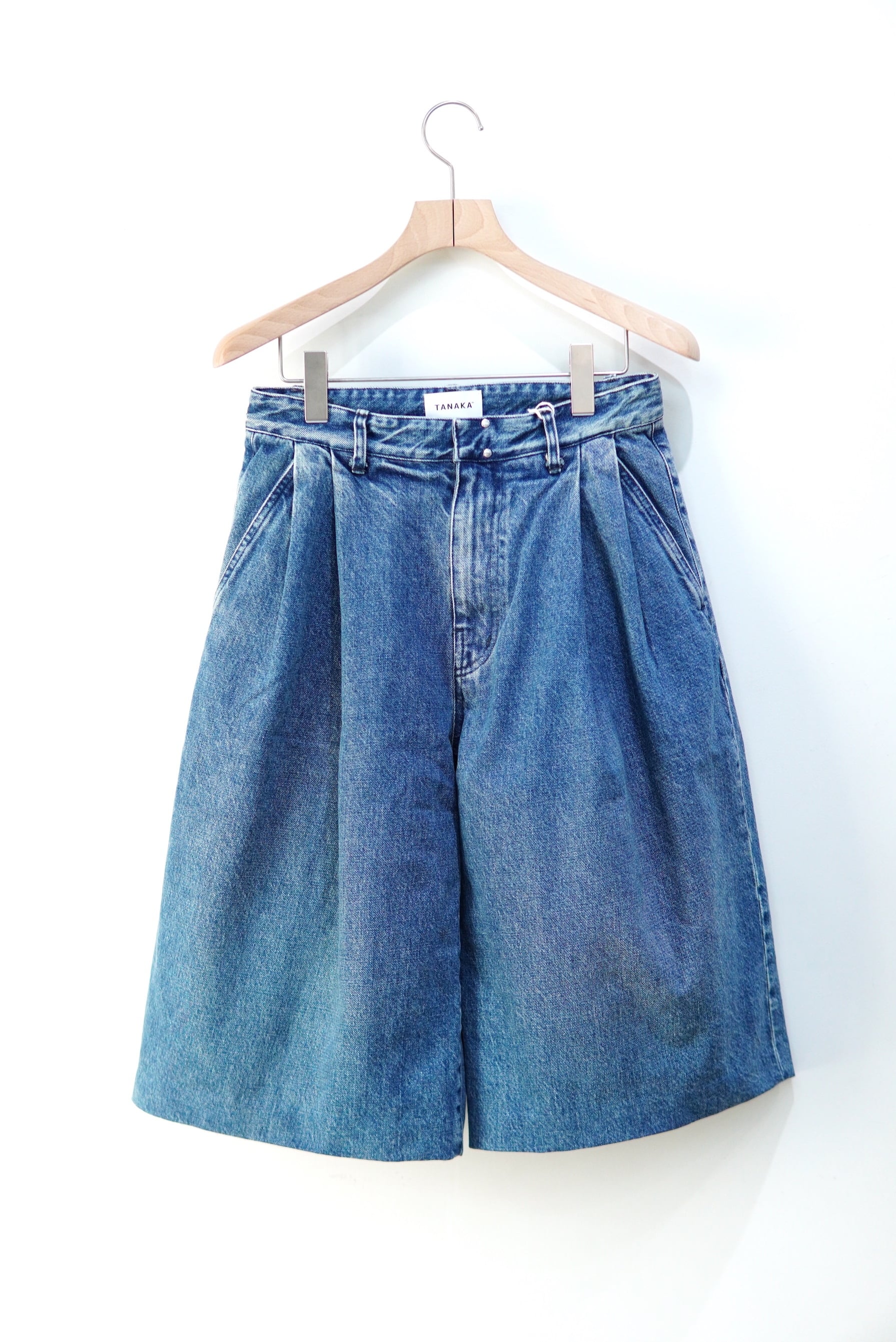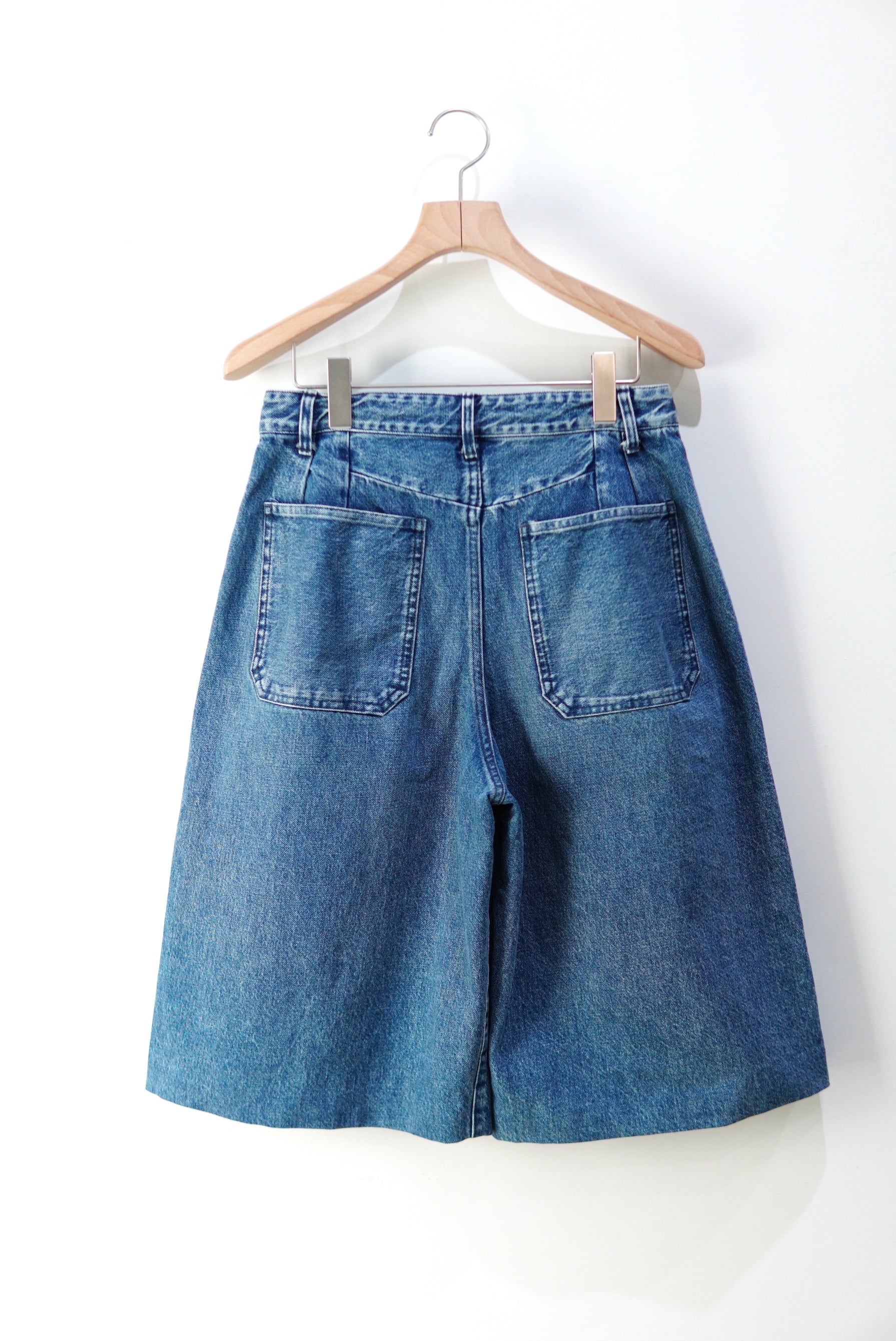 袴より着想したワイドな2TUCKのショートデニム。 全体的に淡い色合いの染めを致しました。 Tシャツからニットまで、通年履いて頂けるデニムです。 MATERIAL 100% Cotton サイズスペック SIZE 26 ウエスト 70cm 股上 28cm 股下 35cm 渡り 40cm 裾幅 36cm