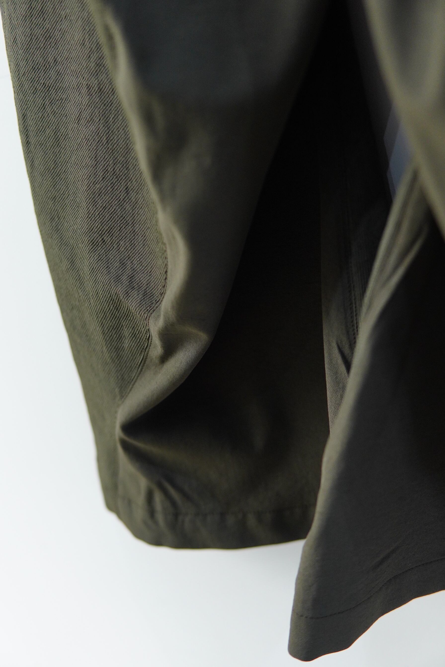 中空糸を使用し極限まで軽さを追求した ポリエステル/カルゼ素材、それと同じ糸で織られたツイル素材 を2種類、切替に対して視覚的に効果のある配置でドッキングしました。
