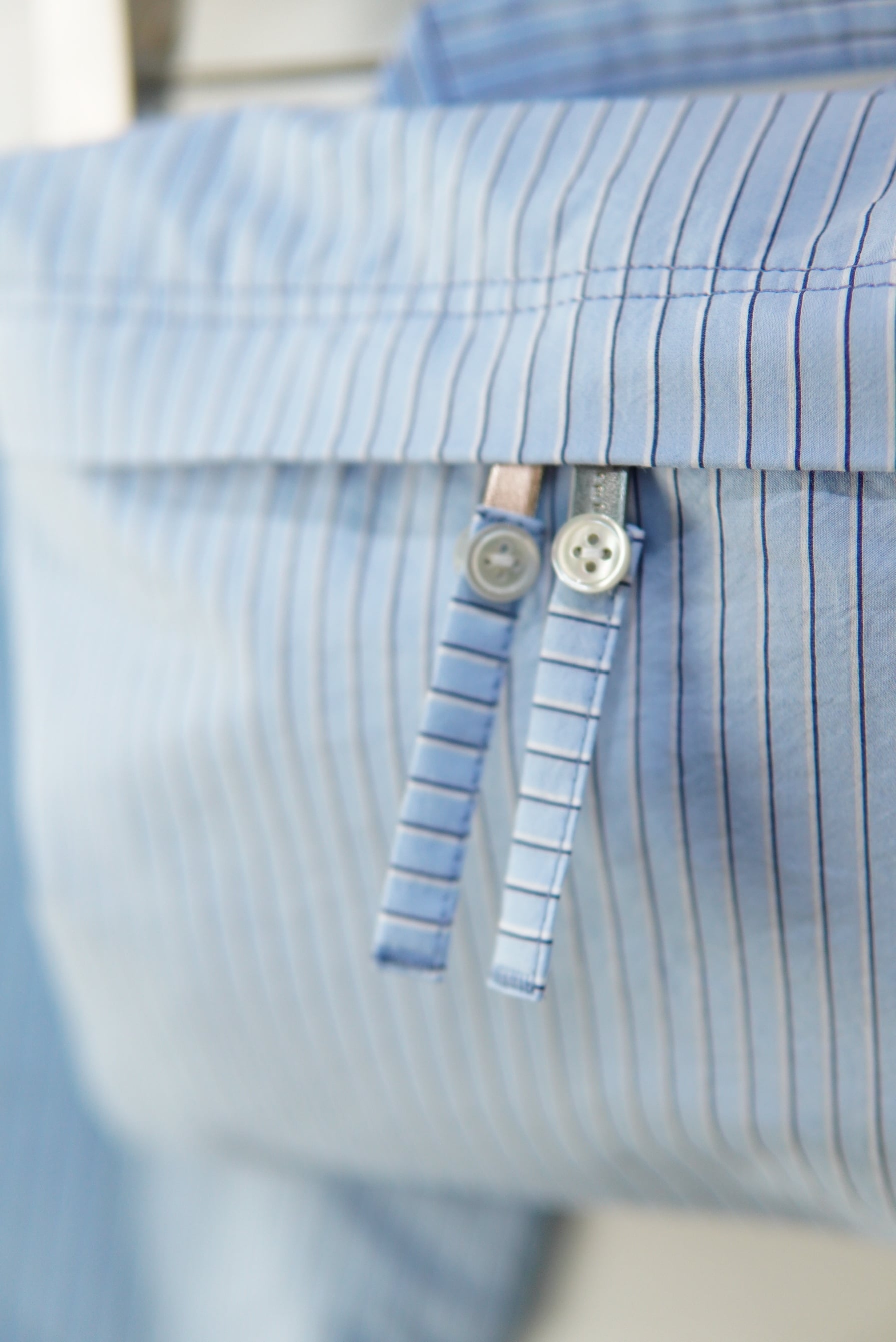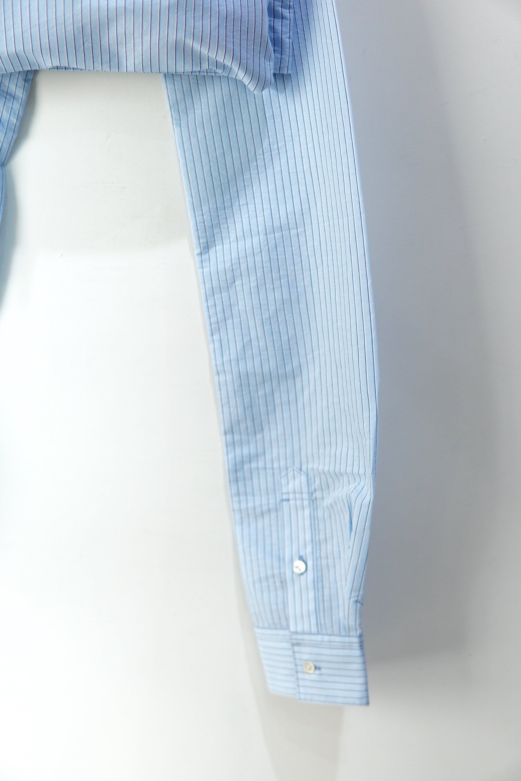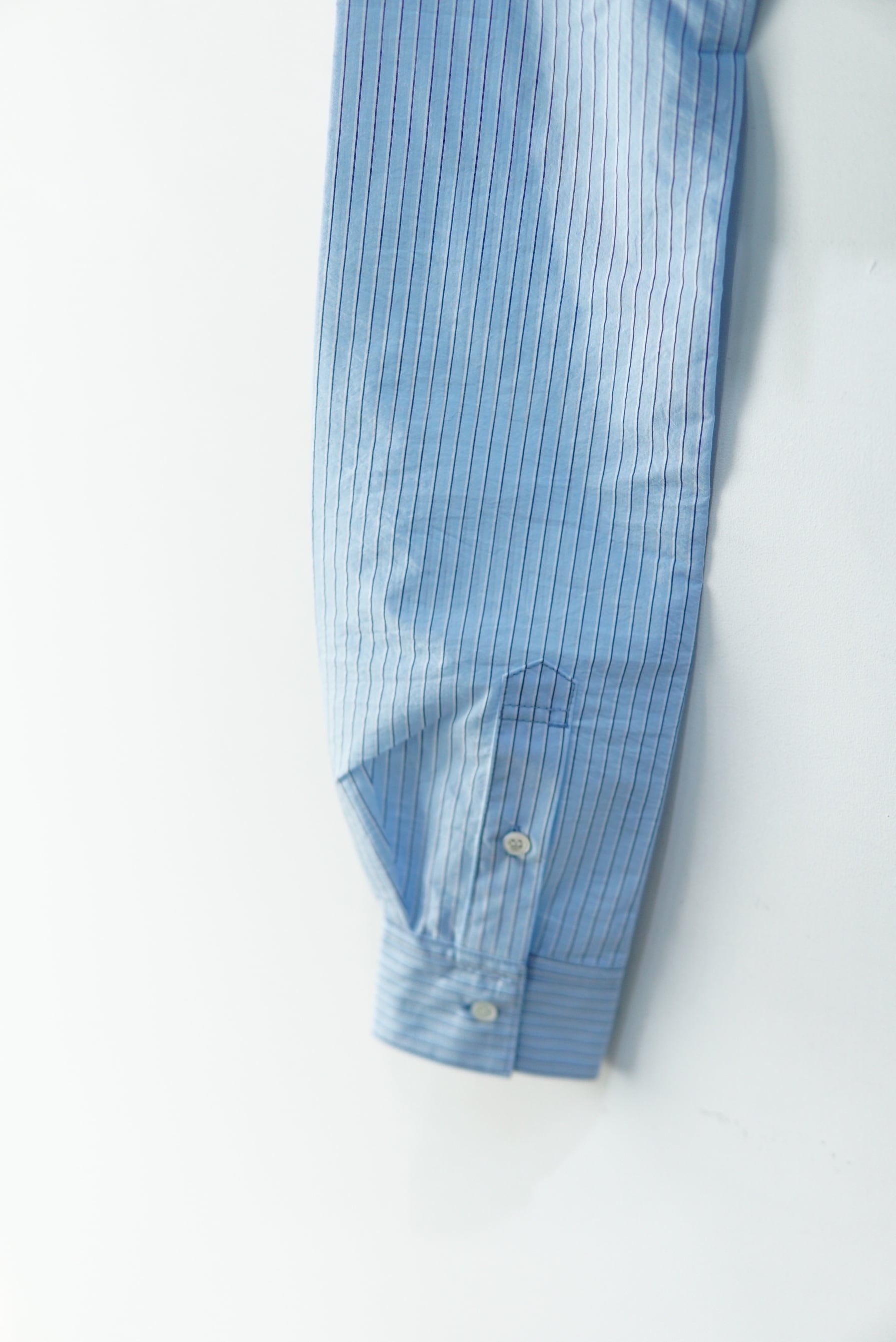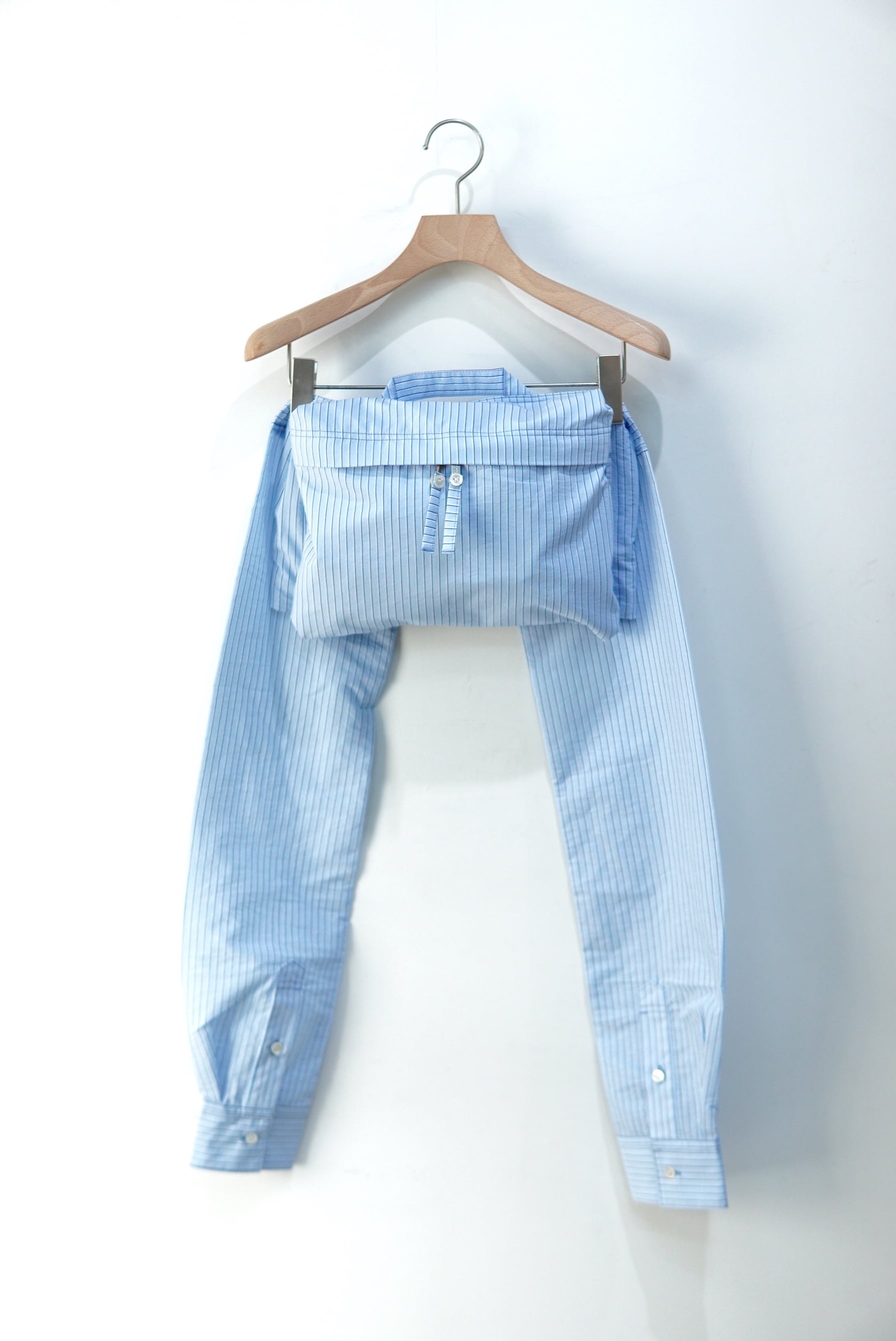 シャツ袖バック。 シャツ袖を、体に巻き、結んで固定するように使用します。 止めつける位置を変えることで、様々なスタイリングに応用可能。 素材は、緯糸に極細のナイロン糸、経糸に綿を使用した、ナチュラルなシワ仕上げが施された、 軽さとハリのあるシャツ素材を使用しています。 : の2つ穴が、開けられたオリジナルファスナートップには、 シャツボタンと共布コードが手縫いで、縫い付けられています。 material Cotton 78% POLYESTER 22%