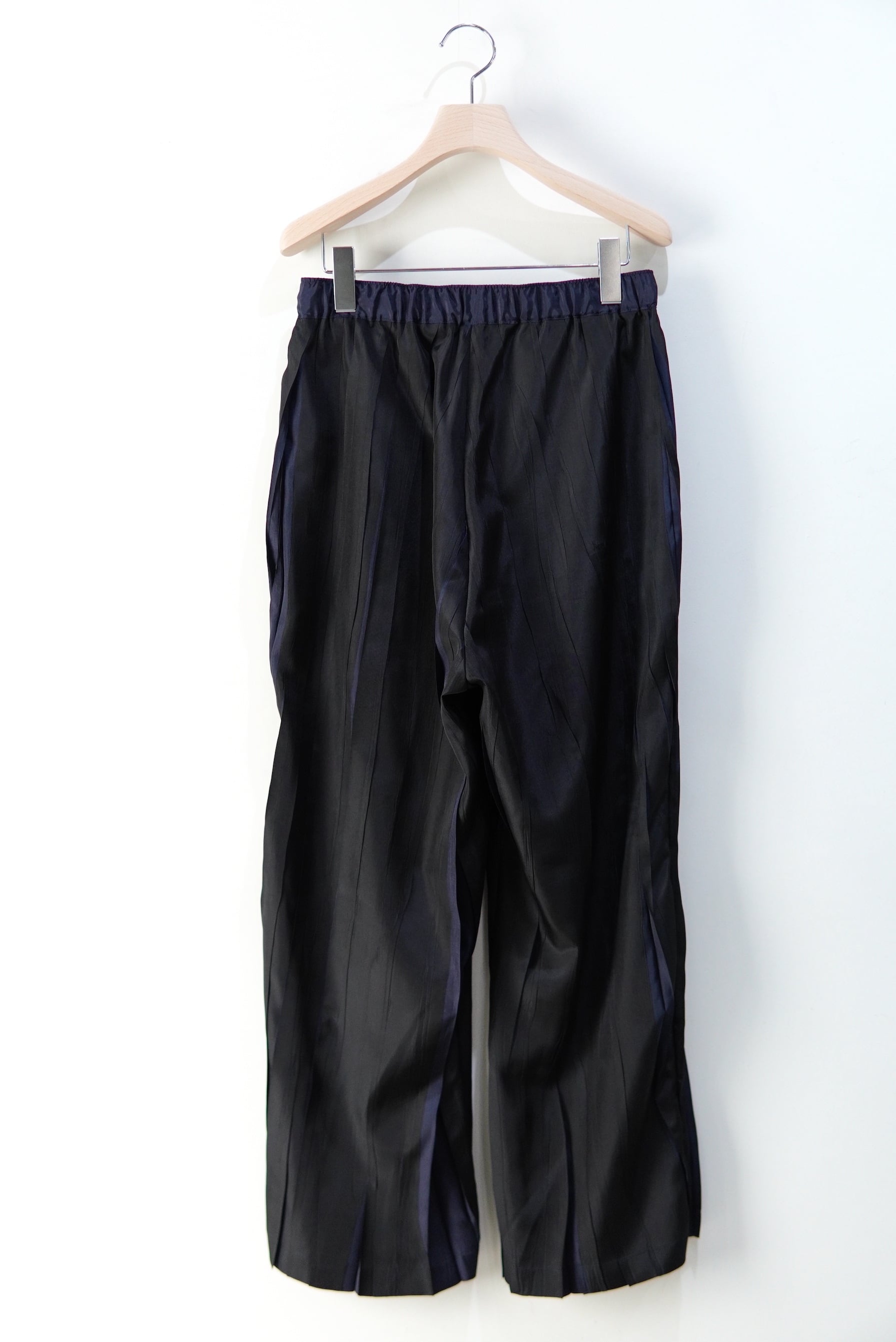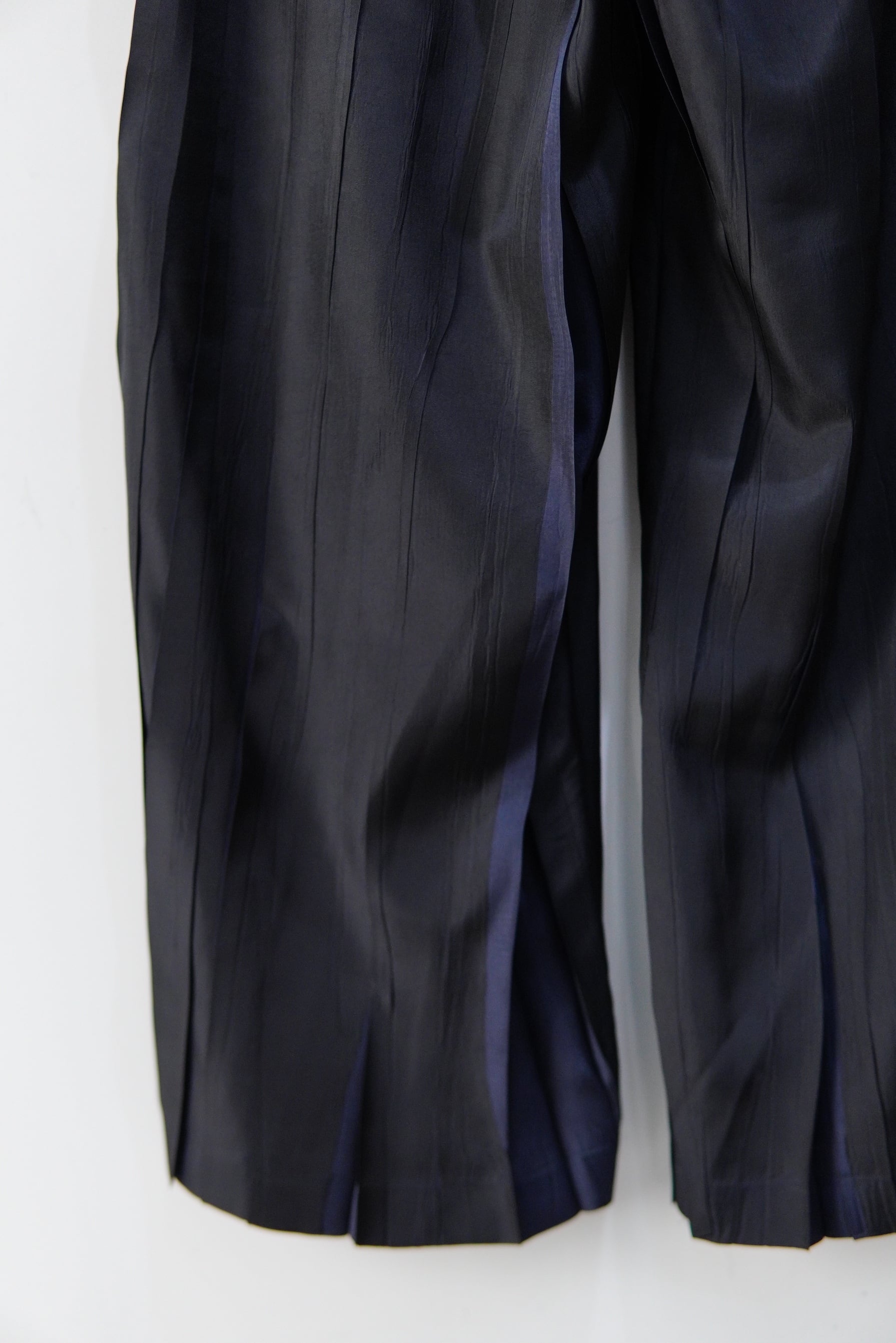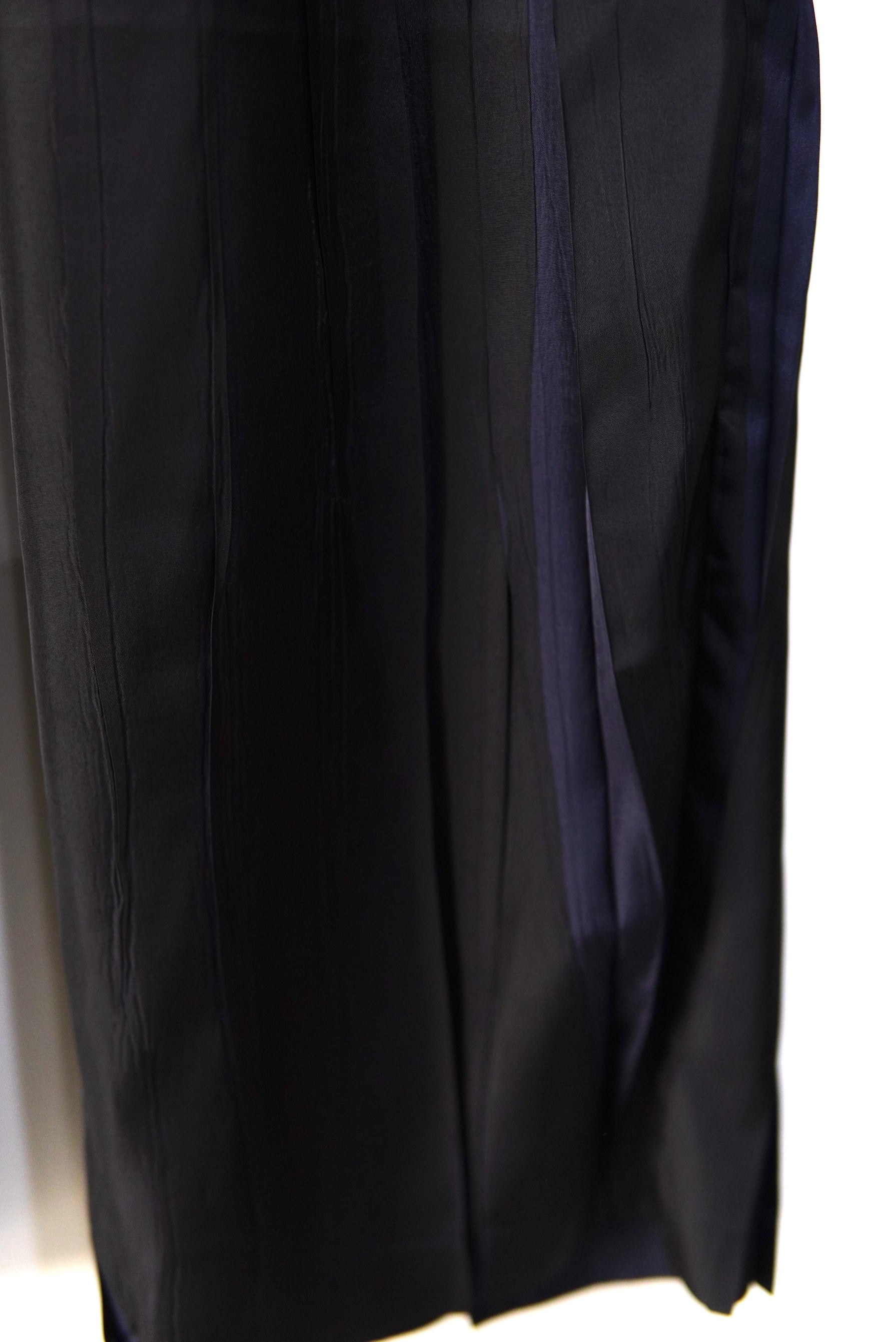 ランダムなグラデーションプリーツをかけた上に、半製品でプリントを乗せてライブ感のある模様を生み出します。動作によっては袴のようなたっぷりとしたわたりで、歩いた際に美しく陰影が見える様になっています。