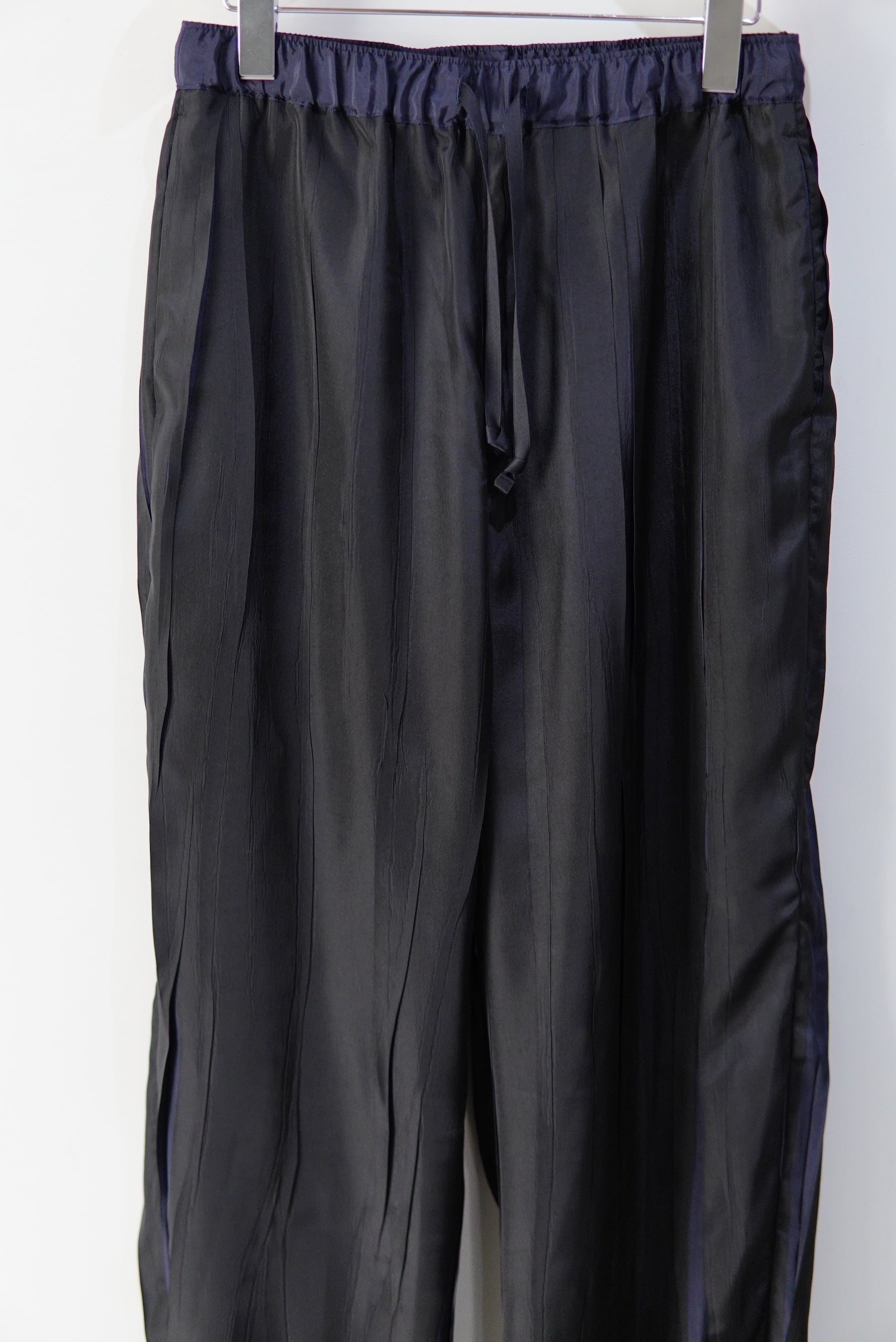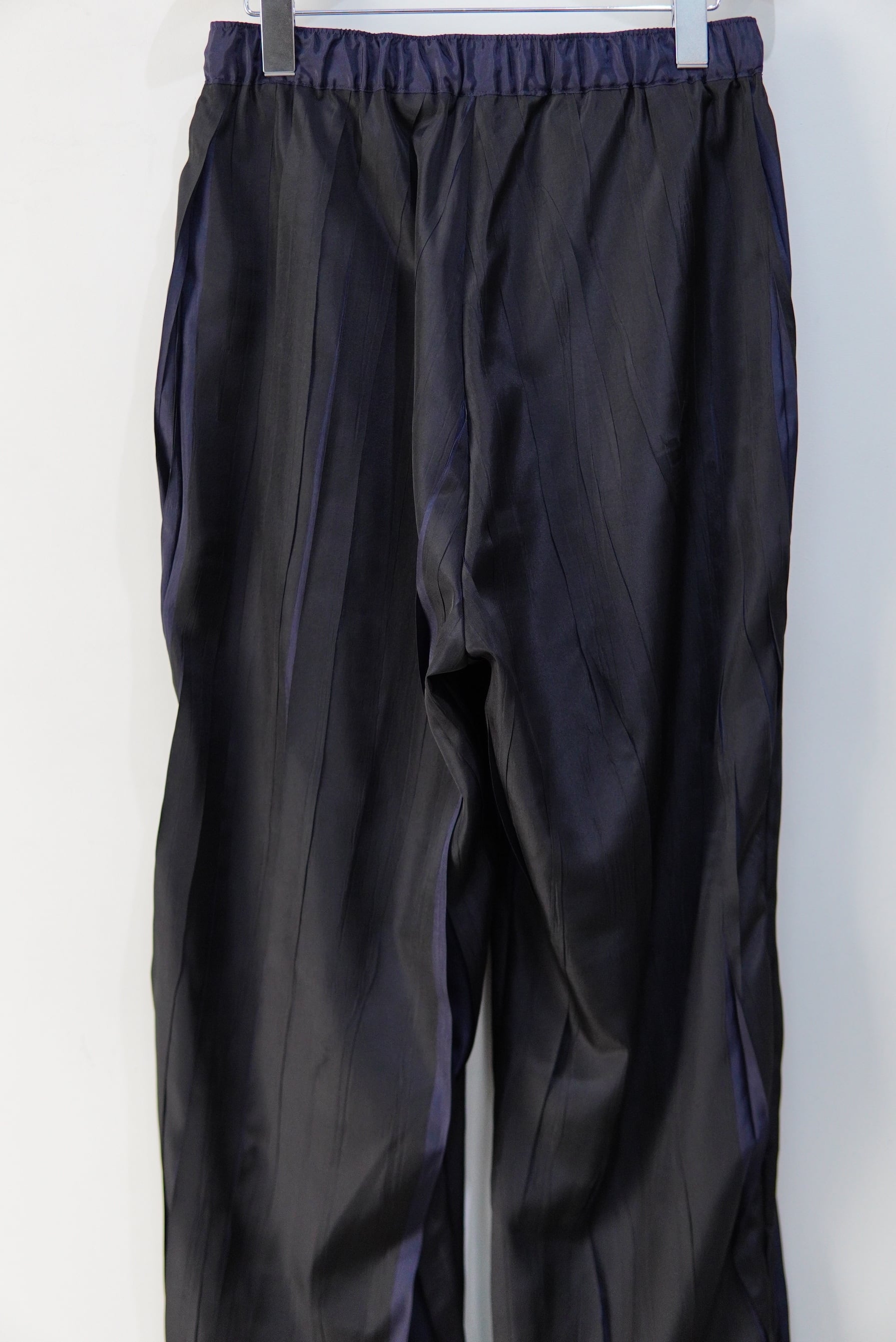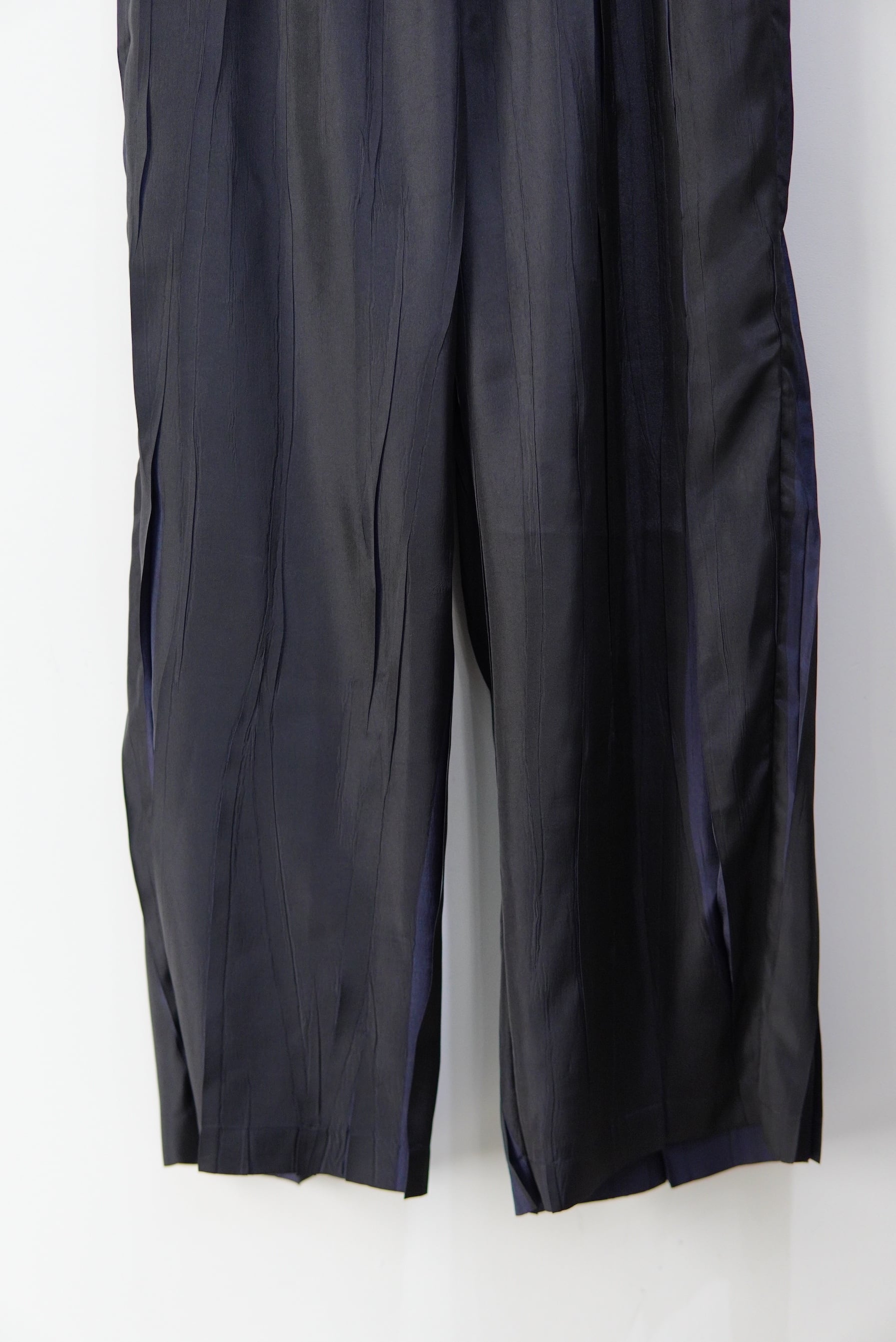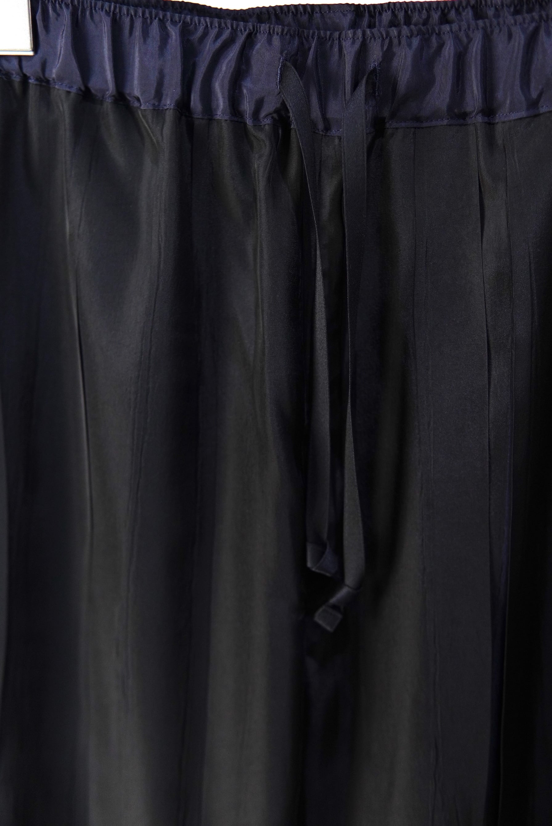 ランダムなグラデーションプリーツをかけた上に、半製品でプリントを乗せてライブ感のある模様を生み出します。動作によっては袴のようなたっぷりとしたわたりで、歩いた際に美しく陰影が見える様になっています。