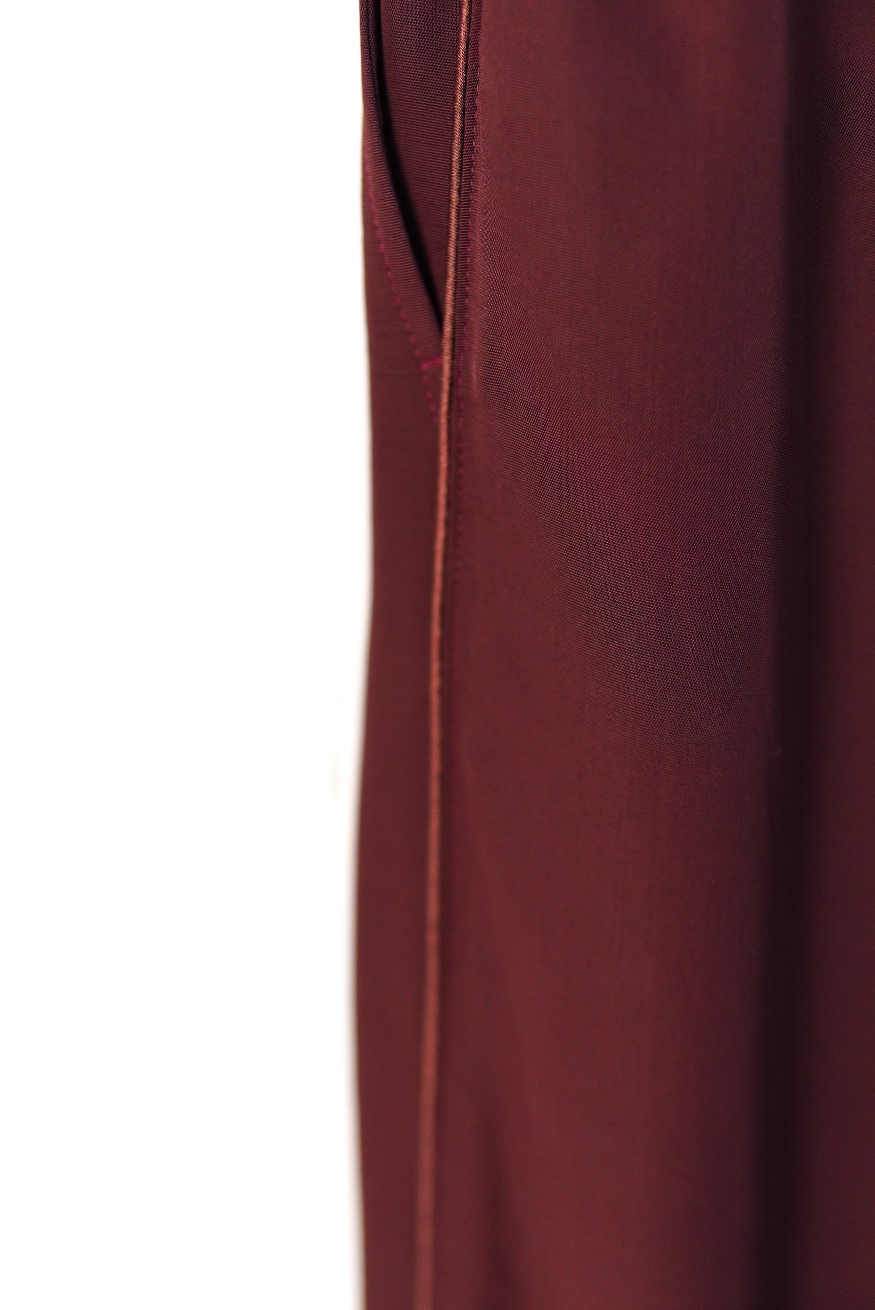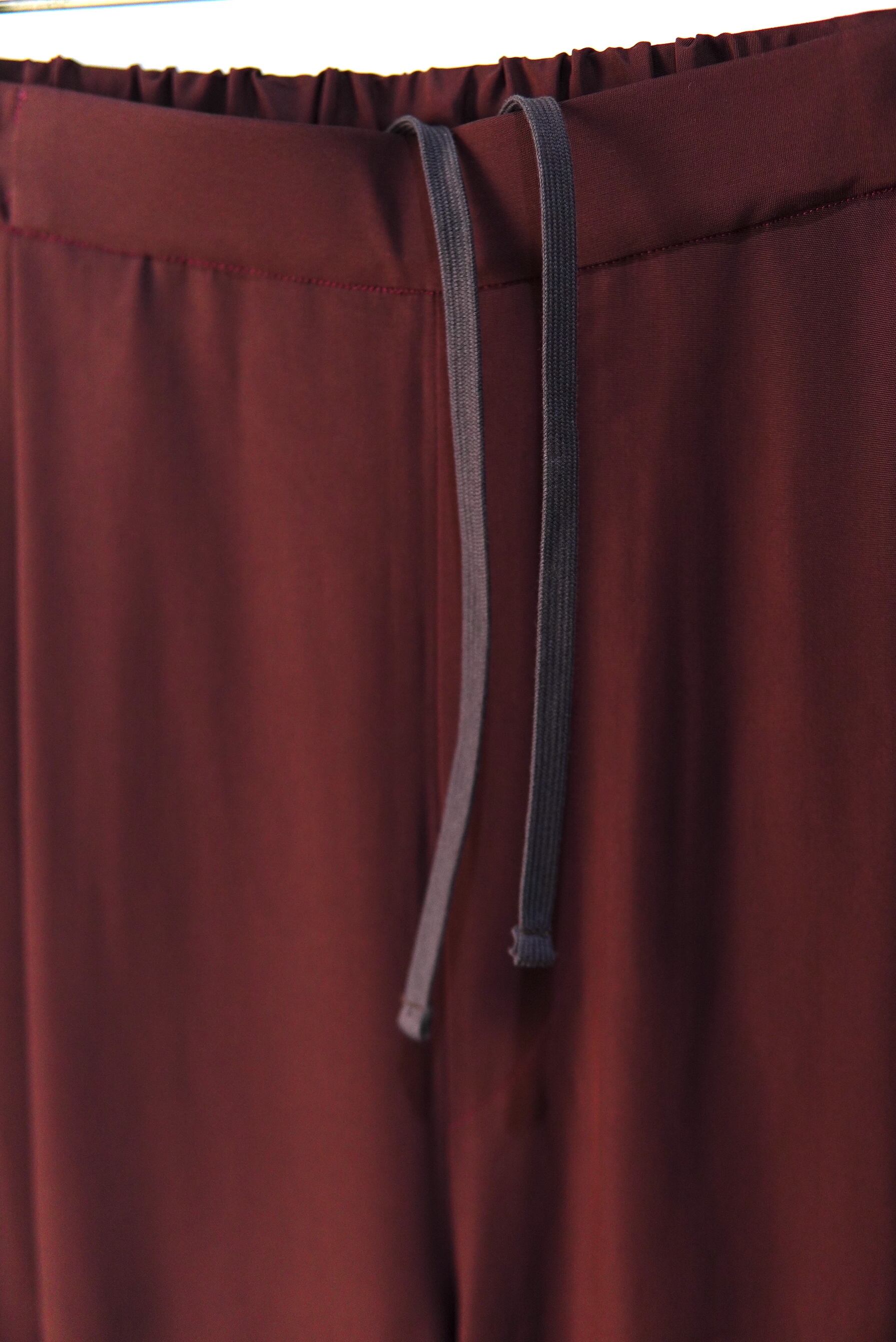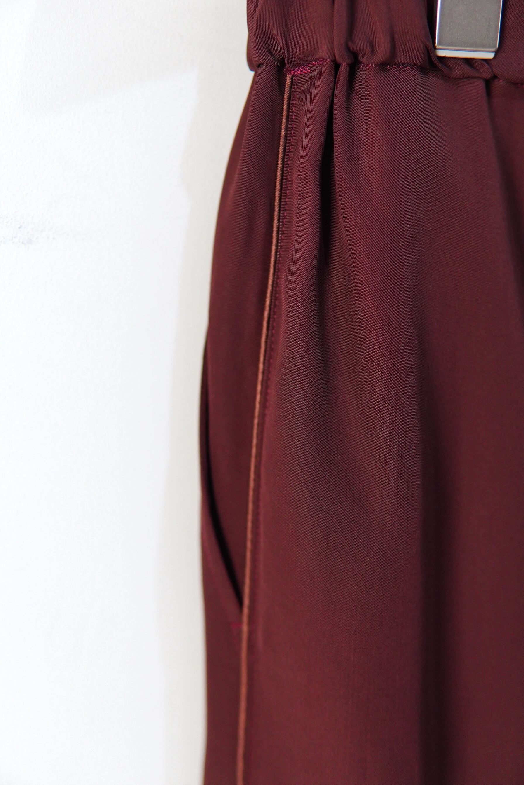 シルエットはたっぷりとしたフレアながら、着用す ると素材のドレープ性ですっきりと縦長に見えるラ インに見え、 ウエストはゴム+スピンドル仕様で、脇には同色の コードパイピングがチラリと見えます。男女問わず ノンストレスな履き心地の良さが病みつきになる1 着です。