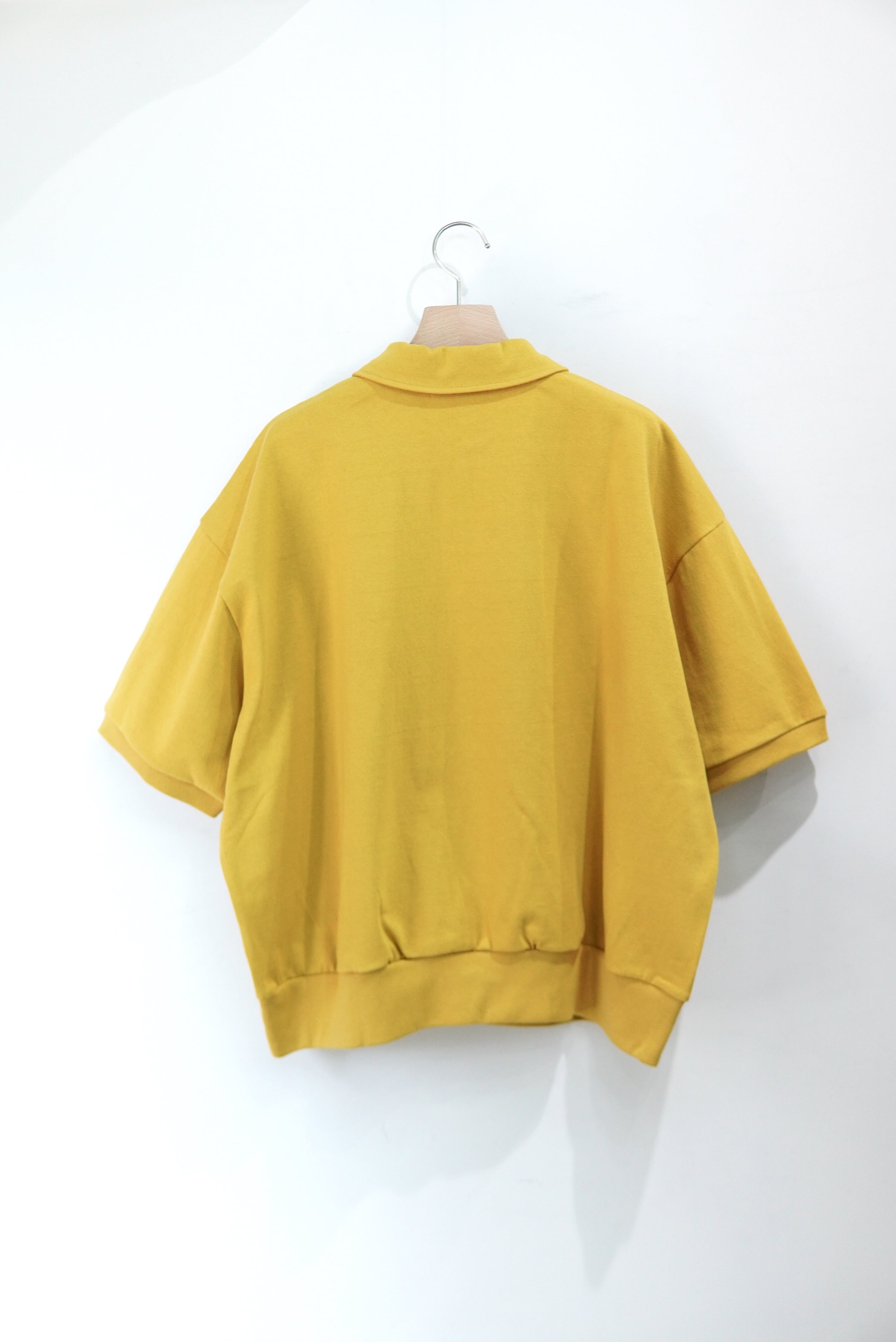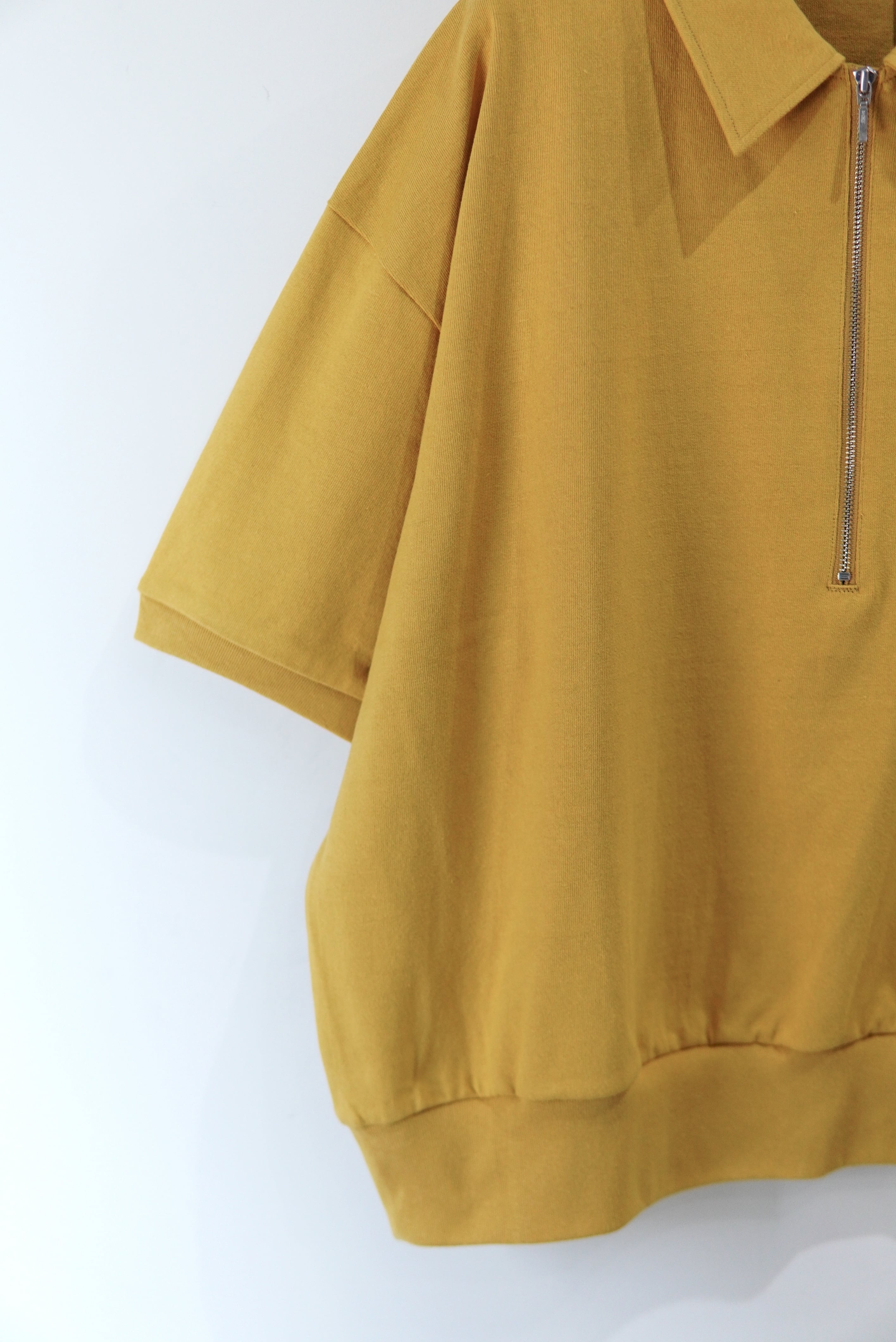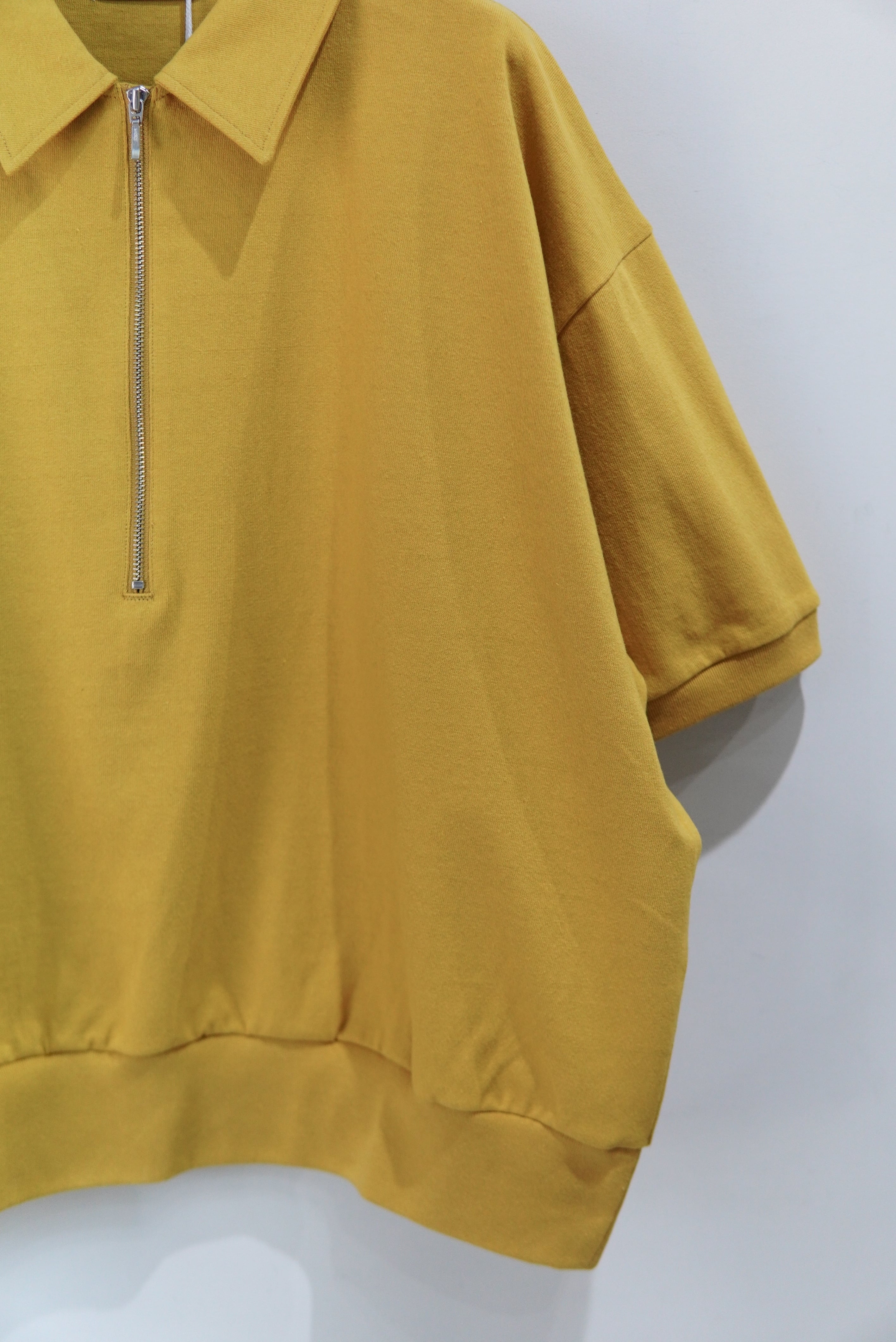 REVERBERATEのシグネチャーモデルであるハーフジップの半袖仕様。 全体のバランスを見直し、コンパクトなシルエットに仕上げました。 度詰めの天竺素材を使用しております。 MATERIAL 100% COTTON size 3 着丈 62cm 身幅 68cm 肩幅 60cm 袖丈 24cm