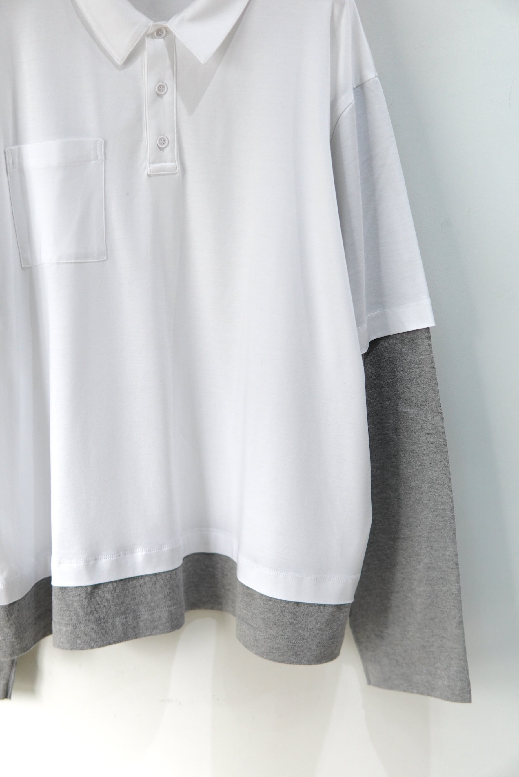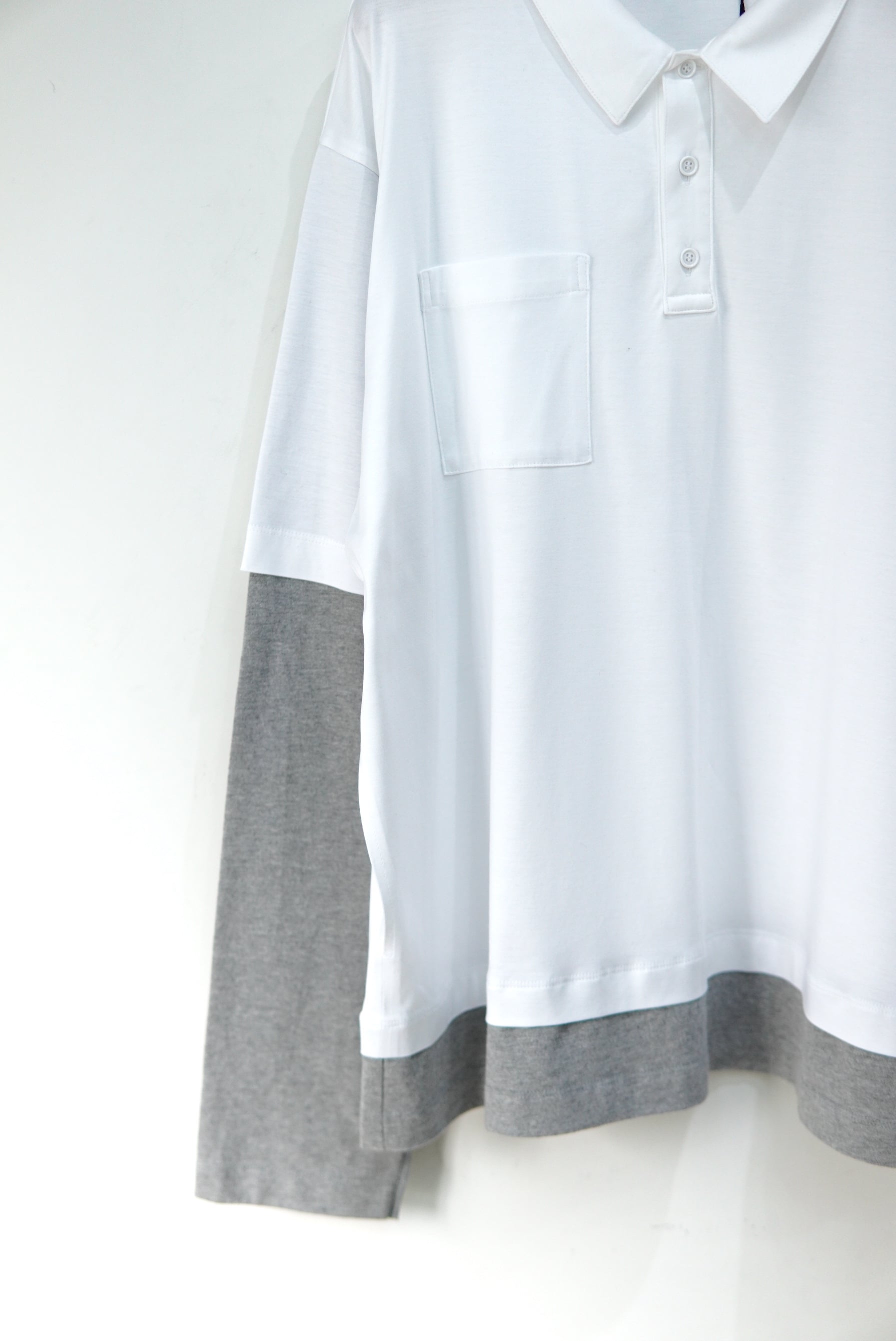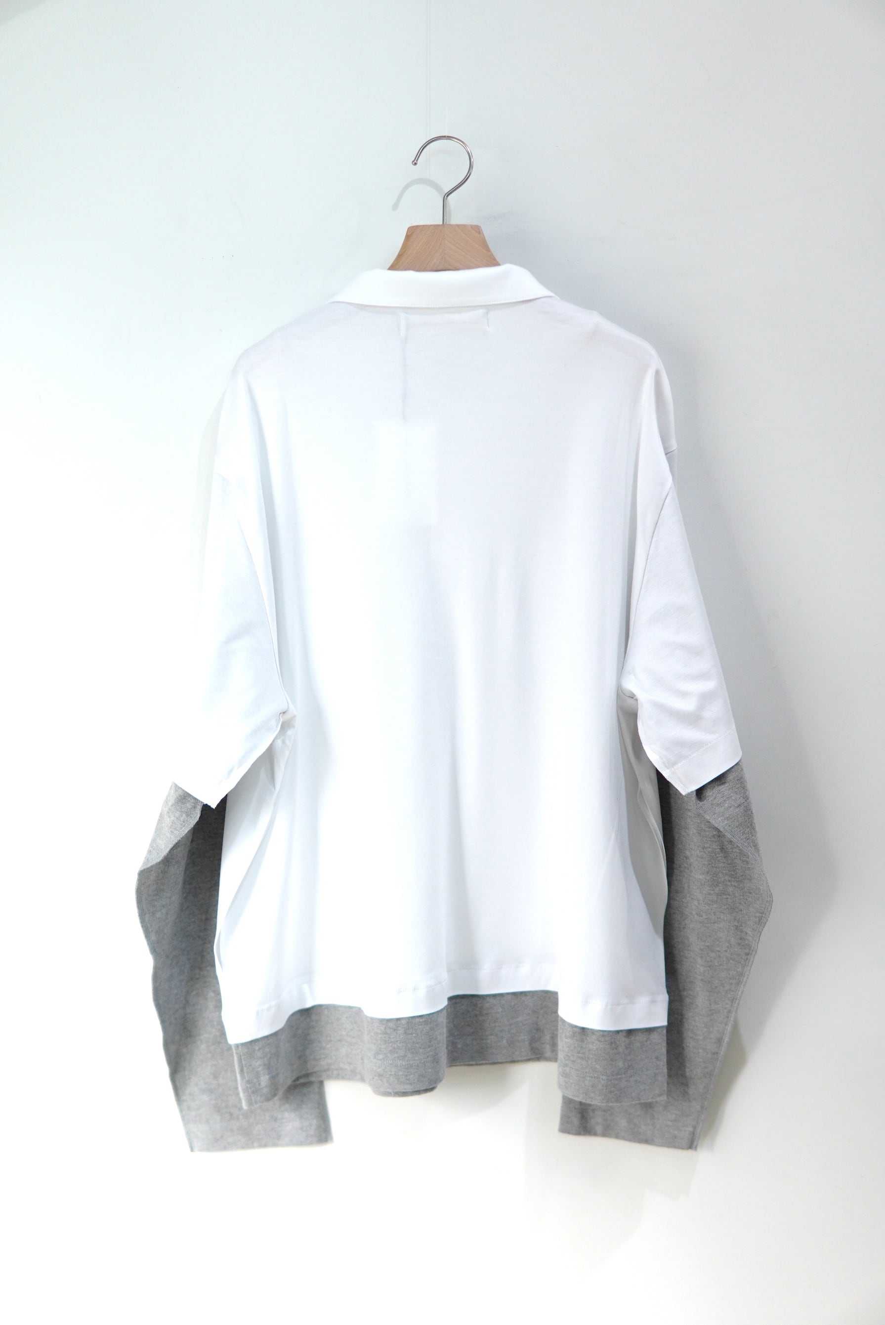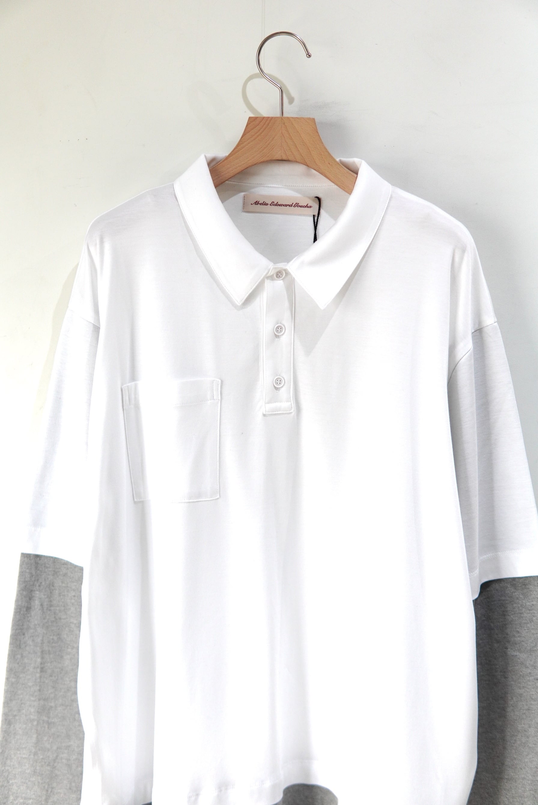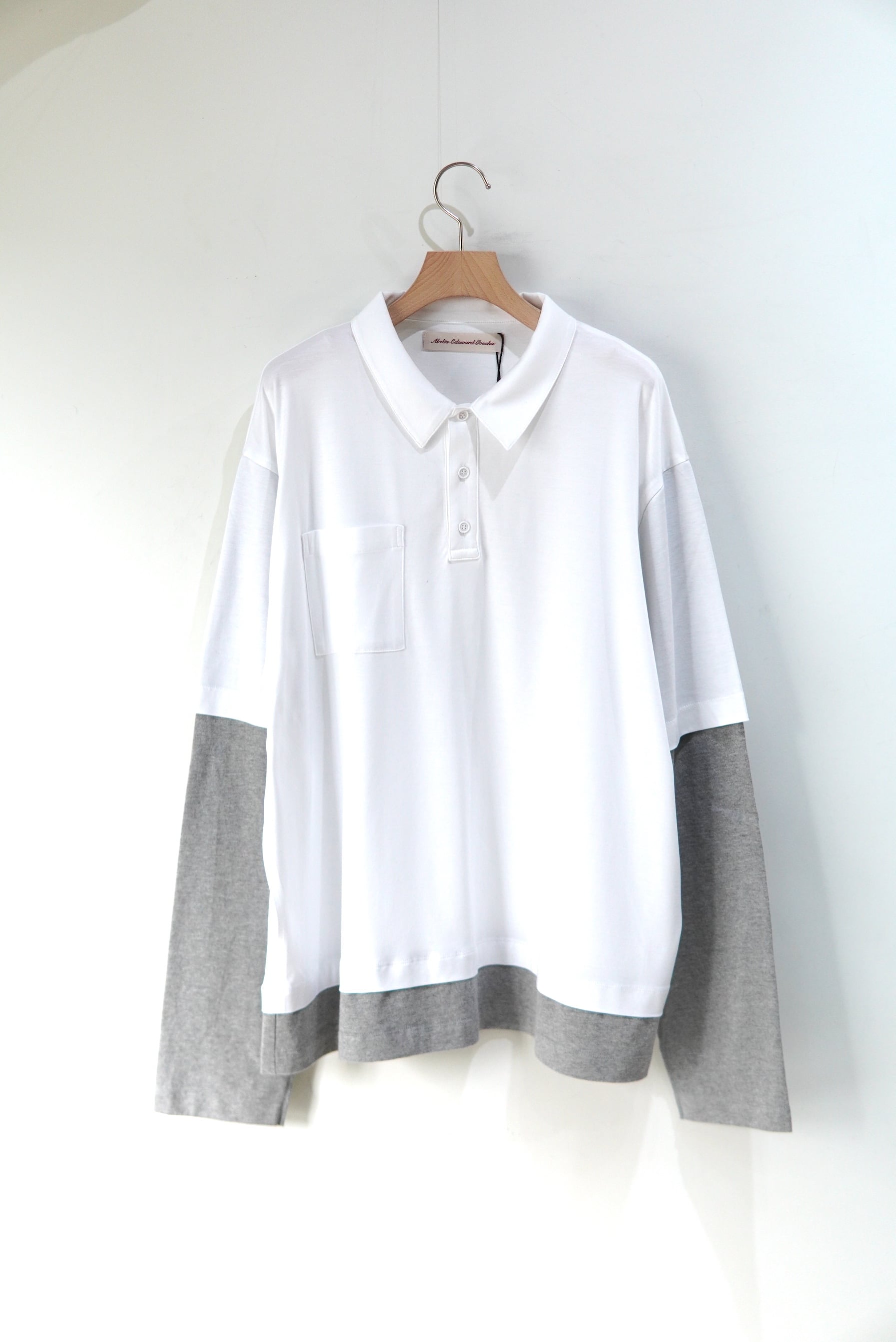 アベリアエドワードゴーチャ POLOとL/Sを重ねたようなデザイン。 生地はとても柔らかなスムースな素材となり、襟口も若干広めで、 長いシーズン着て頂けます。 MATERIAL 70% VISCOSE 30% COTTON Size 3 着丈 70cm 肩幅 51cm 身幅 61cm 袖丈 65cm