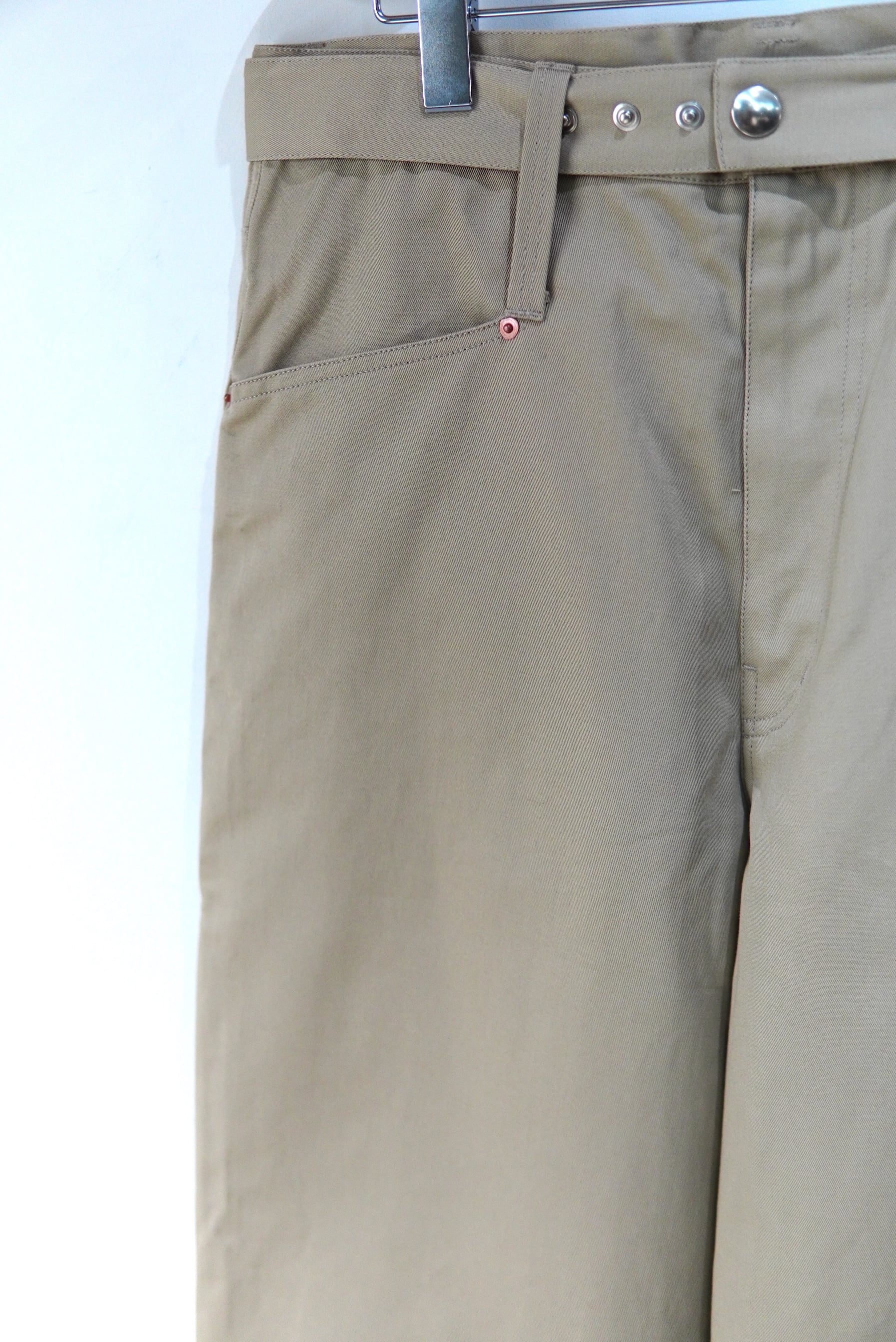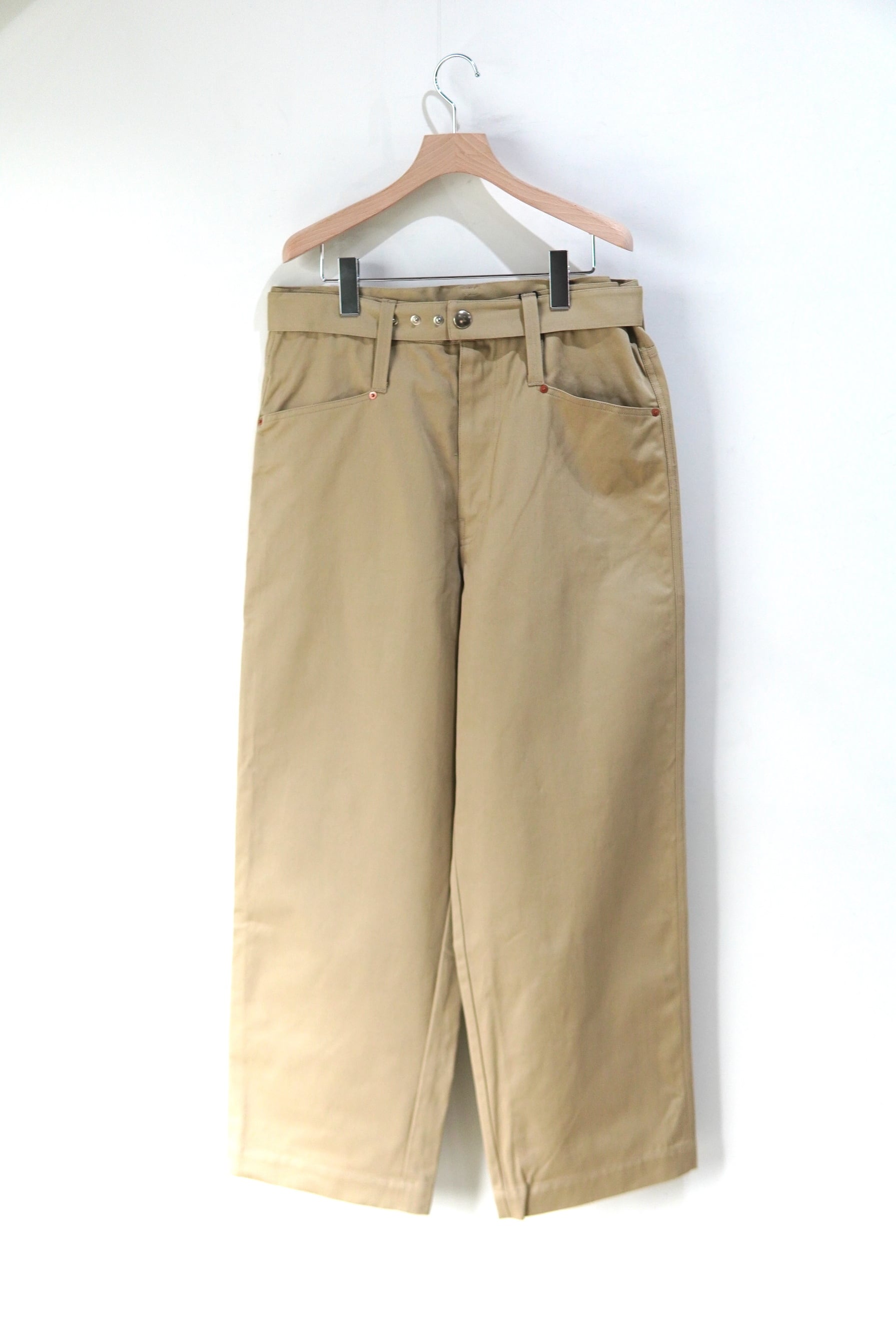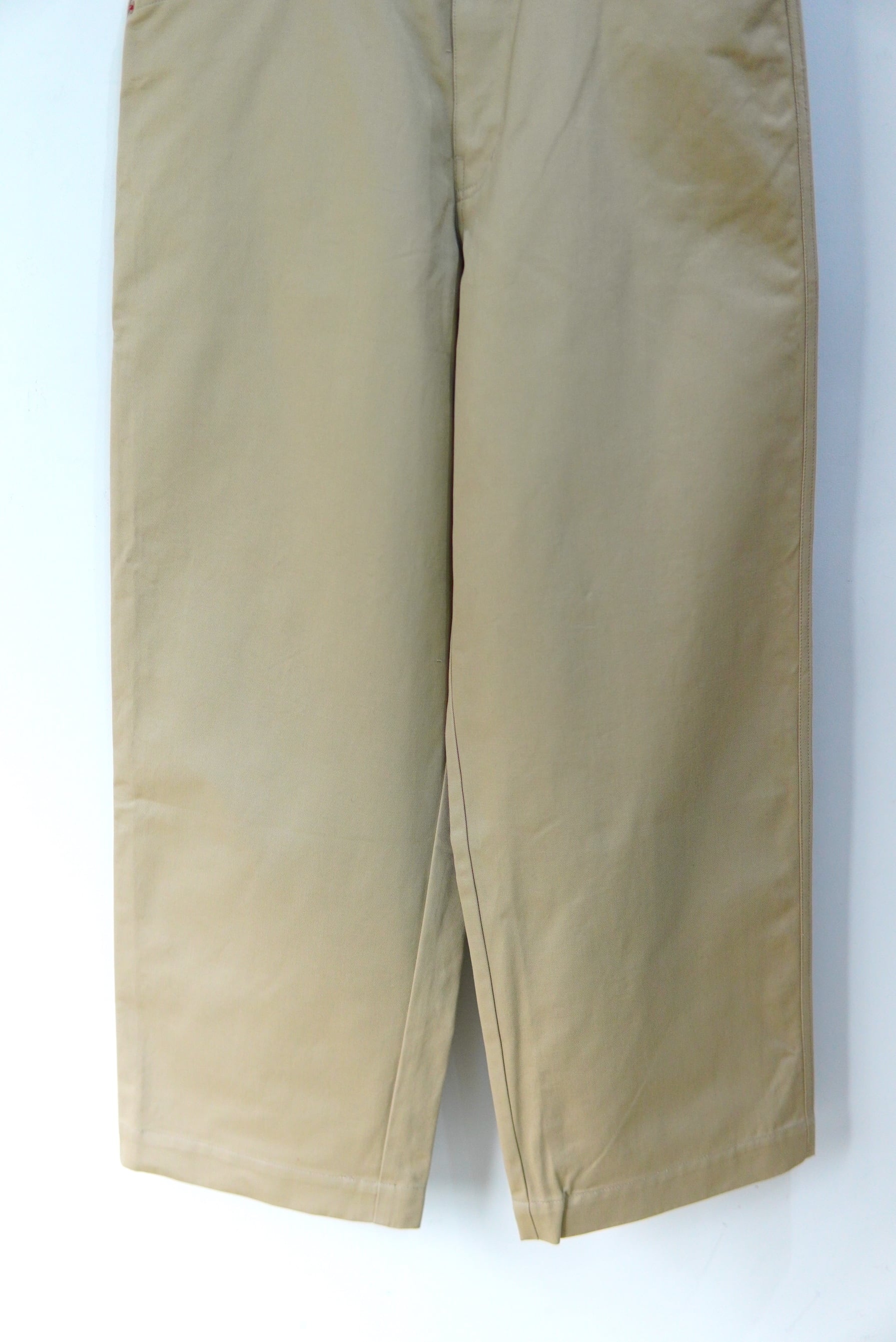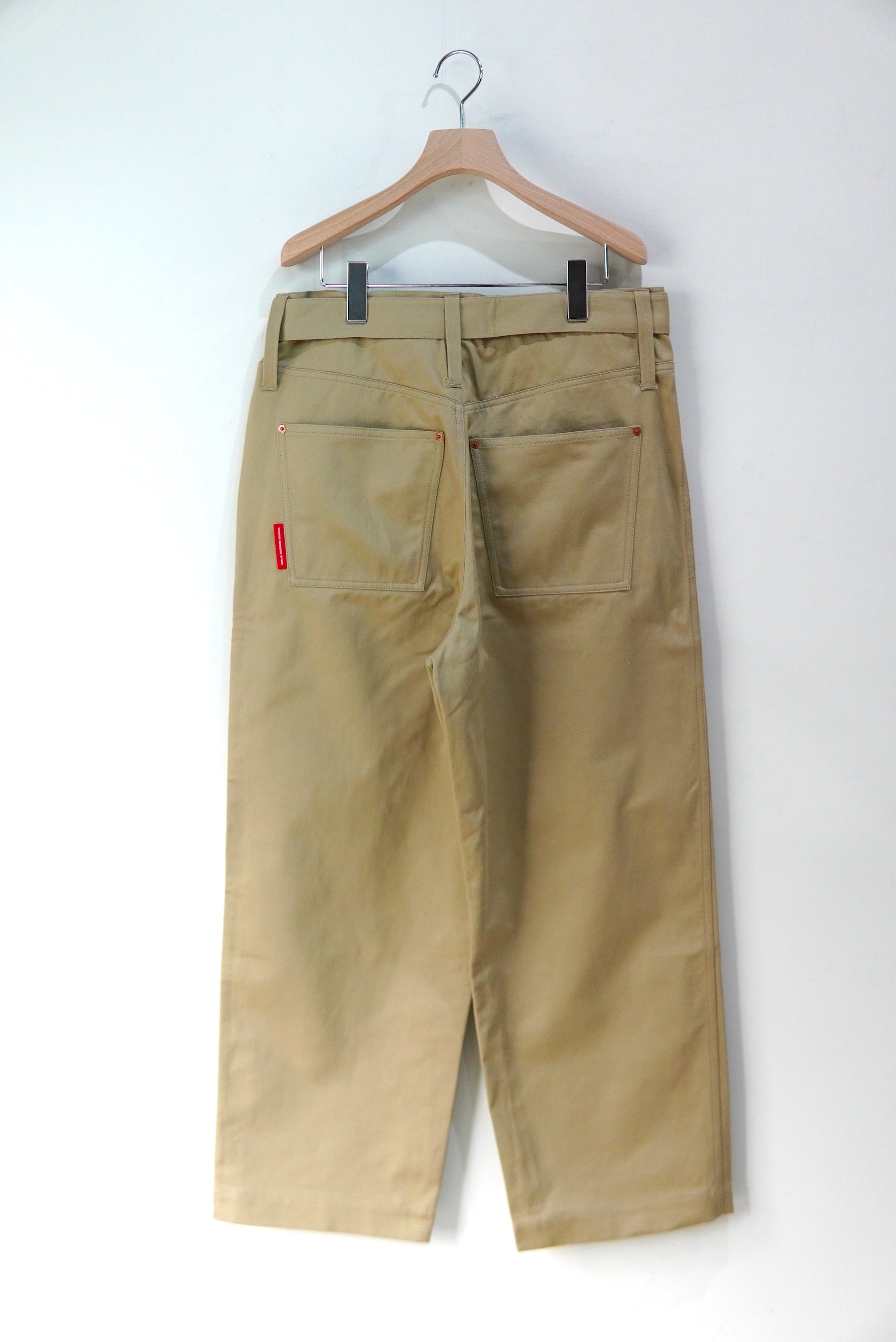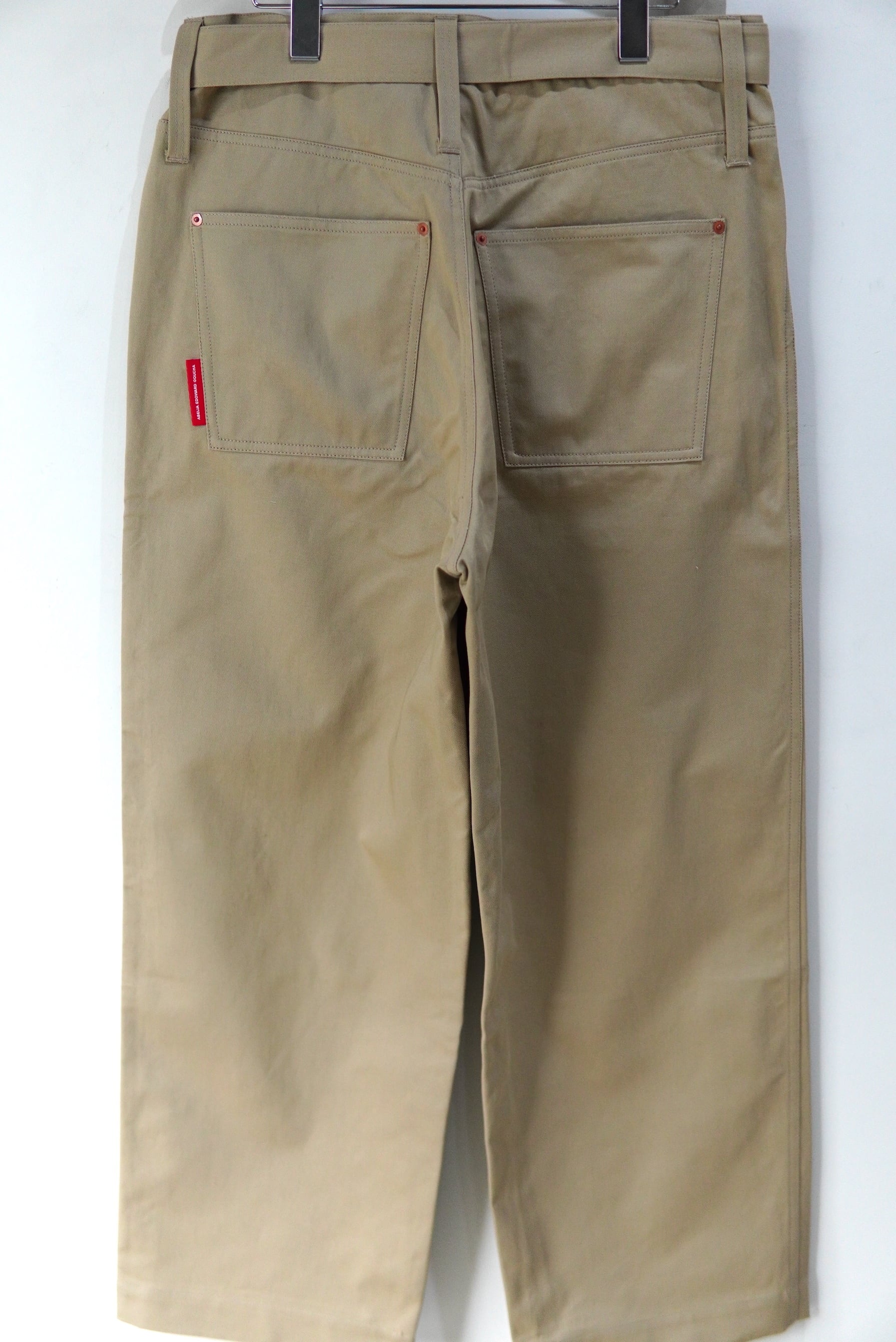 Abelia Edoward Goucha / アベリア エドワード ゴーシャ ブランドの定番的な程よいワイドシルエットのチノ。 共生地のベルトが付属し、ベルトループを長めに設定しており、 ベルト位置を上下に変えて履いて頂けます。 MATERIAL 100% COTTON Size 3 ウエスト 86cm 股上 32cm 股下 72cm 裾幅 26cm