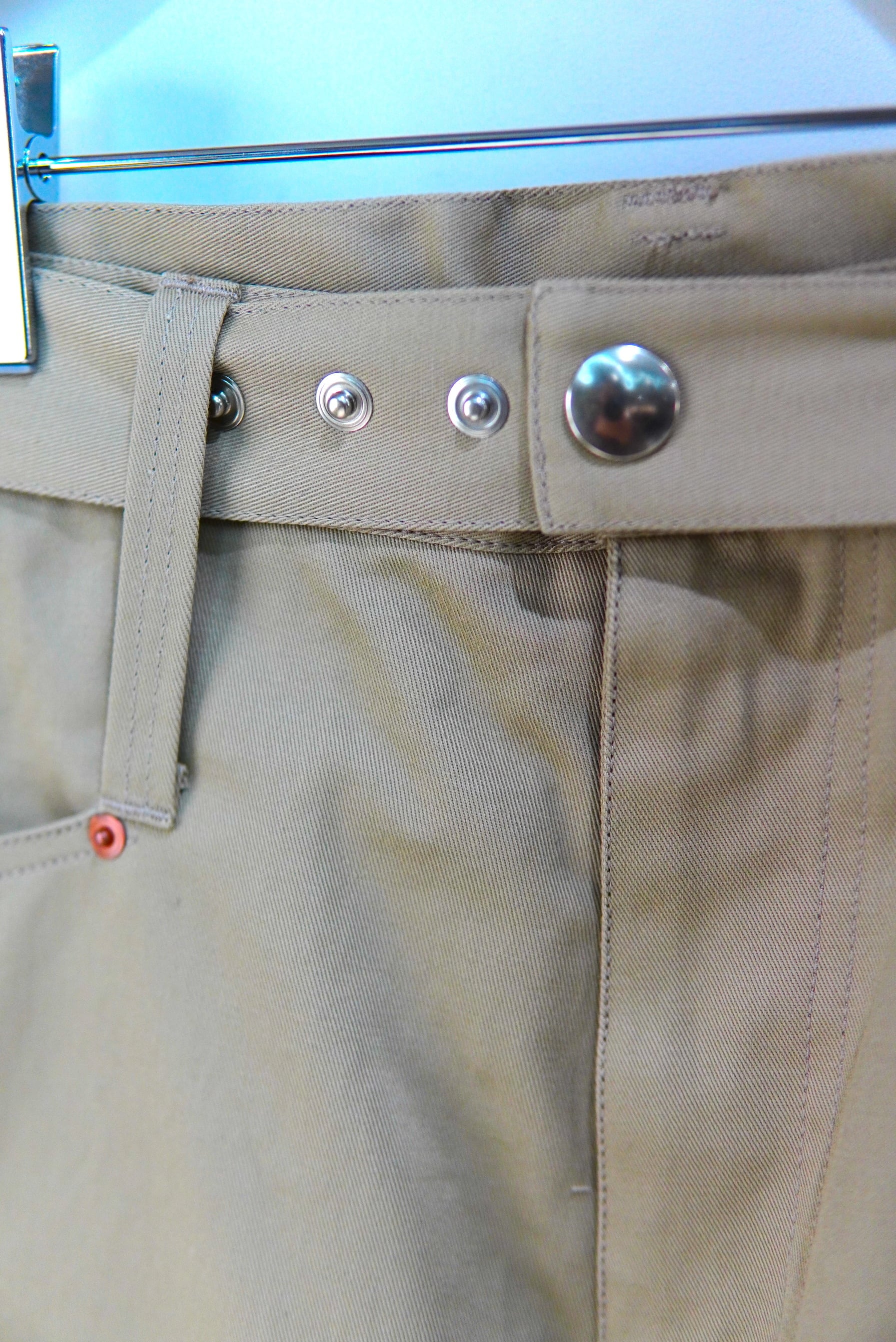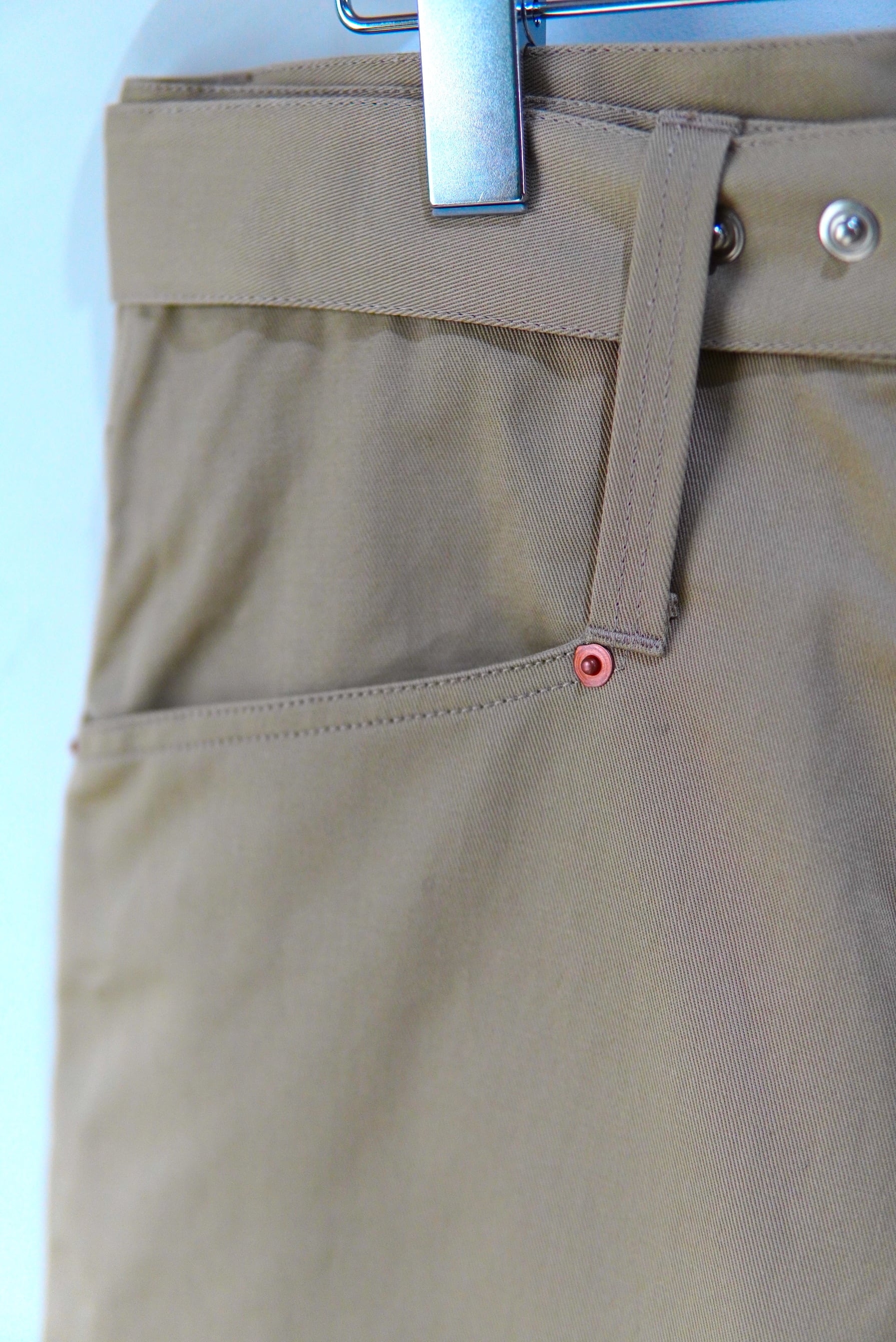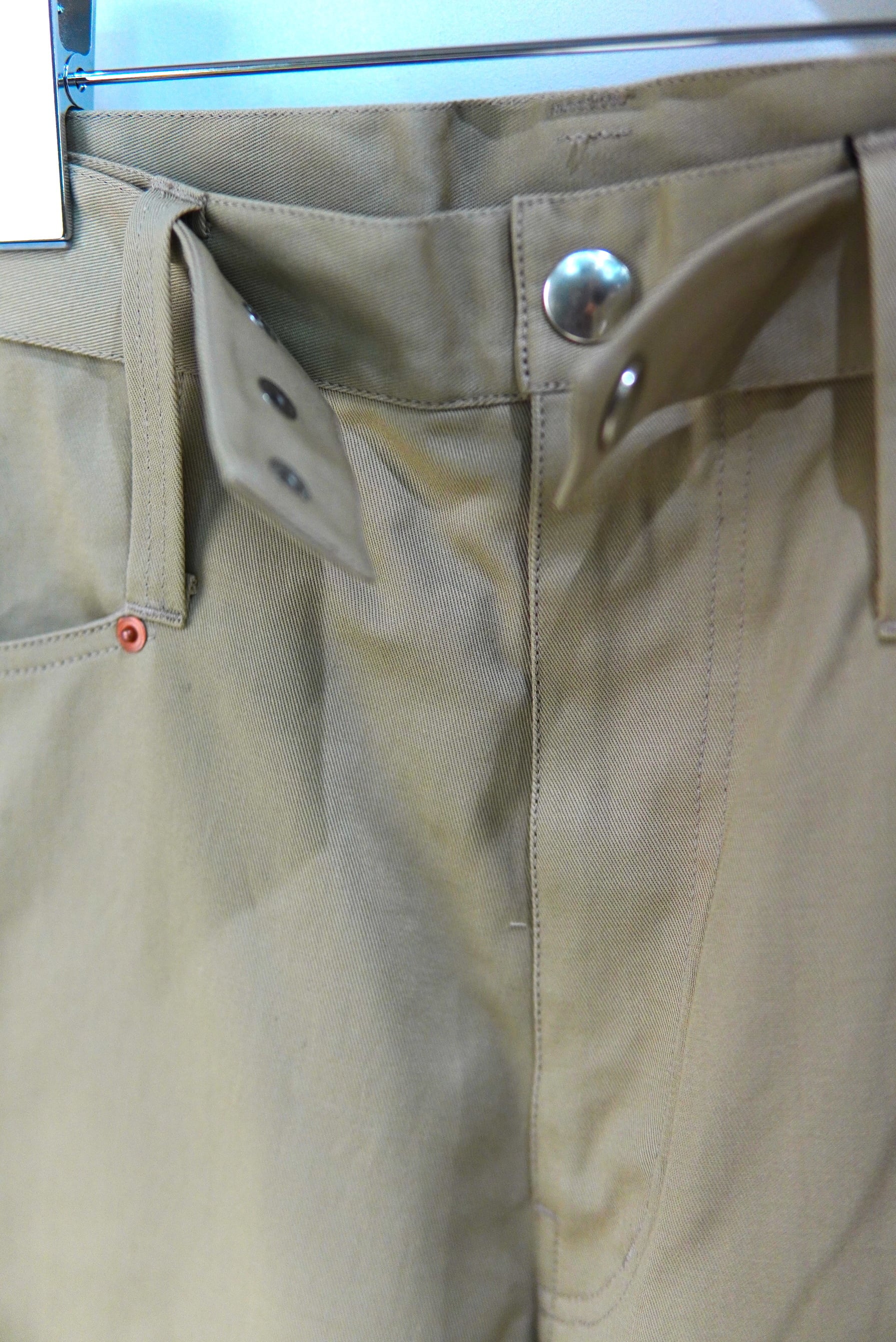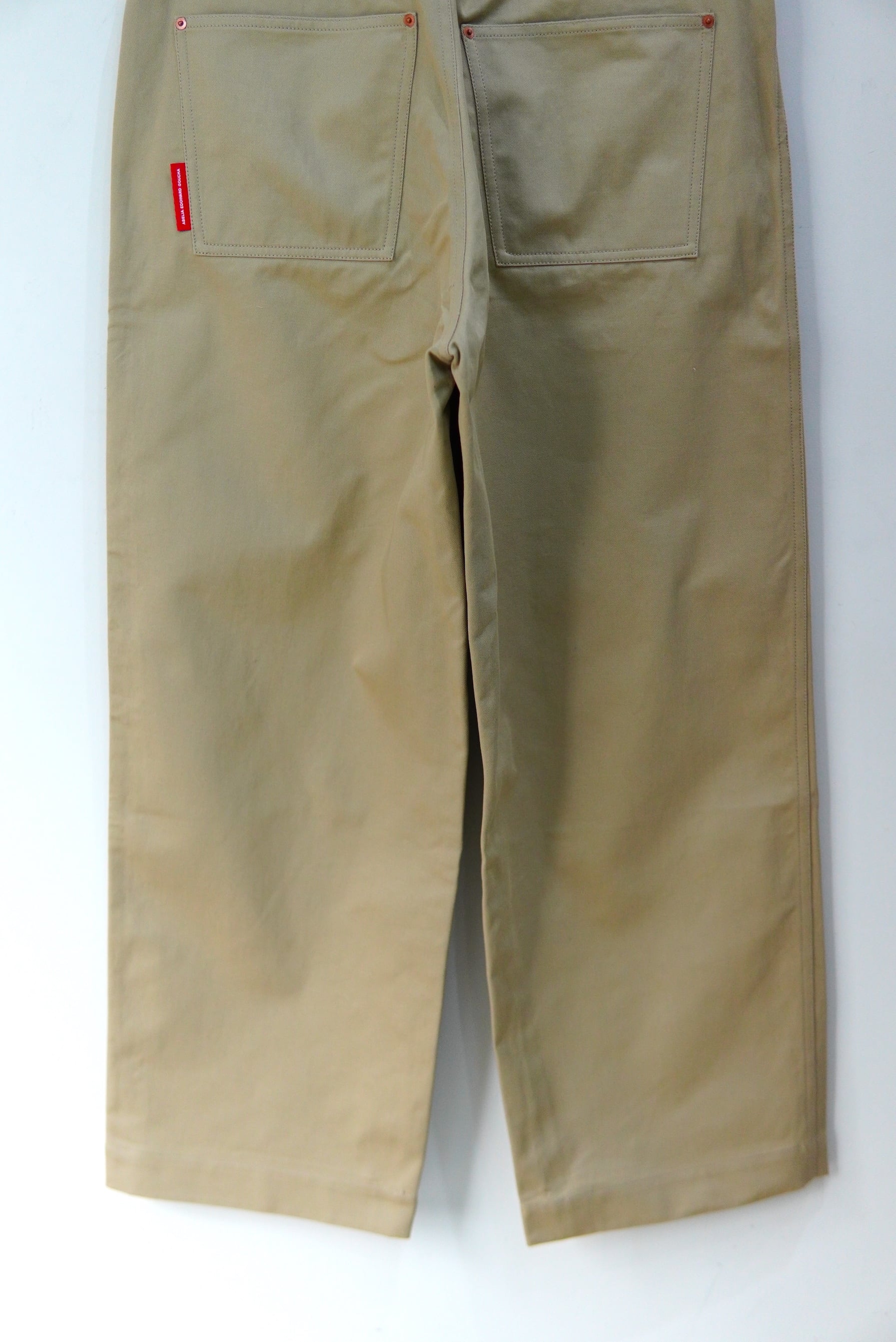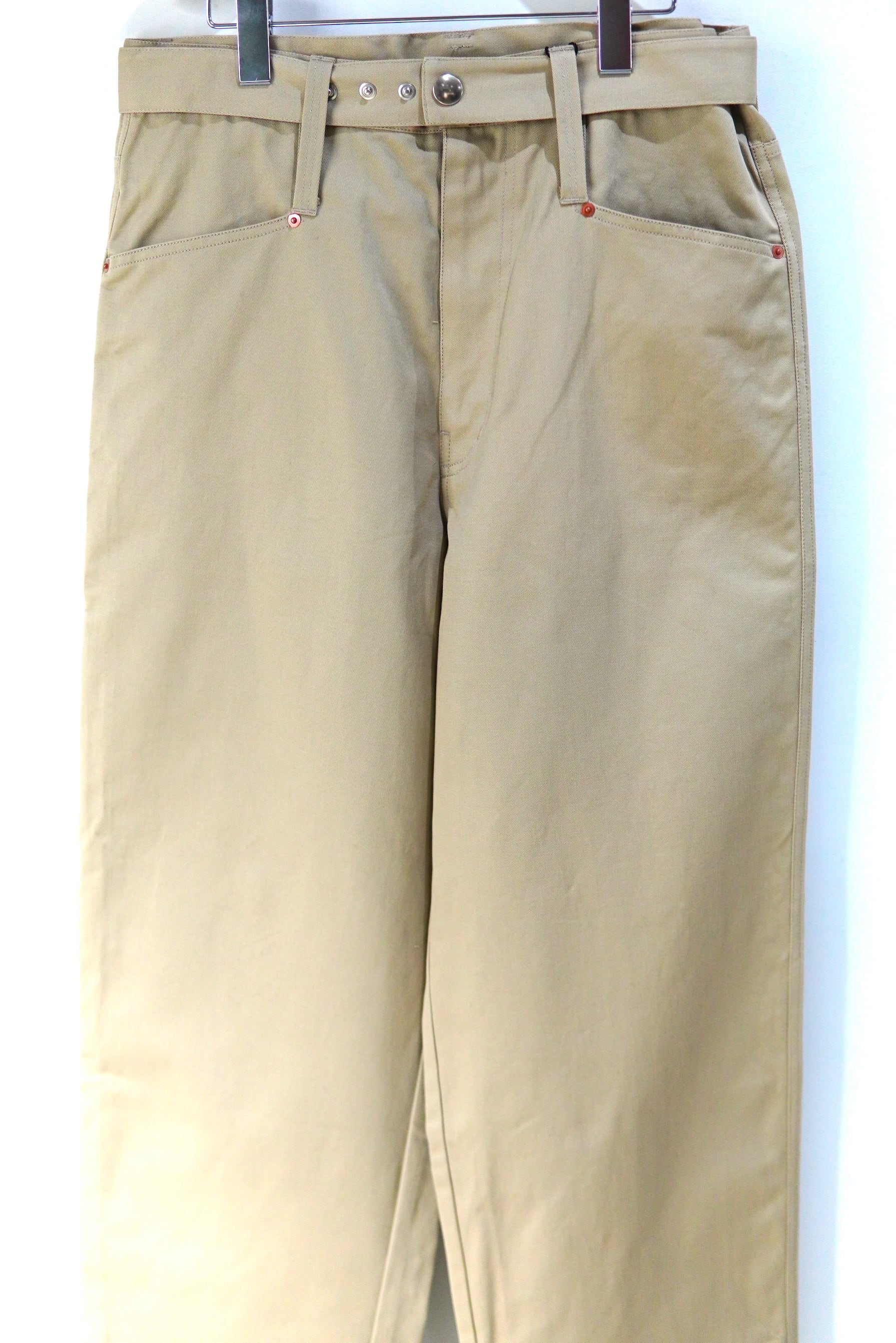Abelia Edoward Goucha / アベリア エドワード ゴーシャ ブランドの定番的な程よいワイドシルエットのチノ。 共生地のベルトが付属し、ベルトループを長めに設定しており、 ベルト位置を上下に変えて履いて頂けます。 MATERIAL 100% COTTON Size 3 ウエスト 86cm 股上 32cm 股下 72cm 裾幅 26cm