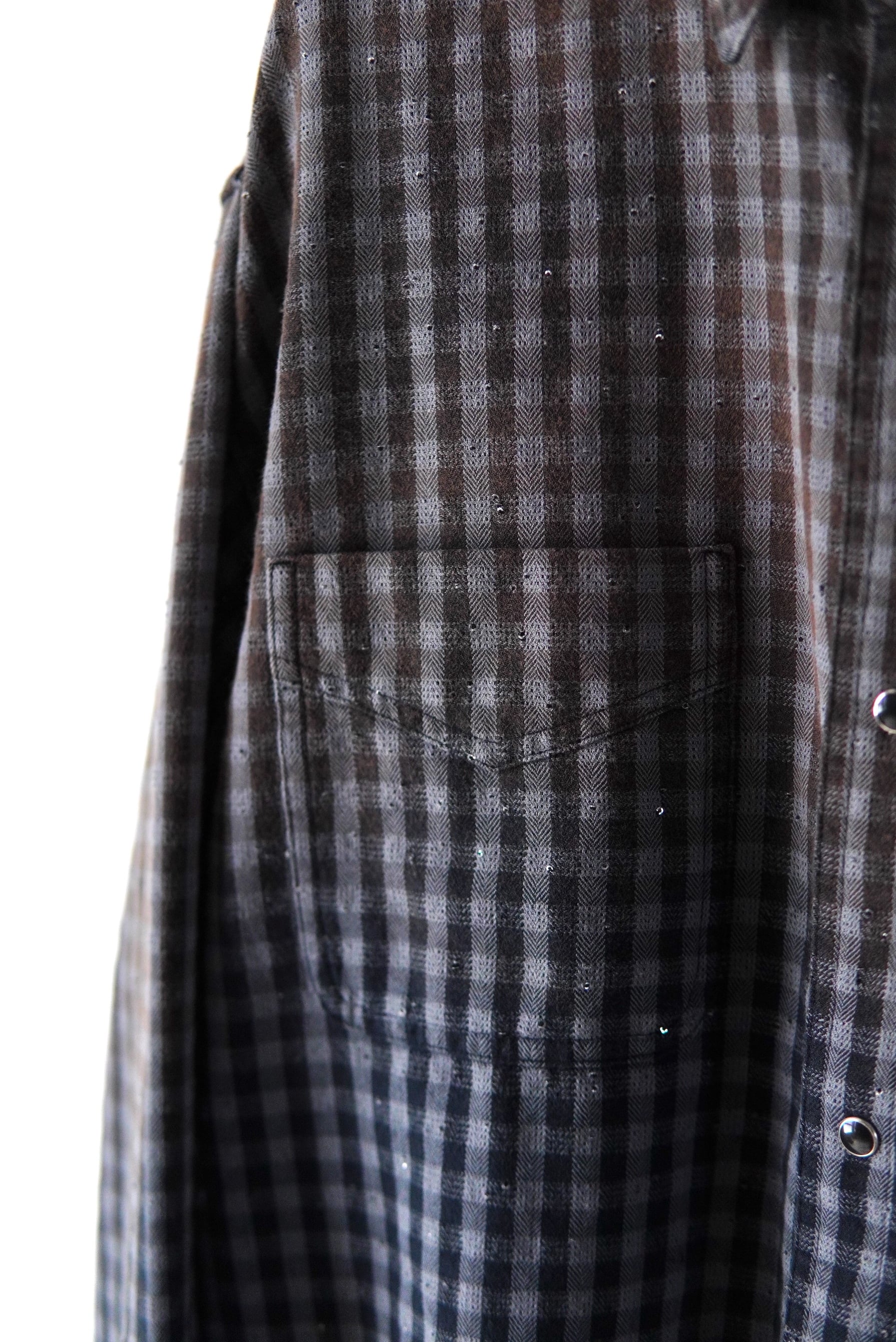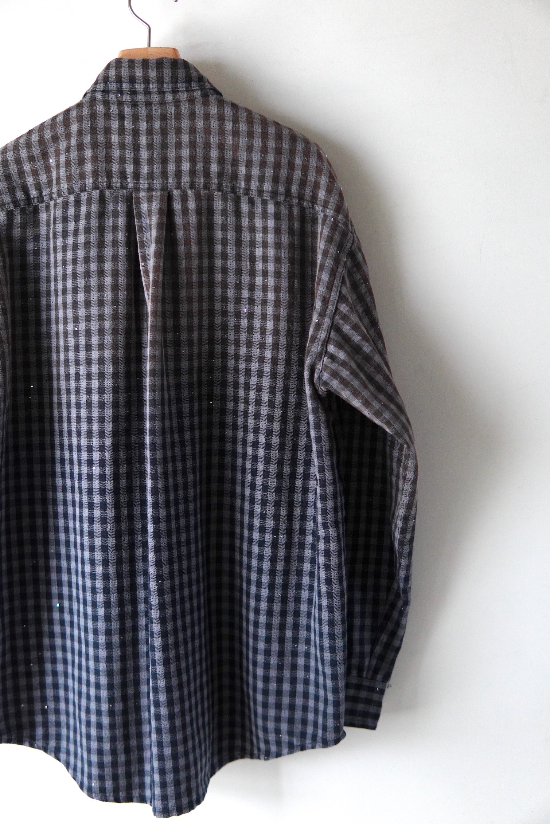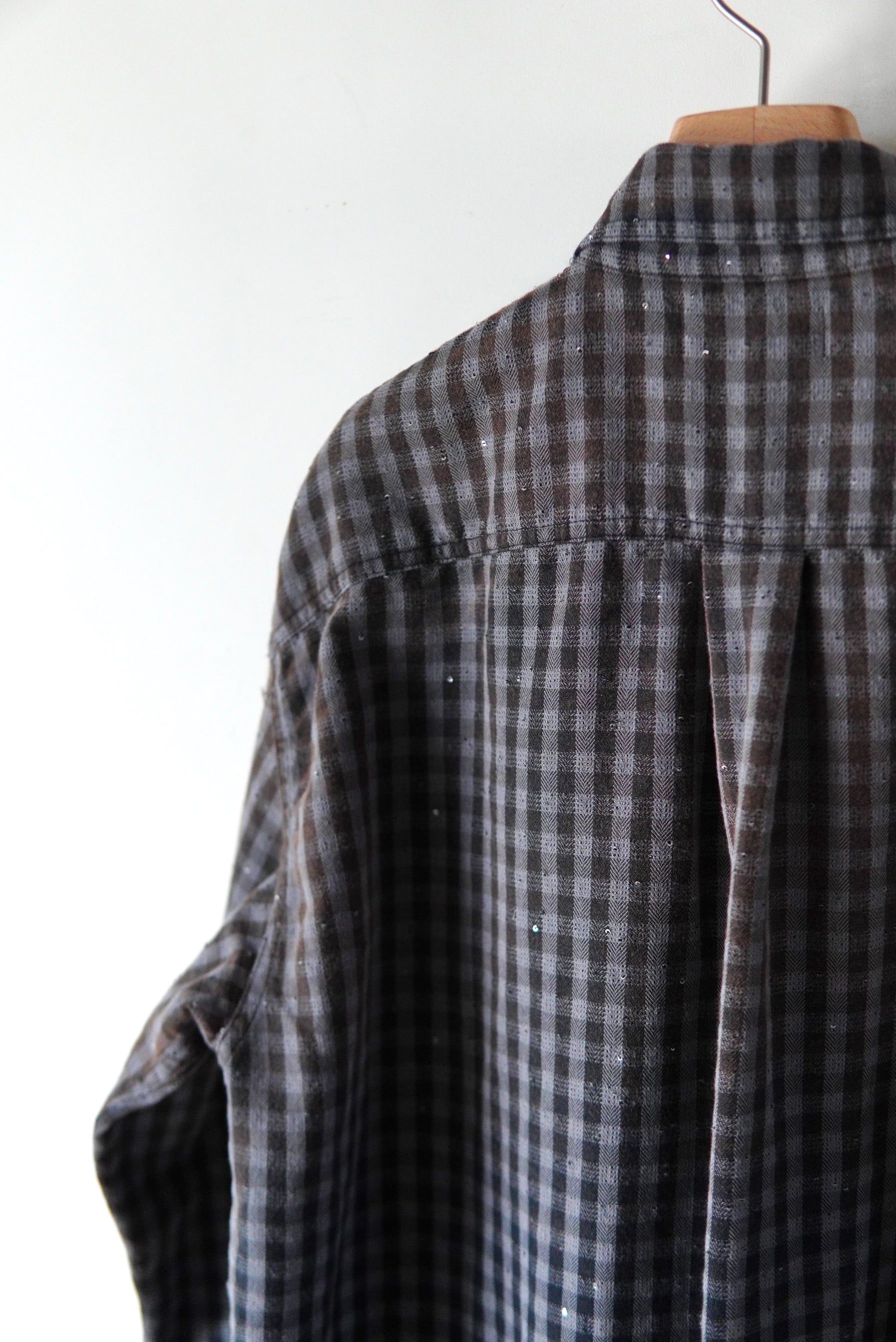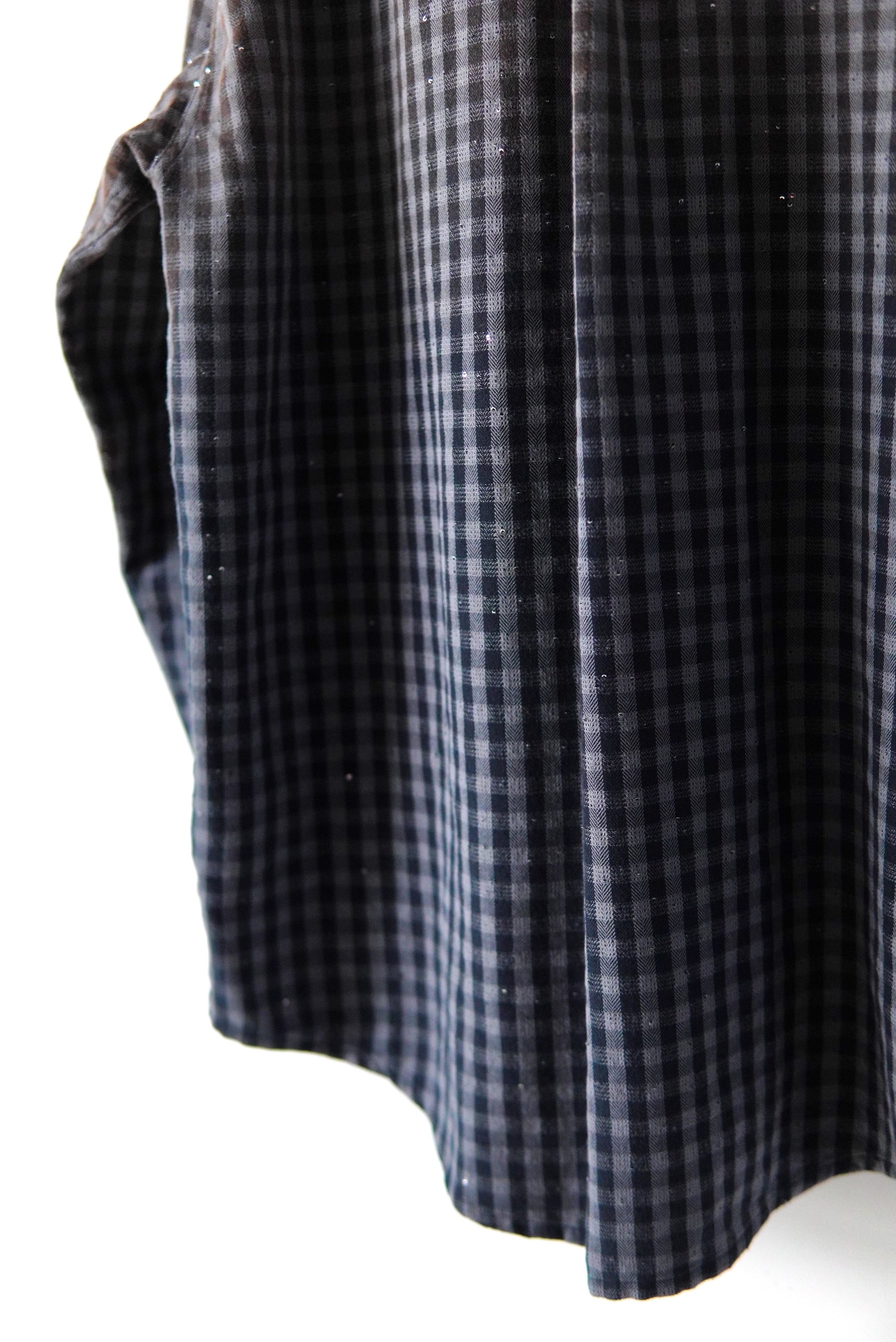 緯糸には細かなスパンコール糸が打ち込まれており、普遍的なギンガムチェックに、動くたびに光がこぼれるような煌めきを宿した。