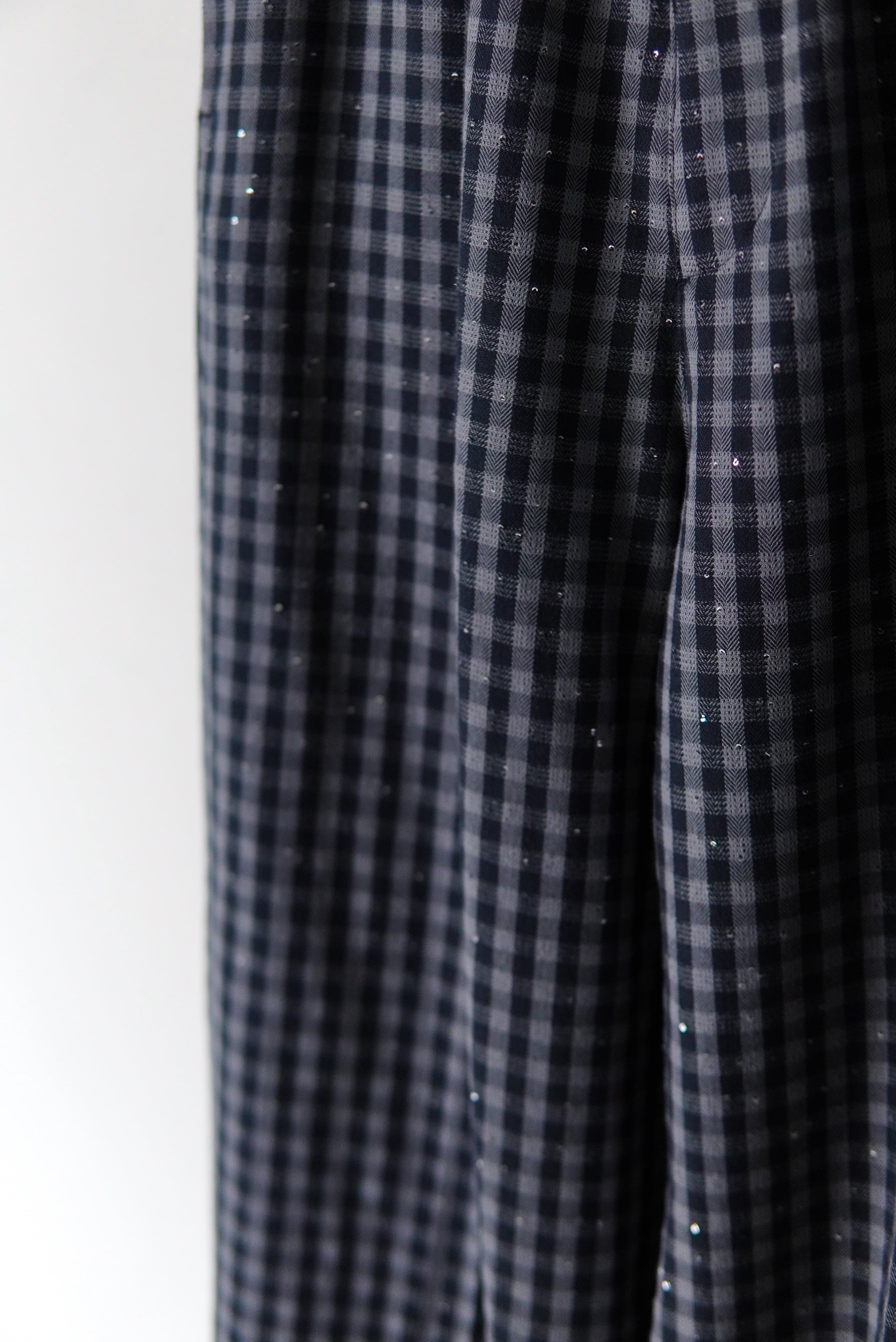 緯糸には細かなスパンコール糸が打ち込まれており、普遍的なギンガムチェックに、動くたびに光がこぼれるような煌めきを宿した。