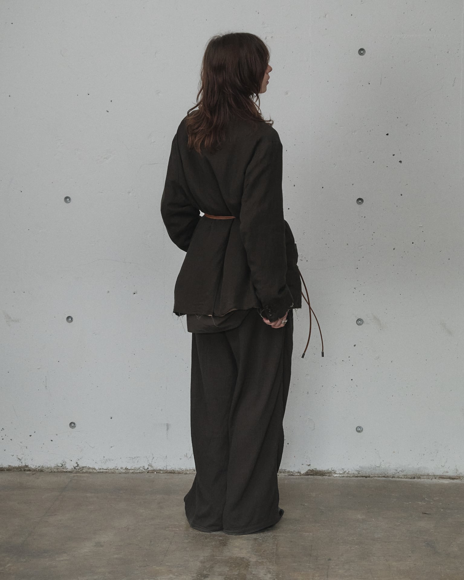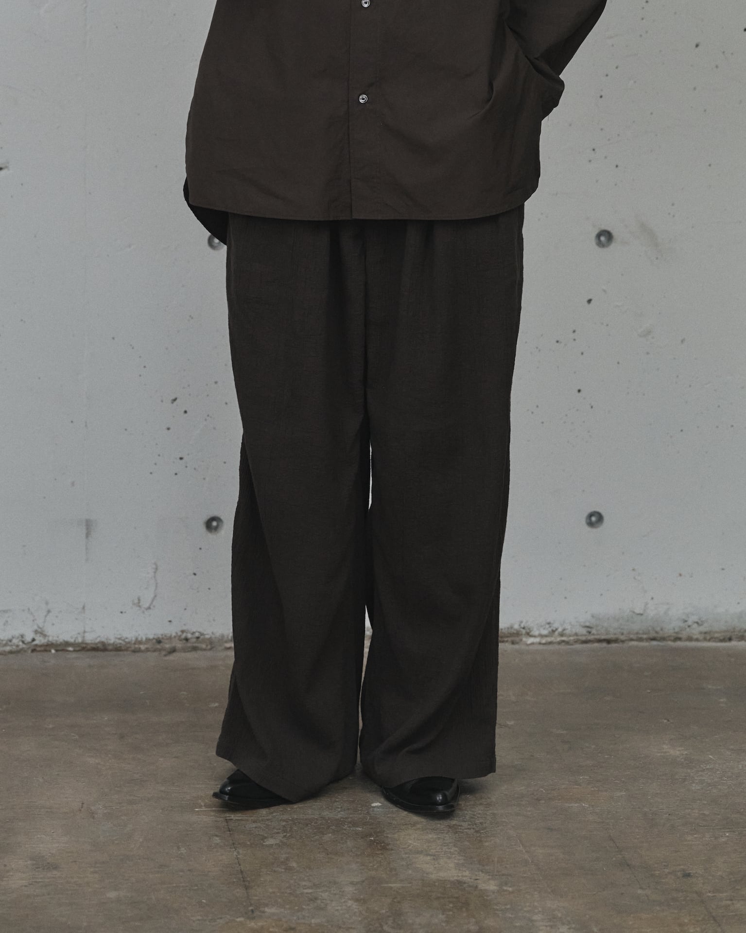 素材の風合いを頼りに生地分量を取ったワイドシルエットで構築し、
