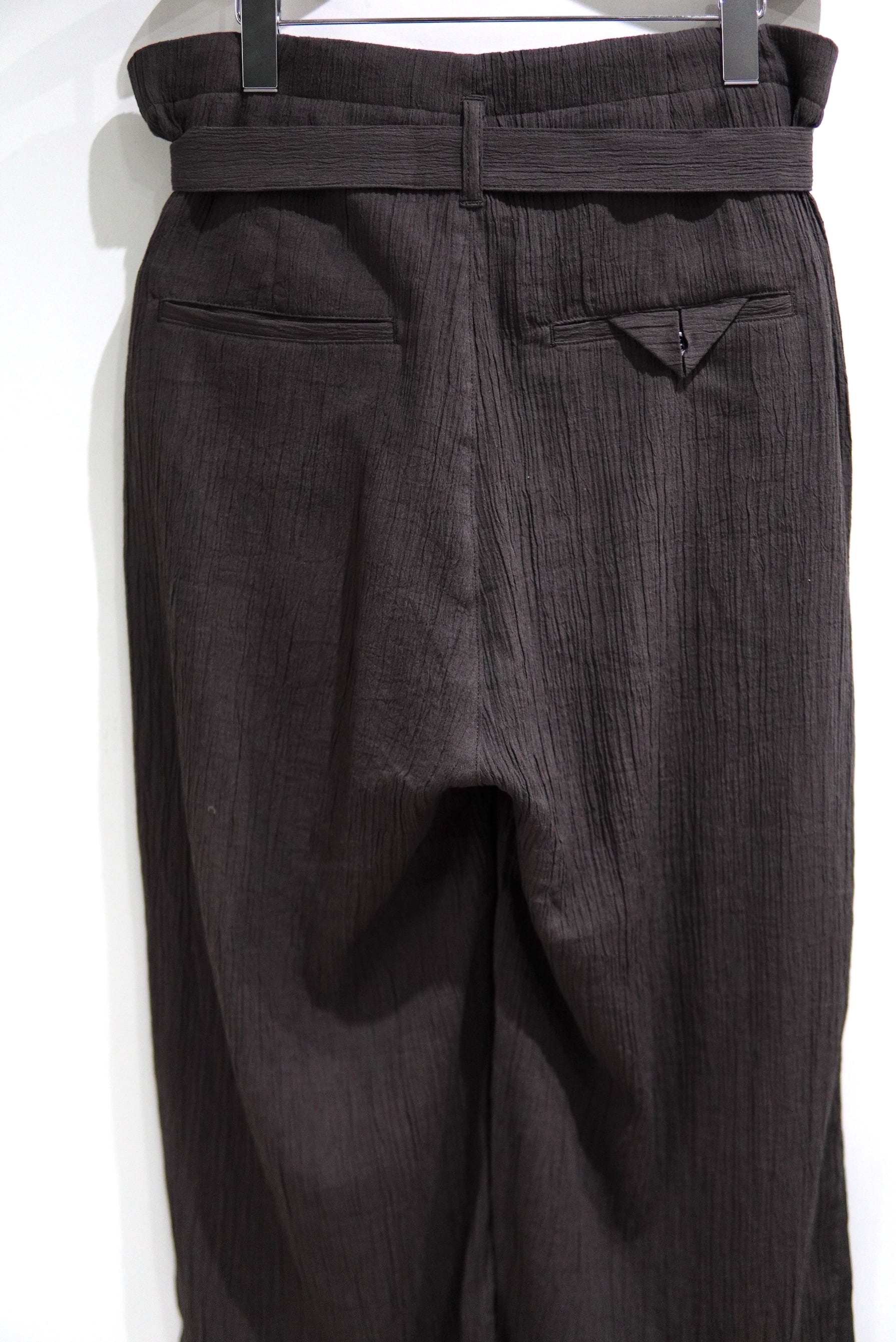 コットンリネンのクレープで製作した新型のベルテッドスラックス。