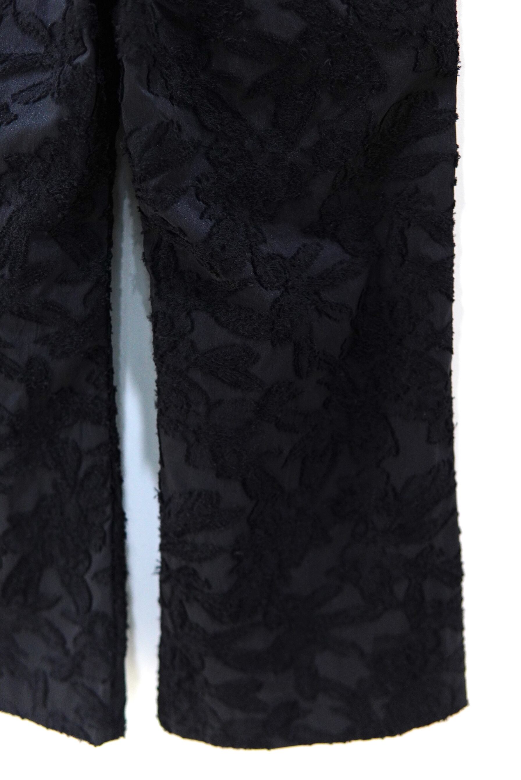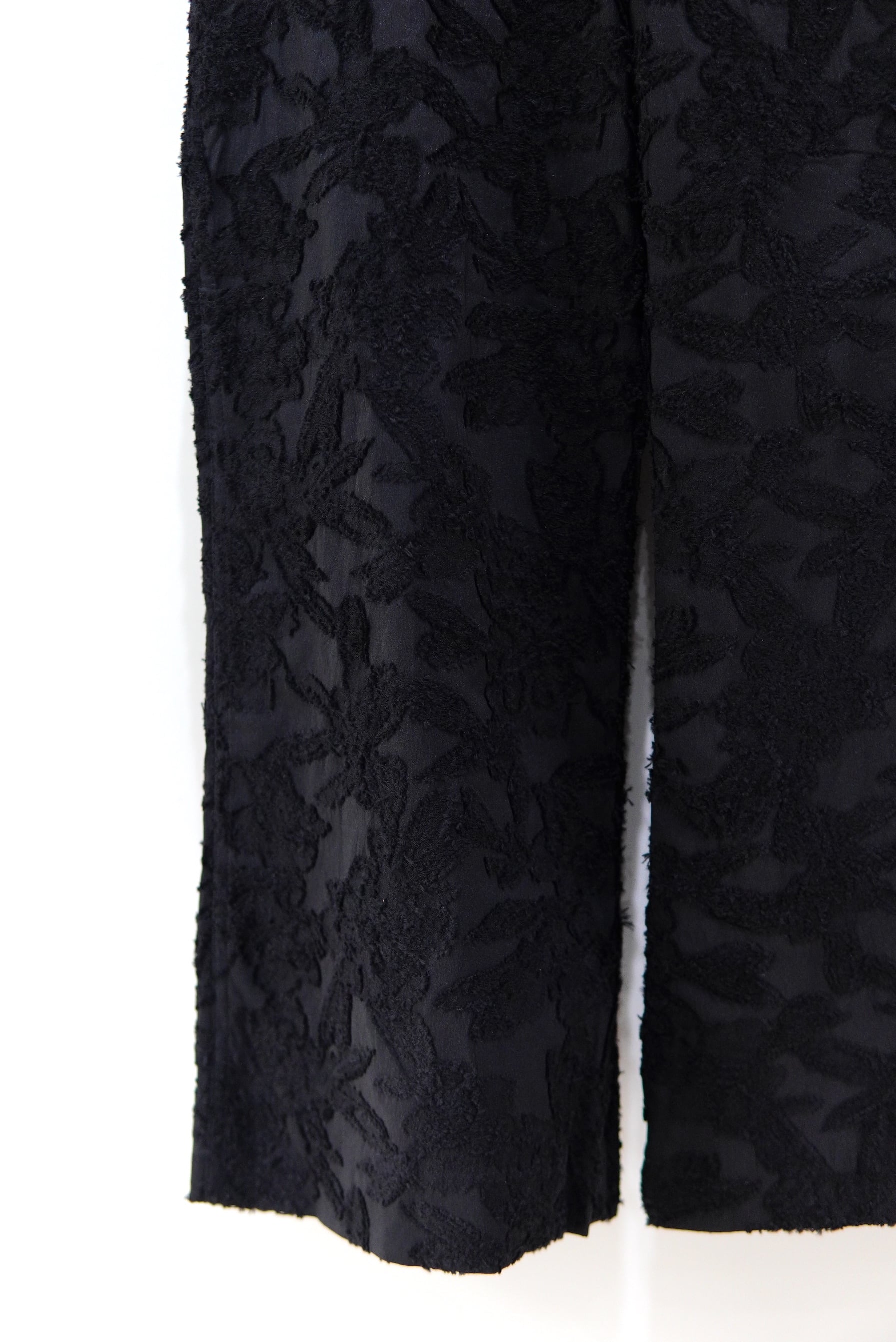 程よい緩さにハイウエスト、クロップドのフレアシルエットのイージーパンツ。 ファブリックはフラワーのジャガード素材ですが、程よく薄手です。 ブラウス、サンダルなどに合わせて秋まで長く着用して頂けます。 MATERIAL 37% Cotton, 35% Cupro, 28% Polyester サイズスペック SIZE 26 ウエスト 73cm (紐で絞れます) 股上 27cm 股下 63cm 渡り 30cm 裾幅 29cm