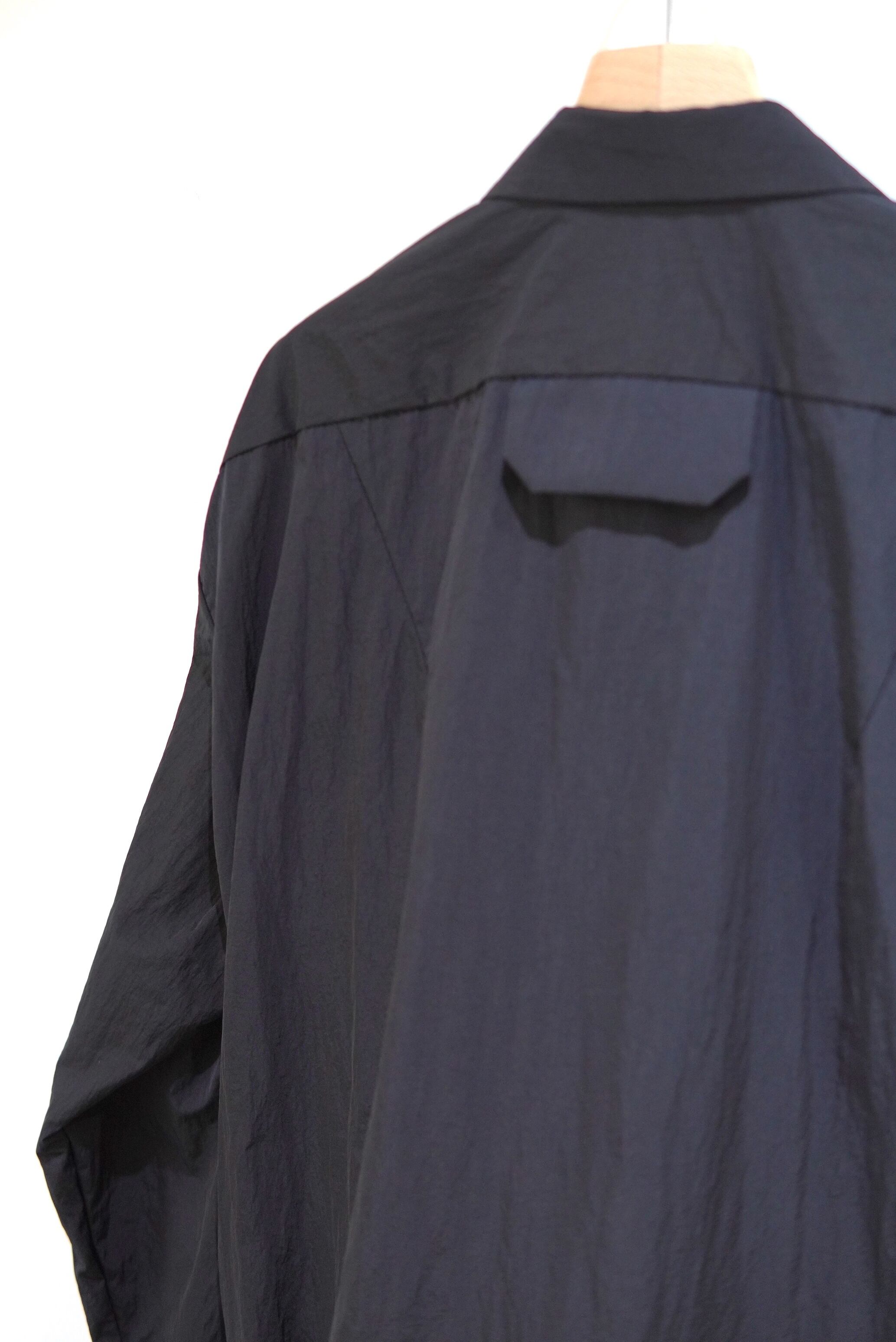 特殊加工により化繊感を軽減しヴィンテージの様なシワを表現したメタリックなナイロンタフタを、アノニマスなレギュラーカラーシャツに仕立てました。