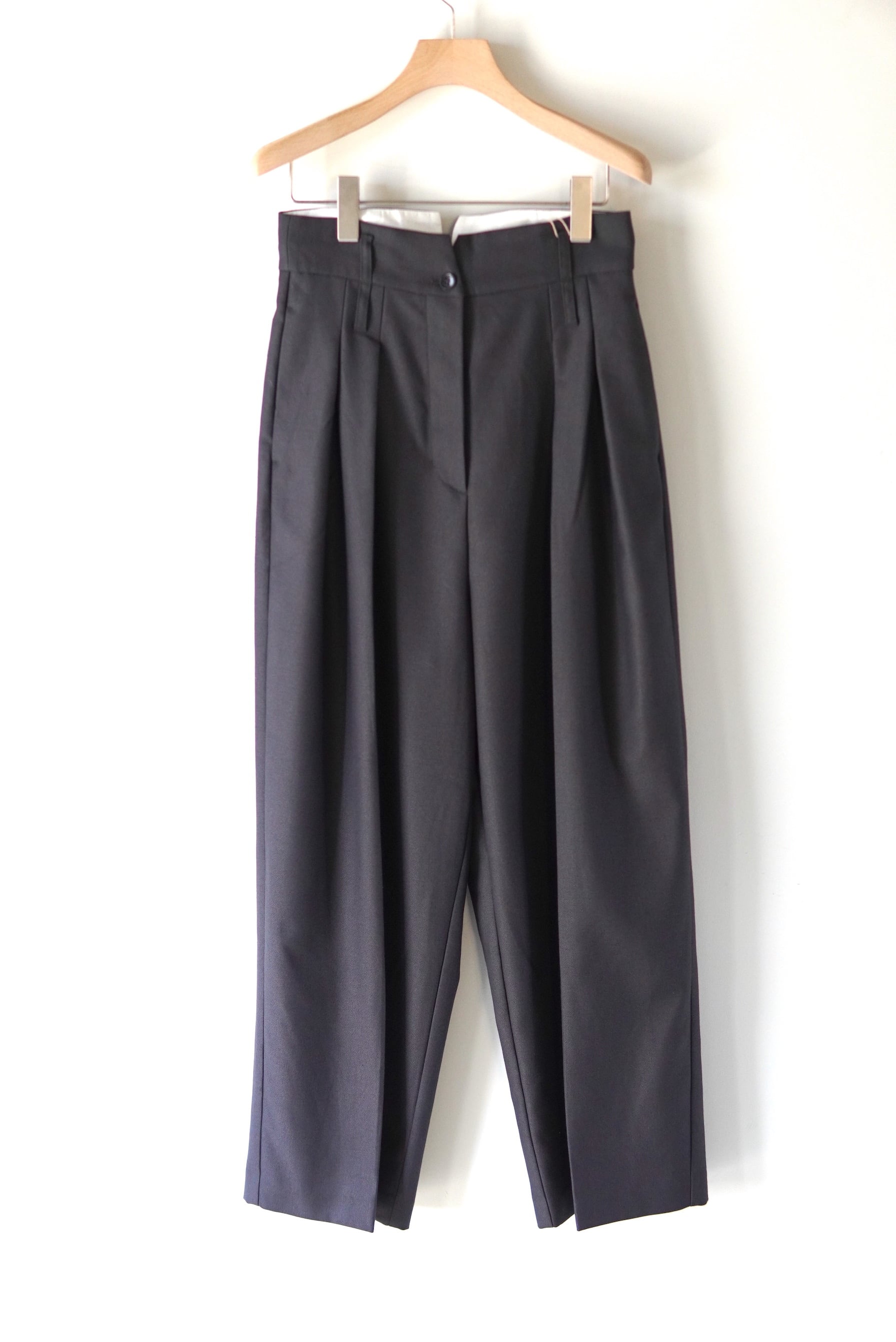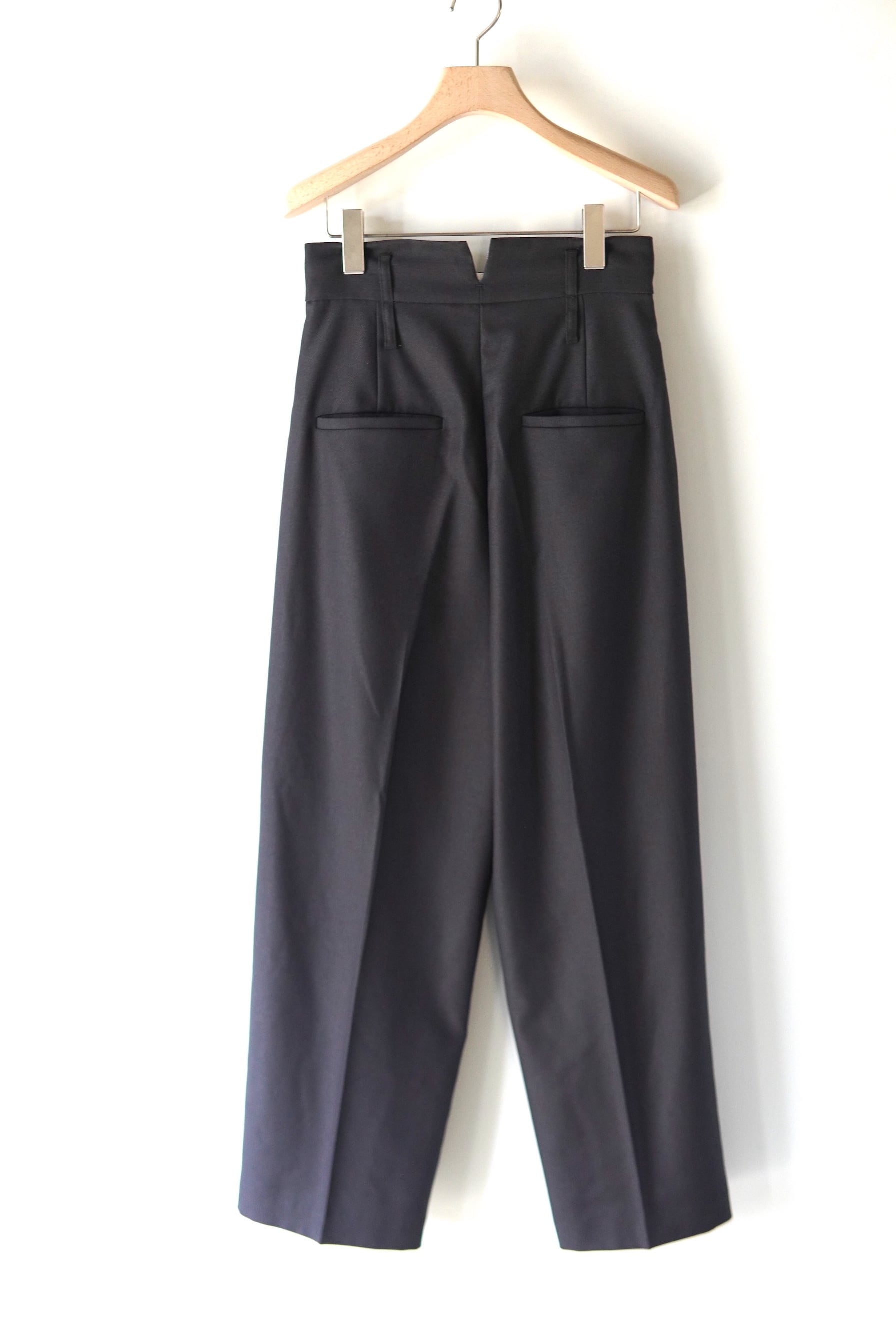 梳毛ウールミックスのツイルを使用したワイドシルエットのスラックス。ウエストベルトの裏がマーベルト仕様になっているのでベルトを折り返しても着用して頂けます