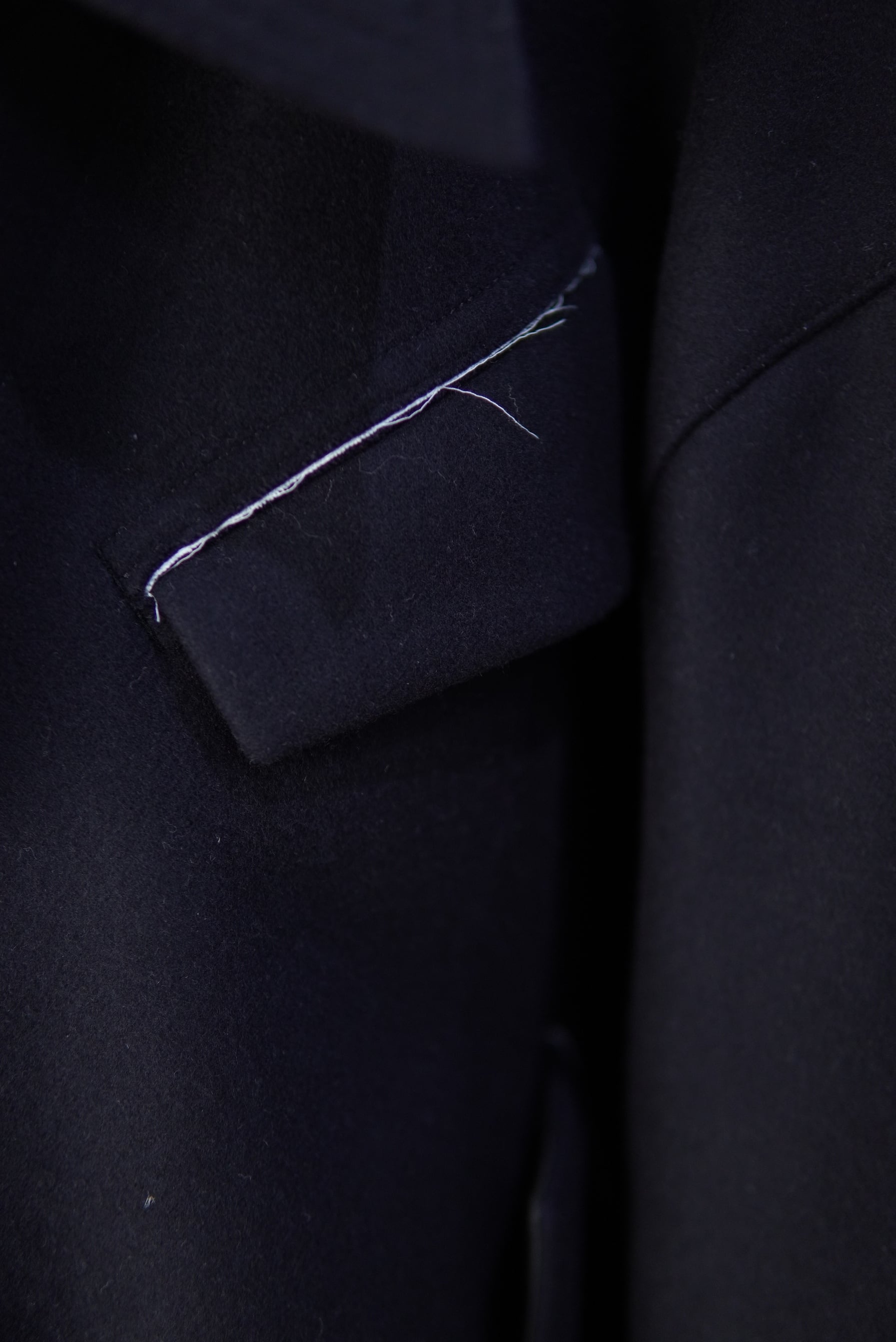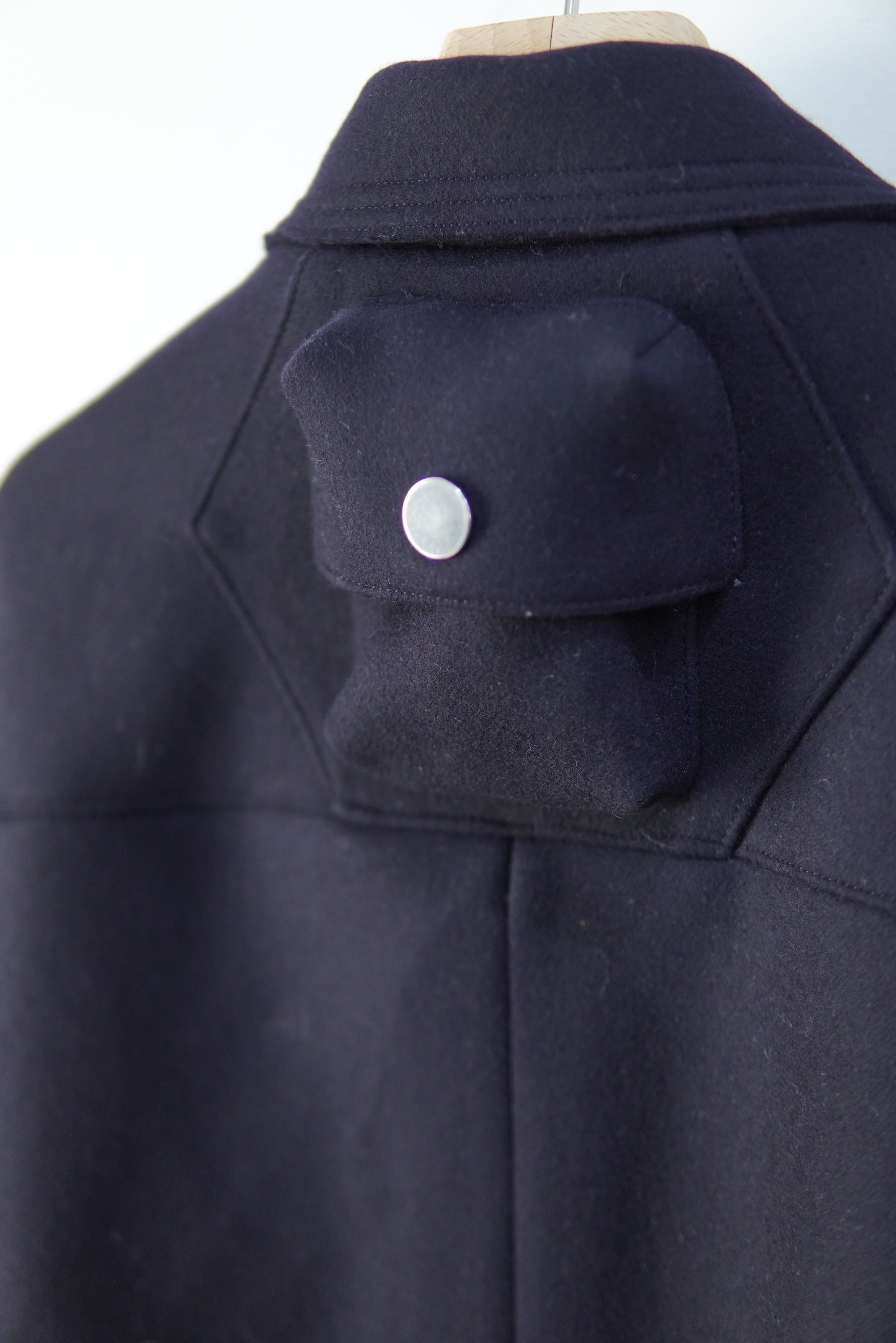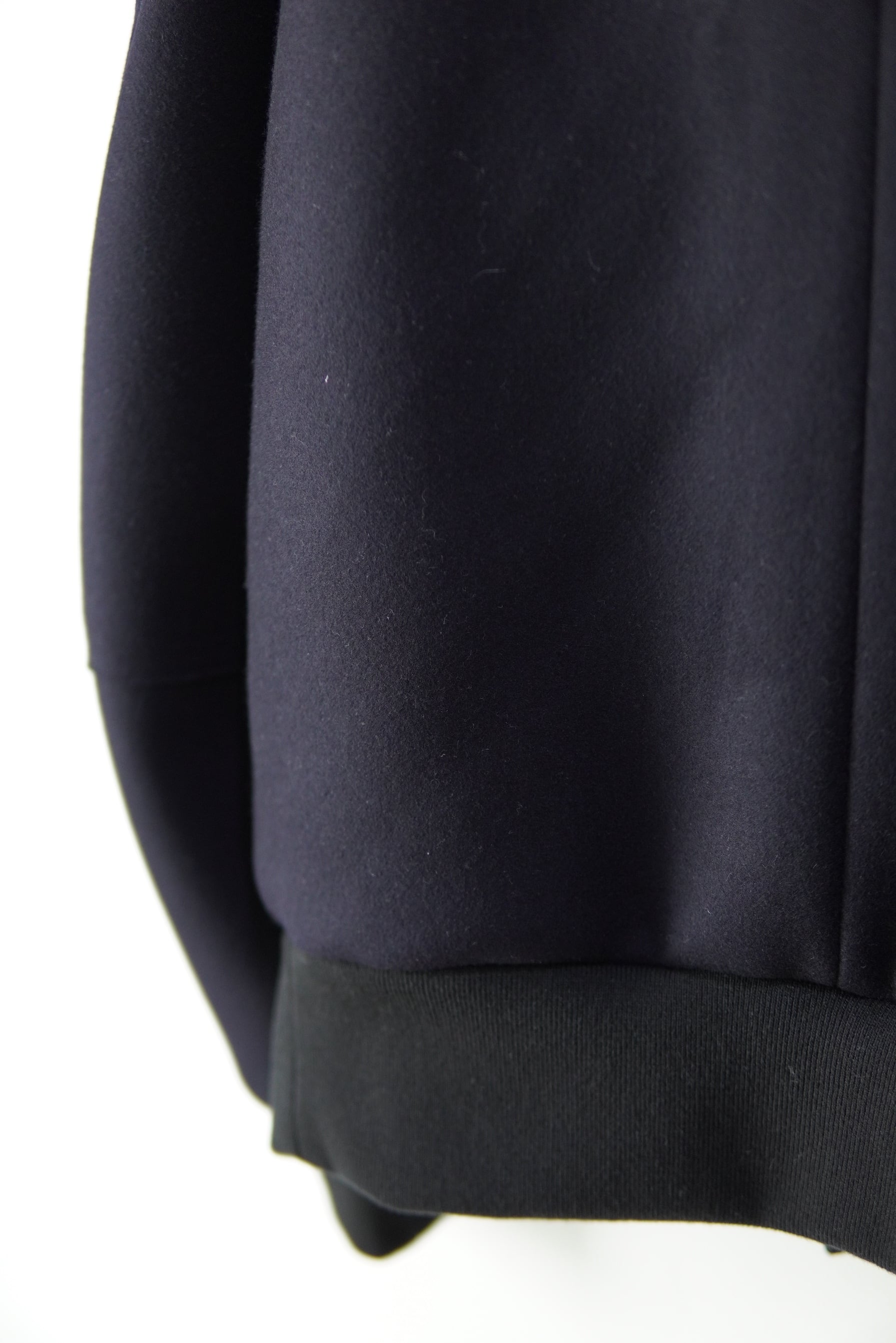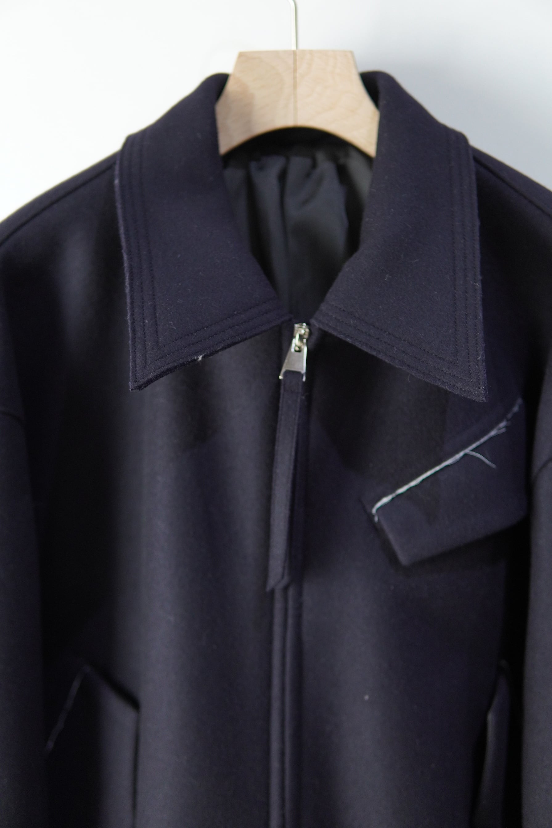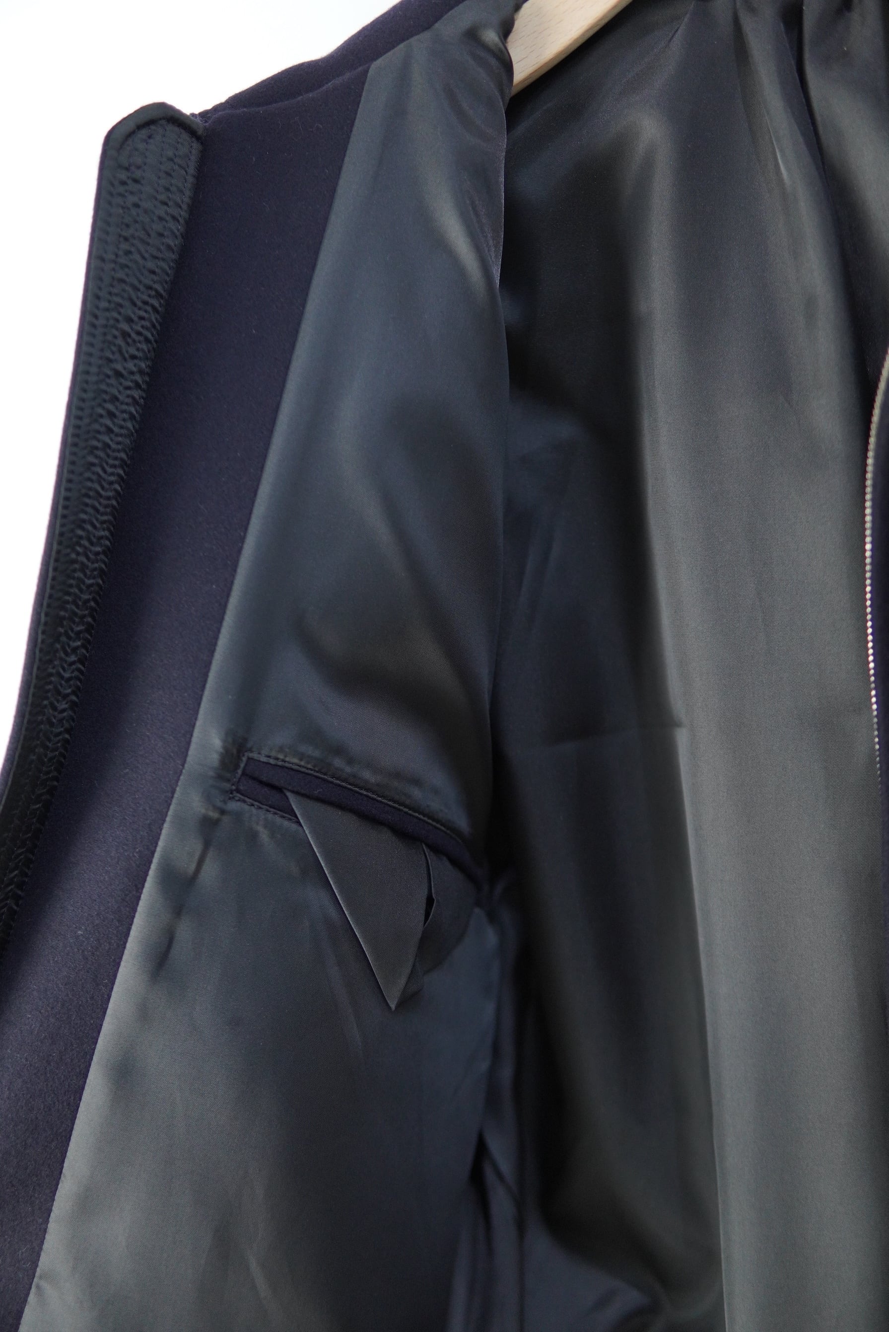 カシミアと同等の繊維長であるSUPER180'sの原料を、一宮でオフスケール加工を施し肉厚な二重織にした後、泉大津にて深海のような深い深いネイビーに染め上げています。